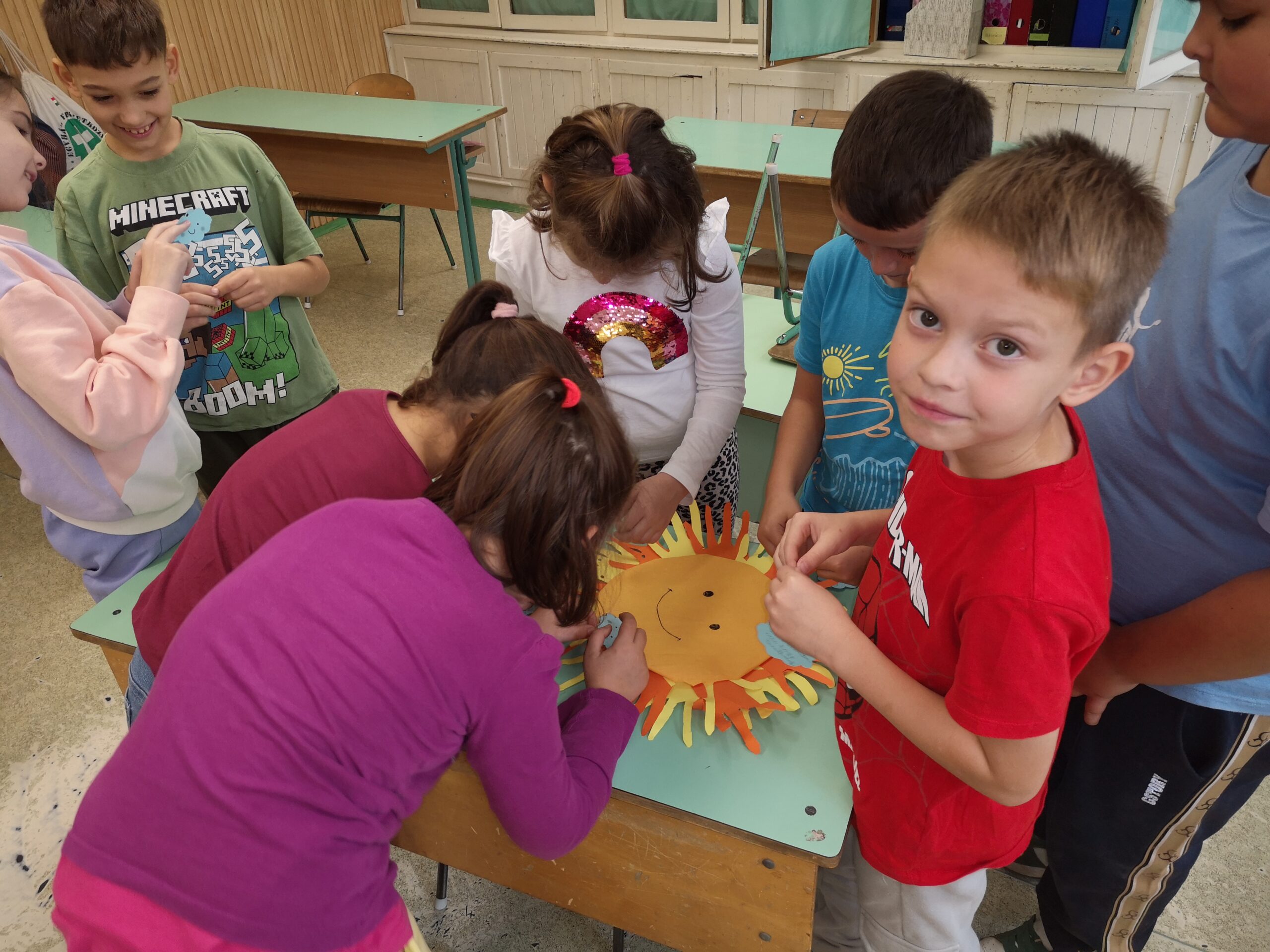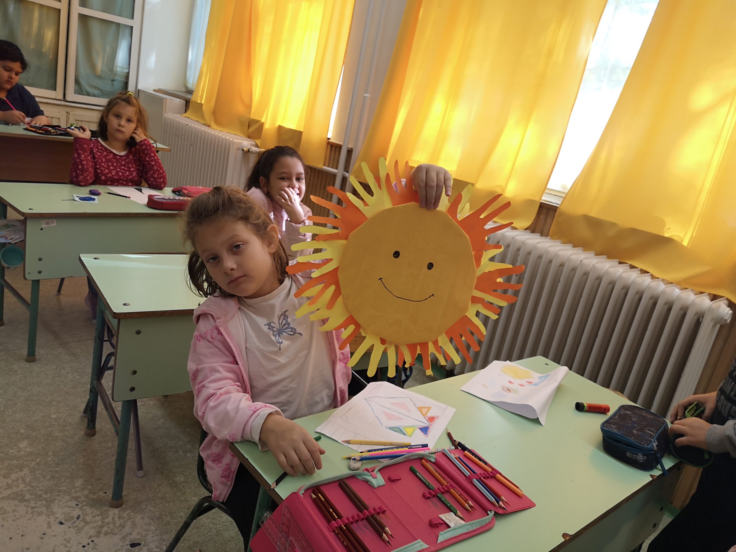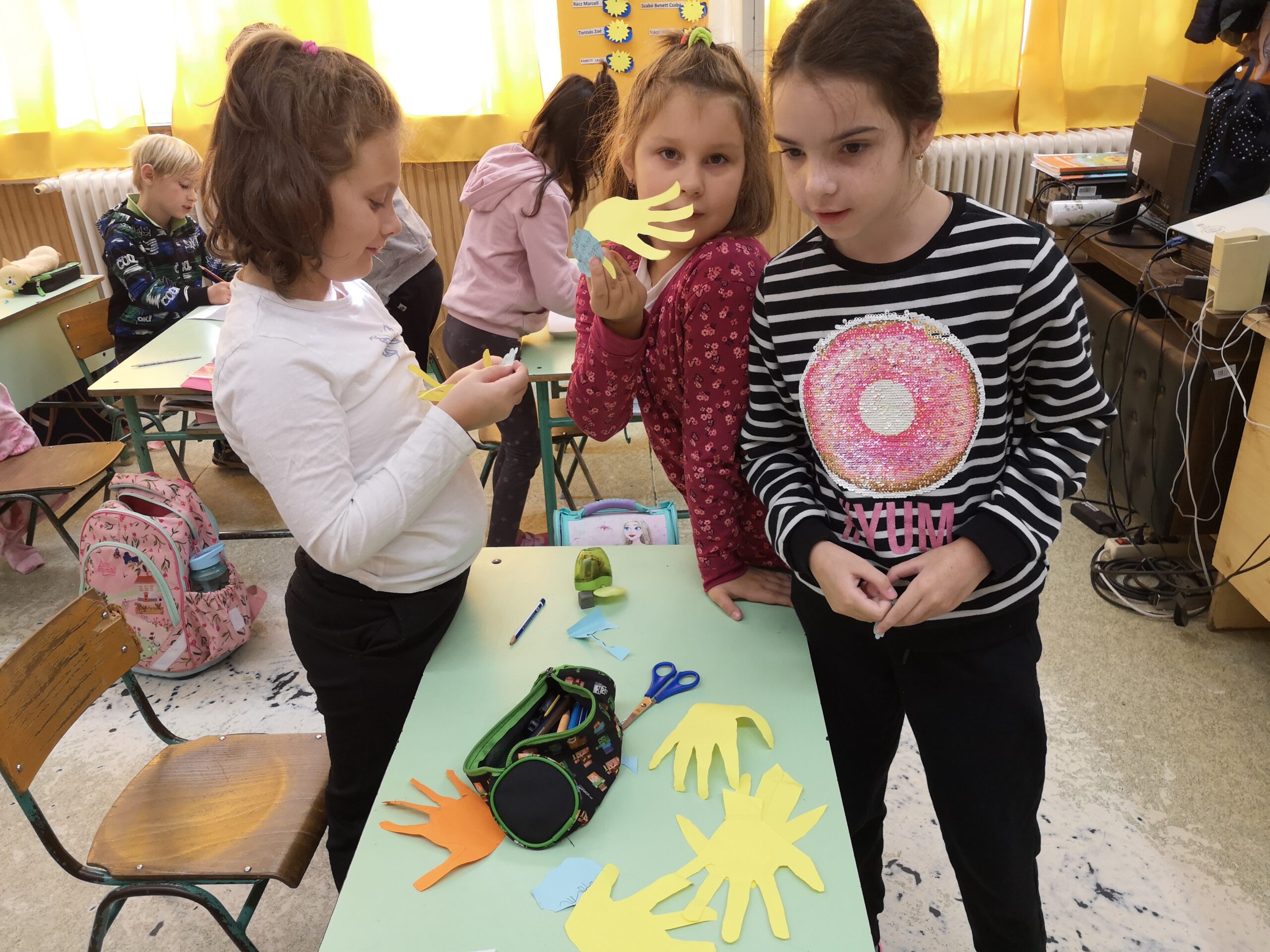 • Sárga kartonból napot készítünk, a nap sugarai a gyerekek tenyerei: körbe rajzolják, kivágják.