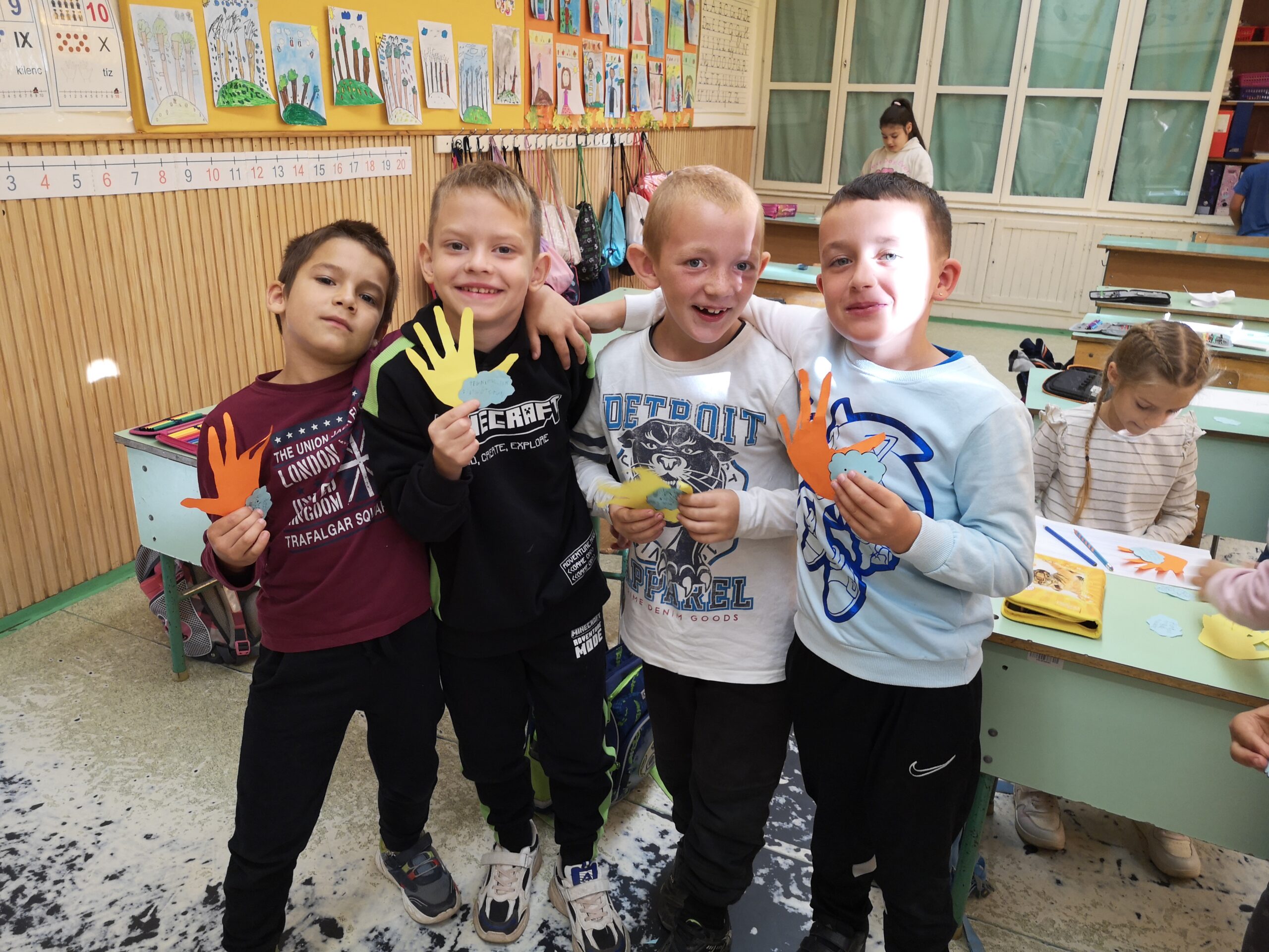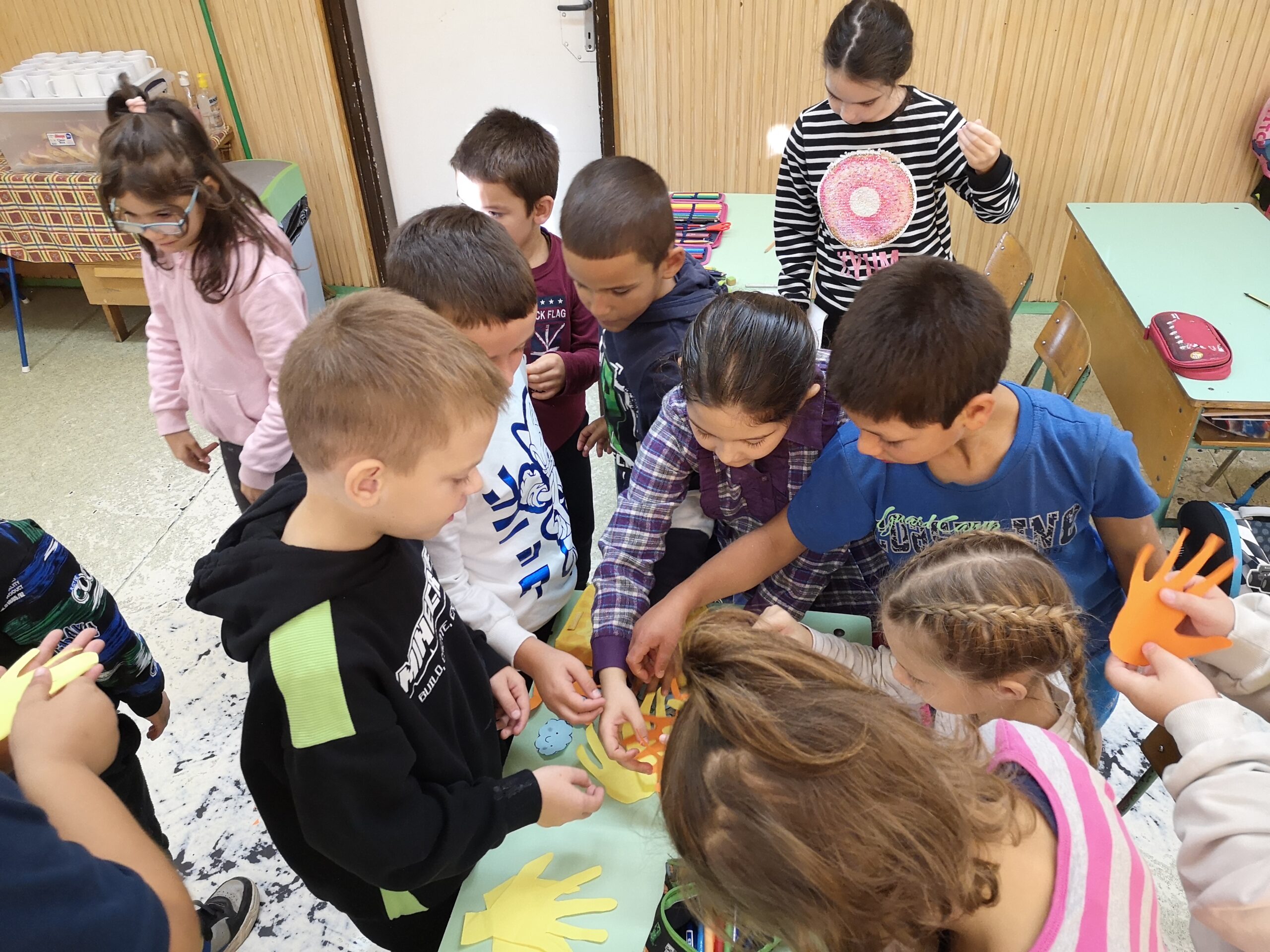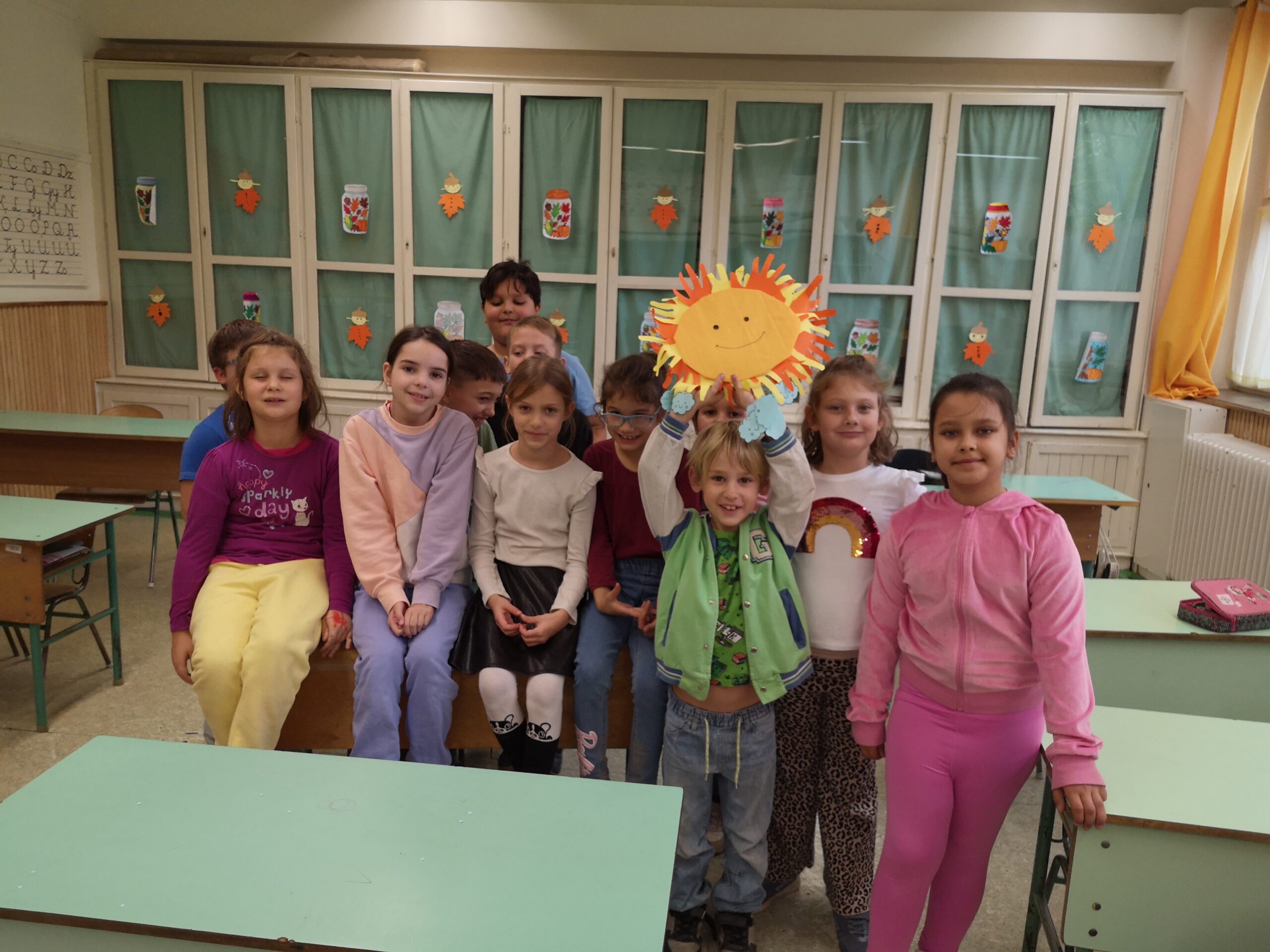 • Sárga kartonból napot készítünk, a nap sugarai a gyerekek tenyerei: körbe rajzolják, kivágják.