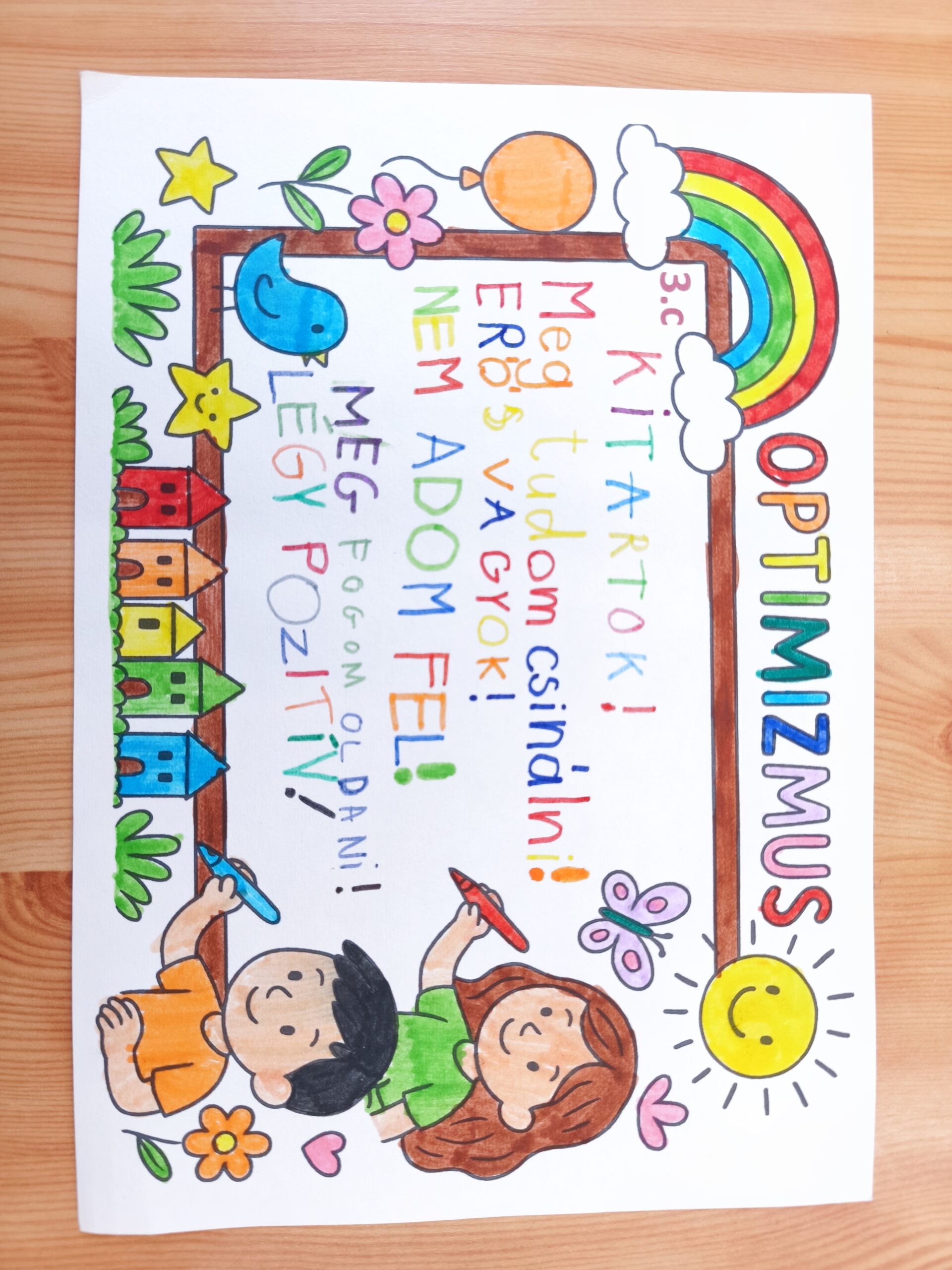 Ebben a hónapban az optimizmus témájával foglalkoztunk. Célunk volt, hogy mindig pozitívan gondolkodók legyünk. Tisztáztuk a pesszimizmus és az optimizmus fogalmát. Többször beszélgettünk arról, hogy mennyivel jobb a pozitív hozzáállás az életben, mint a pesszimista látásmód. Tudatosítottuk, hogy próbáljuk meg mindenben a jót, a pozitívumot keresni. Az Állatok világnapja alkalmából izgalmas előadáson vettünk részt a pécsi állatkertben, majd lehetőségünk volt sétálni, nézelődni az állatok között. Az ölelés világnapja alkalmából pedig alaposan megölelgettük egymást. A program által ajánlott nevezetes napok közül „A fehér bot napjával” foglalkoztunk részletesebben. Ezen a napon a vakok és gyengénlátók sajátos helyzetére hívják fel a figyelmet. A gyerekek bekötött szemmel különböző feladatokat, akadályokat teljesítettek, közben megtapasztalhatták, milyen nehézségekkel kell szembe nézni látássérültként. A program célja a szemléletformálás és érzékenyítés volt.