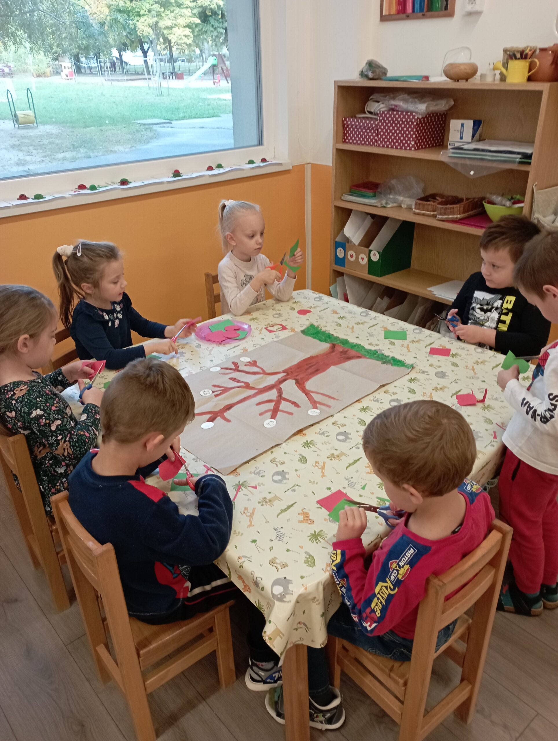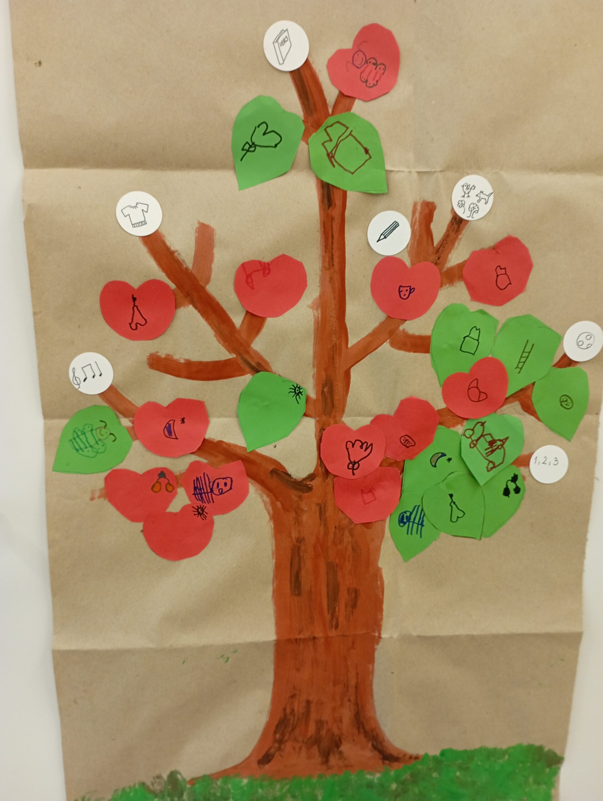 Az elmúlt hetekben az őszi gyümölcsökkel ismerkedtünk, így az „Értékeim Fája” egy almafa alakját vette fel. A nagyobbak önállóan vágták ki a levelet és az almát. Az almafa ágaira segítségként különböző területek logóját ragasztottam: öltözködés, éneklés, versmondás, számolás, rajzolás, sportolás…stb. A gyerekek kiválasztották, hogy szerintük miből a legjobbak és odaragasztották a levelet és az almát. Érdekes volt megfigyelni, hogy a tanköteleskorú gyerekek a számolást, a kisebbek az öltözködést választották.