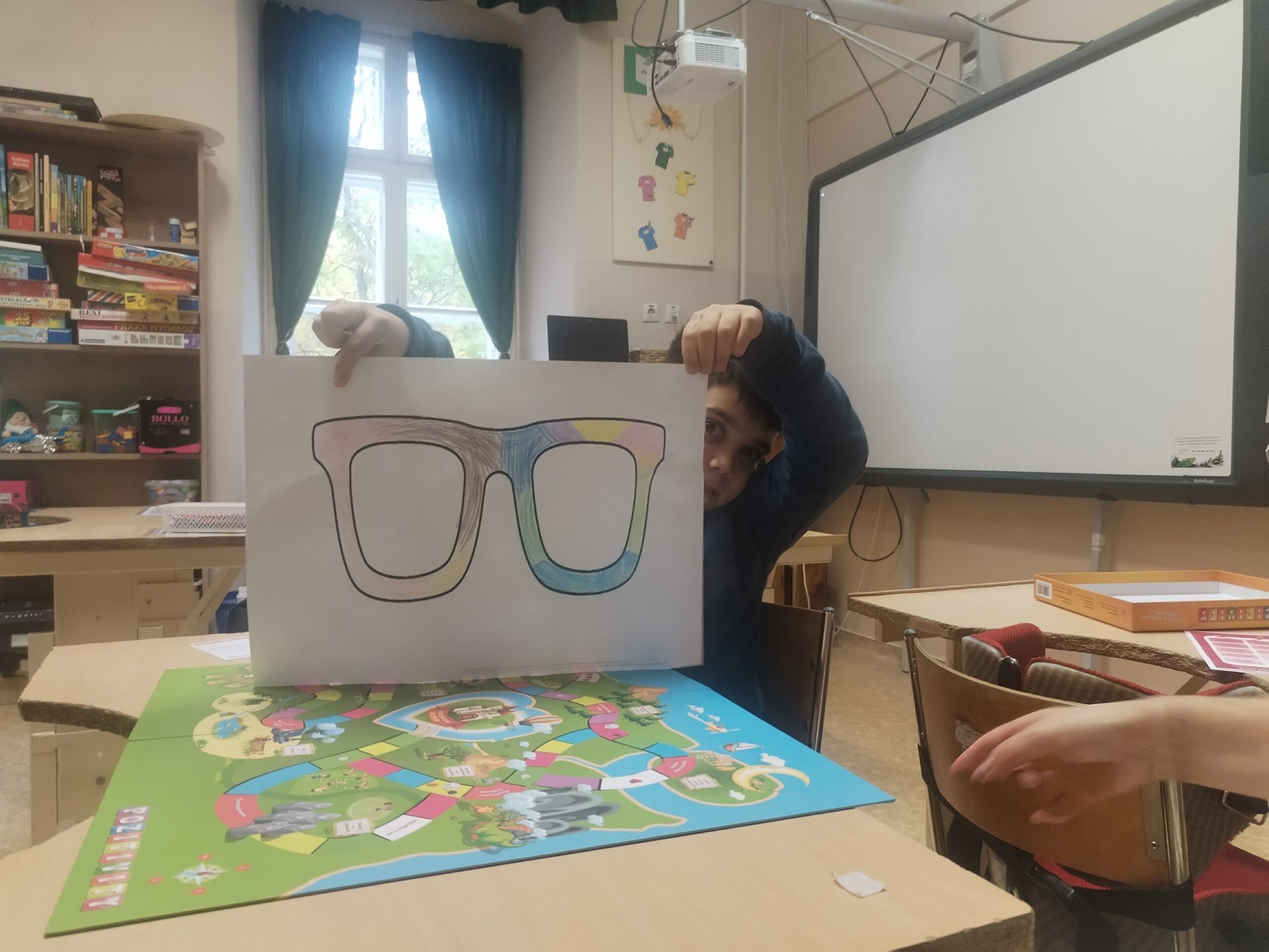 A történetet megbeszélve a gyerekek egy nagy optimista látásmódot szimbolizáló szemüveget színeztek ki, olyan színűre, amilyenre szerették volna. Közben a Pozitív gyerek vagyok gyerekdalt hallgattuk.