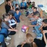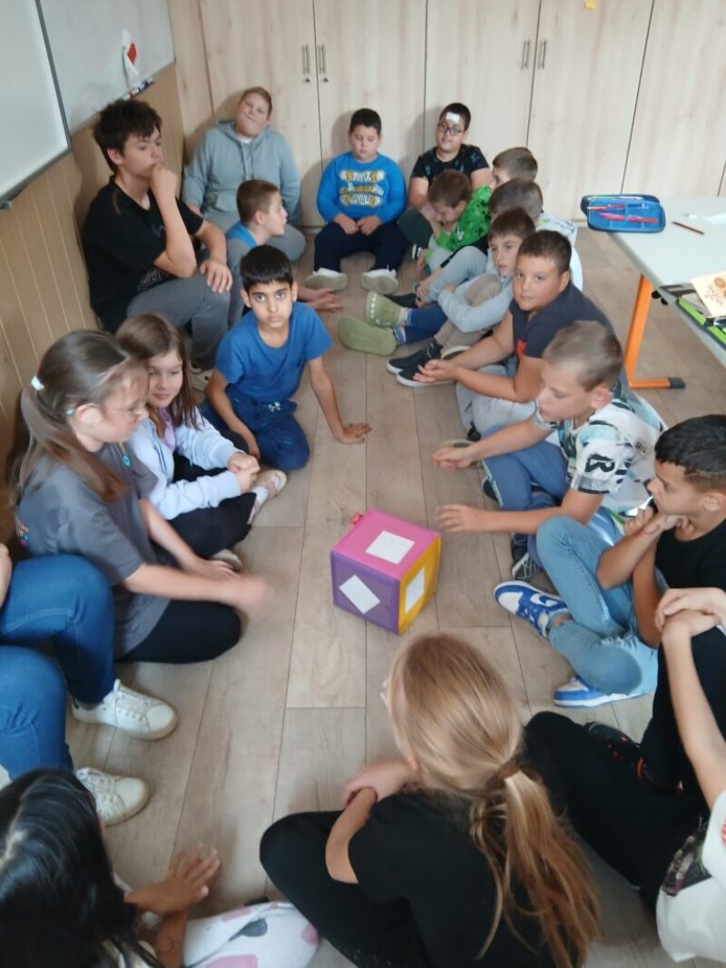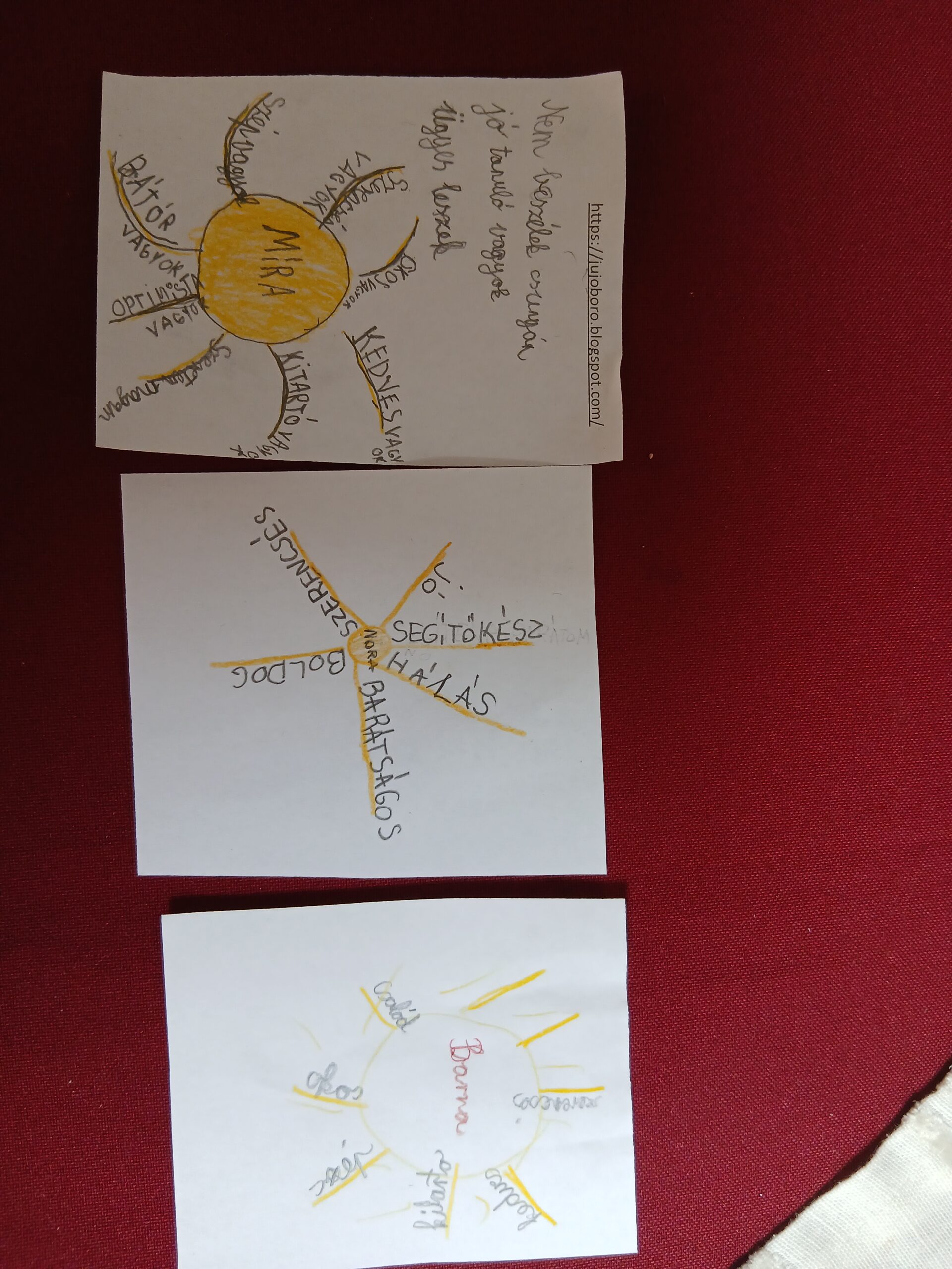 Boldogságóránkat a „jó dolgok naplójával” kezdtük. 3 dolgot kellet írniuk a tanulóknak, amelyek az elmúlt napokban történtek velük. A táblára kitéve megbeszéltük a leírtakat. „Mi lehet jó ebben?” című feladatunkban kellemetlennek tűnő helyzeteket mondtam a gyerekeknek. Nekik „át kellett keretezniük”, azaz meg kellett magyarázniuk , hogy mi lehet ebben mégis jó? Az „Optimista-pesszimista szemüveg” játékban két csapat játszott egymással. Itt szintén különböző helyzeteket kaptak a csapatok. Az opimista csapat pozitív szemmel nézte a helyzetet, a pesszimista csapat pedig negatív szemmel. Választ kerestünk arra a kérdésre, hogy „Melyik érzés volt jobb?” Egyértelműen a „derűlátó” gondolkodás győzött. Varázsmondatokat kellett folytatniuk papírlapon. A mondatok így szóltak: „Ügyes vagyok, amikor…, „Büszke vagyok magamra, mert…”, „Sikerülni fog, ha…” Mindezt közös megbeszélés követte. A padlón körben ülve „optimista dobókockával” dobtak a gyerekek, aamelynek minden oldalán egy-egy kérdés volt. Dobás után megválaszolták a rajta lévő kérdést. Kérdések: „Mi az, ami ma örömet okozott?, „Mi az, amire büszke vagy?, „Mi az, amit várok?, „Mi az, amit úgy érzem meg tudok csinálni?, „Mi az, amiben hiszek?, „Mi az, ami felvidít? Rajzos feladattal zártuk az órát. „Ha Nap lennék” címmel. Itt le kellett rajzolniuk magukat Napként, és a sugaraiba pedig a jó tulajdonságaikat írták be, amelyet megbeszélés követett.
