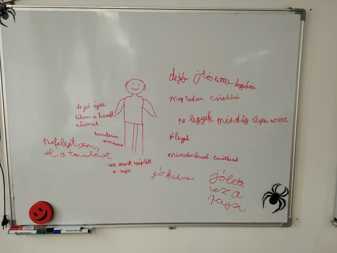 A „rágógumi-gyakorlat” után megkérdeztem a gyerekeket, hogy voltak-e már olyan helyzetben, amikor valami miatt nagyon aggódtak, izgultak, féltek és a legrosszabb eshetőségre gondoltak és végül visszagondolva, nem is volt olyan rossz élmény. Szinte mindenki tudott rá példát mondani. Ezután megbeszéltük, hogy mi az az optimizmus és különböző szituációs játékokat játszottunk: hogy reagálna egy optimista és hogy reagálna a pesszimista. Megnéztük az aranyszőrű bárány című mesét, végül mindenki írt egy mondatot, amelyek számukra fontos az optimizmushoz. Az óra végén pedig a „Pozitív gyerek vagyok” című dalra táncoltak közösen.
