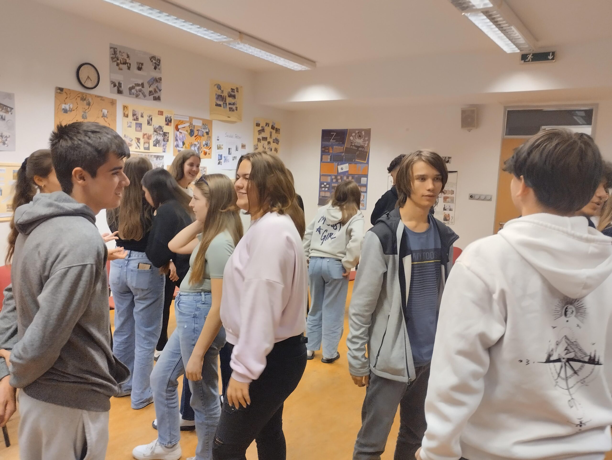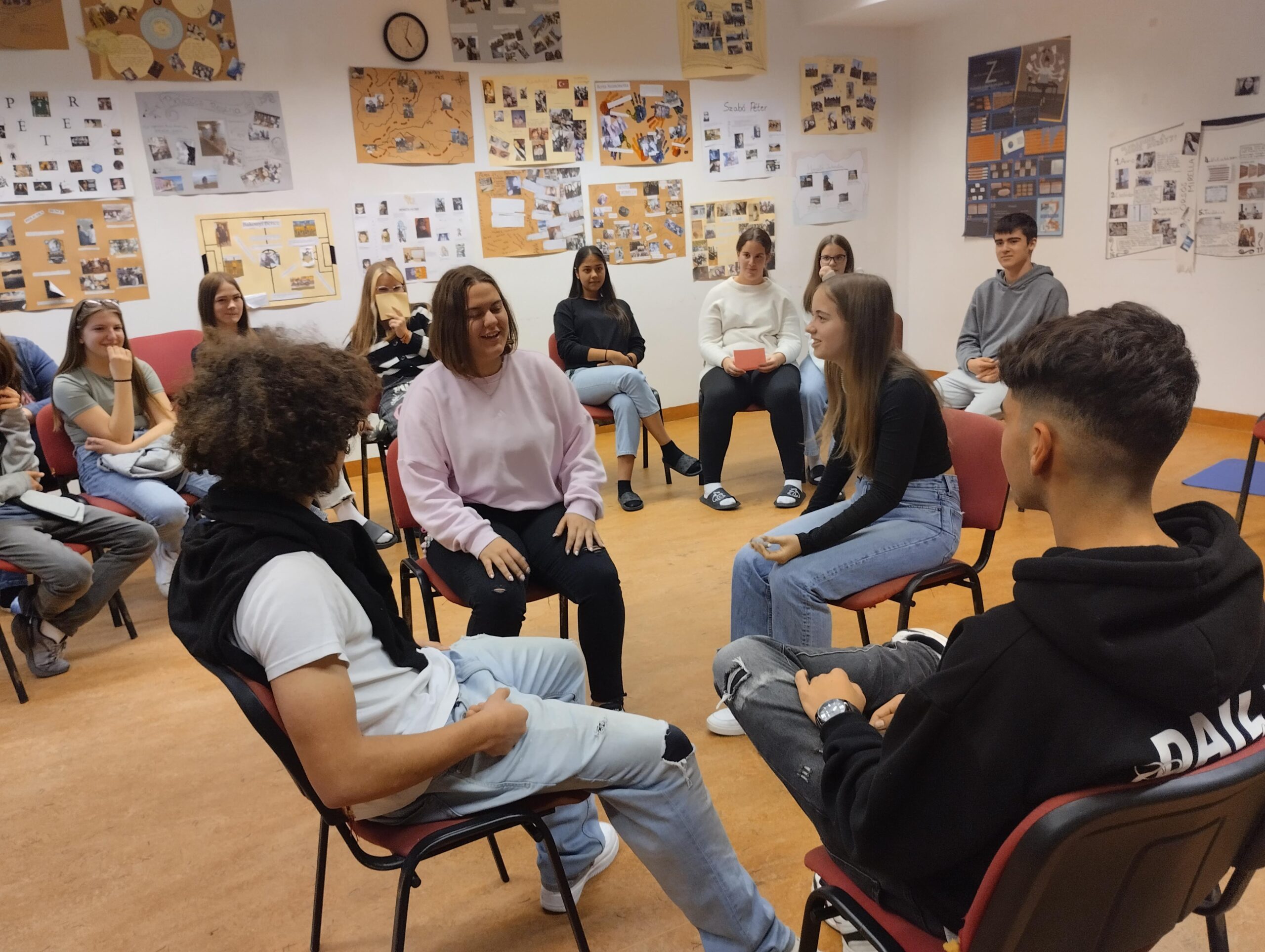 Nagy kört alkotunk. Minden második diák beljebb áll és szembefordul a társával. Igy lesz egy külső és belső körünk. Kérdéseket kapnak, és minden kérdés megbeszélésére 30 mp jut a gyerekeknek. 24-en vannak, 12 kérdés lesz. Ha lejár az idő, akkor a külső körből mindenki tovább lép egyet.
