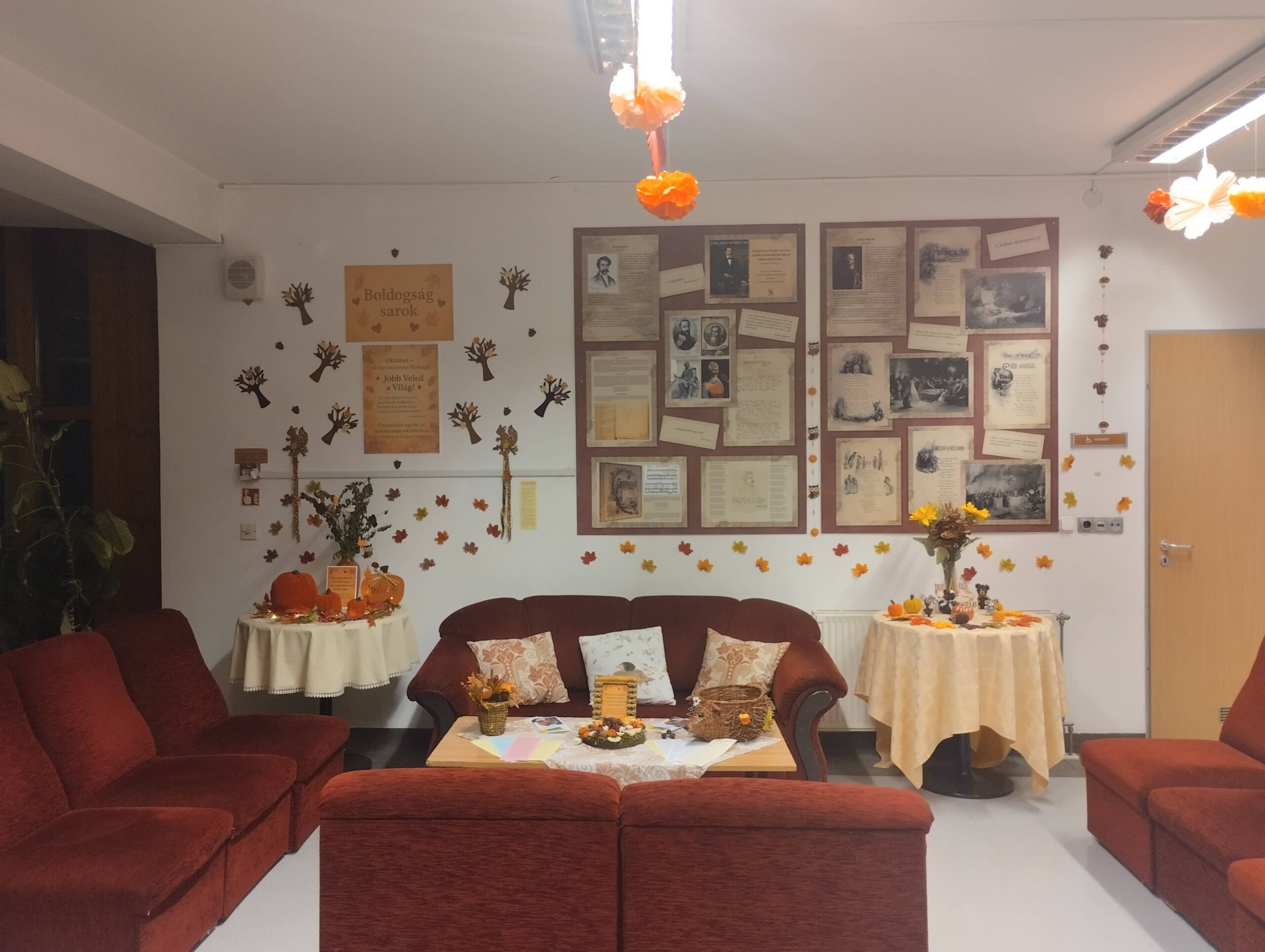 Nagy öröm számomra, hogy két csoportnak, a saját 9. F. AJTP és az önismereti csoportomnak 10. F AJTP tarthatok rendszeresen Boldogságórákat. A saját csoportomban minden nap nyílik alkalmam az adott témával foglalkozni akárcsak 20-30 percben is. A boldogságórákat ebben a hónapban az optimizmus témában tartottam. Azonban a célom az, hogy minél több gyermeket bevonjak a Kollégiumban a Boldogságóra programba. Erre kiváló alaklom az ügyelet, ahol sok gyermeket megszólíthatok. Így nem csak a saját csoportommal fejtettünk rejtvényt, festettünk köveket, optimista – pesszimista párosító kártyákat raktunk ki, meséltünk, hanem több más csoportból való gyerekekkel is kapcsolatba kerültem. Sikerült megvalósítani a csoportom segítségével az őszi hangulatú optimista Boldogság sarkot. Ez a hely a kollégiumunk földszinti központi aulájában van, ahol a falon lévő plakáton optimista üzenet olvashatnak a gyerekek. Az asztalon lévő kosárból mindenki húzhat magának egy napindító optimista üzenetet. Az asztalra még helyeztem el más útravaló szöveget is a gyerekeknek, amit olvashatnak, magukkal vihetnek. Örömmel láttam, hogy az emeleti faliújságra is került ki a szövegekből. Nem csak a gyerekektől, de a felnőttektől, kollégáktól, karbantartó és takarító társaktól is érkezett több pozitív visszajelzés, hogy milyen jó úgy kezdeni a napot, a munkát, hogy húznak egy idézetet.