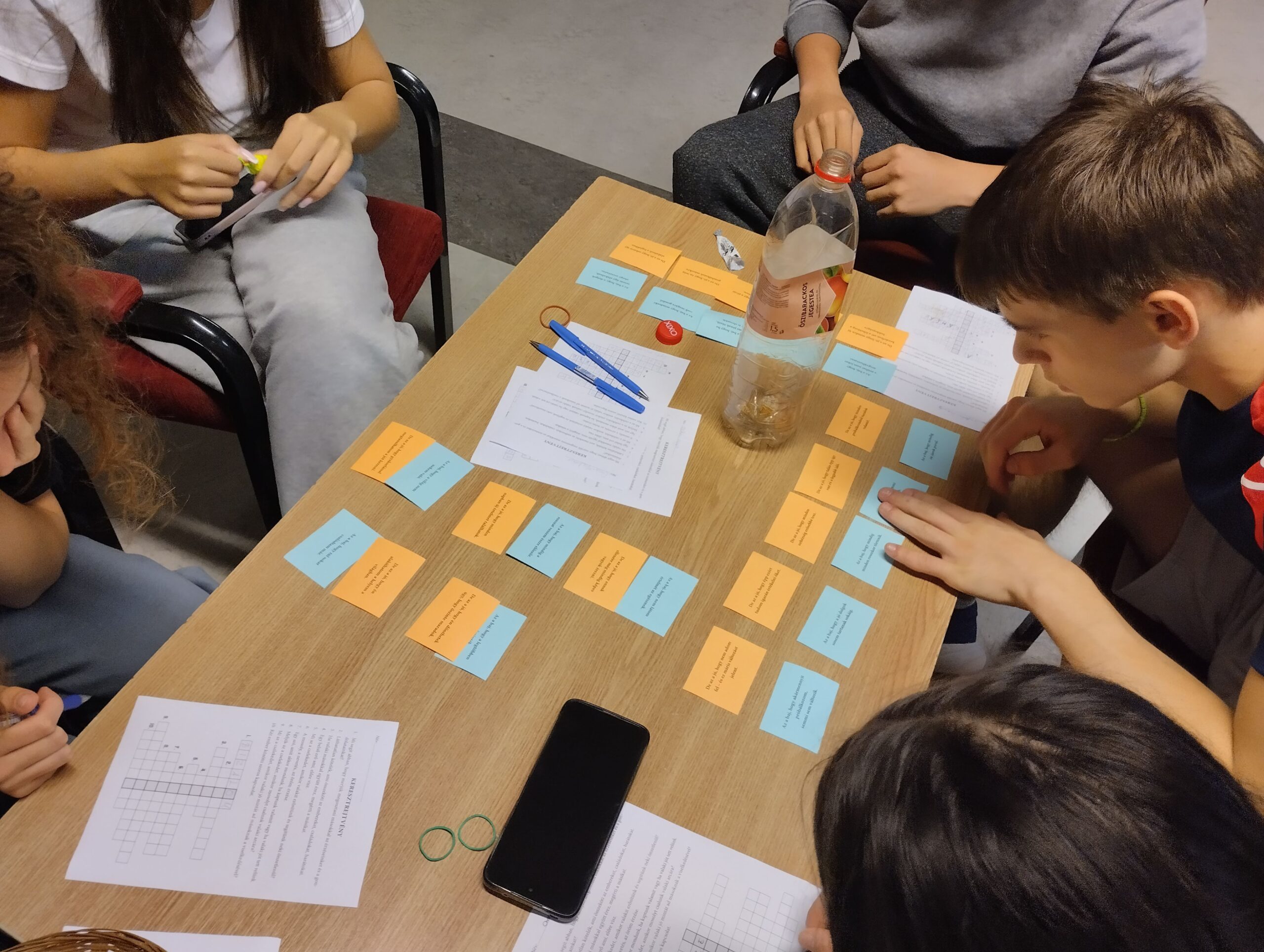 Csoportalakítás következett, aki amilyen cukrot húzott magának a kosárból, keresse meg az azonos cukorkás társait. Egy csoportban maximum négyen kerültek. Minden csoport kapott egy pakli pesszimista mondatot és egy pakli optimista mondatot. Feladat az volt, hogy összekellett párosítani a mondatokat. Amikor készen lettek, akkor minden csoportból egy – egy diák felolvasott egy kártyapárt. Pl: Az a baj, hogy mindig akad valami probléma. – Az a jó, hogy minden probléma megoldható valamennyire.