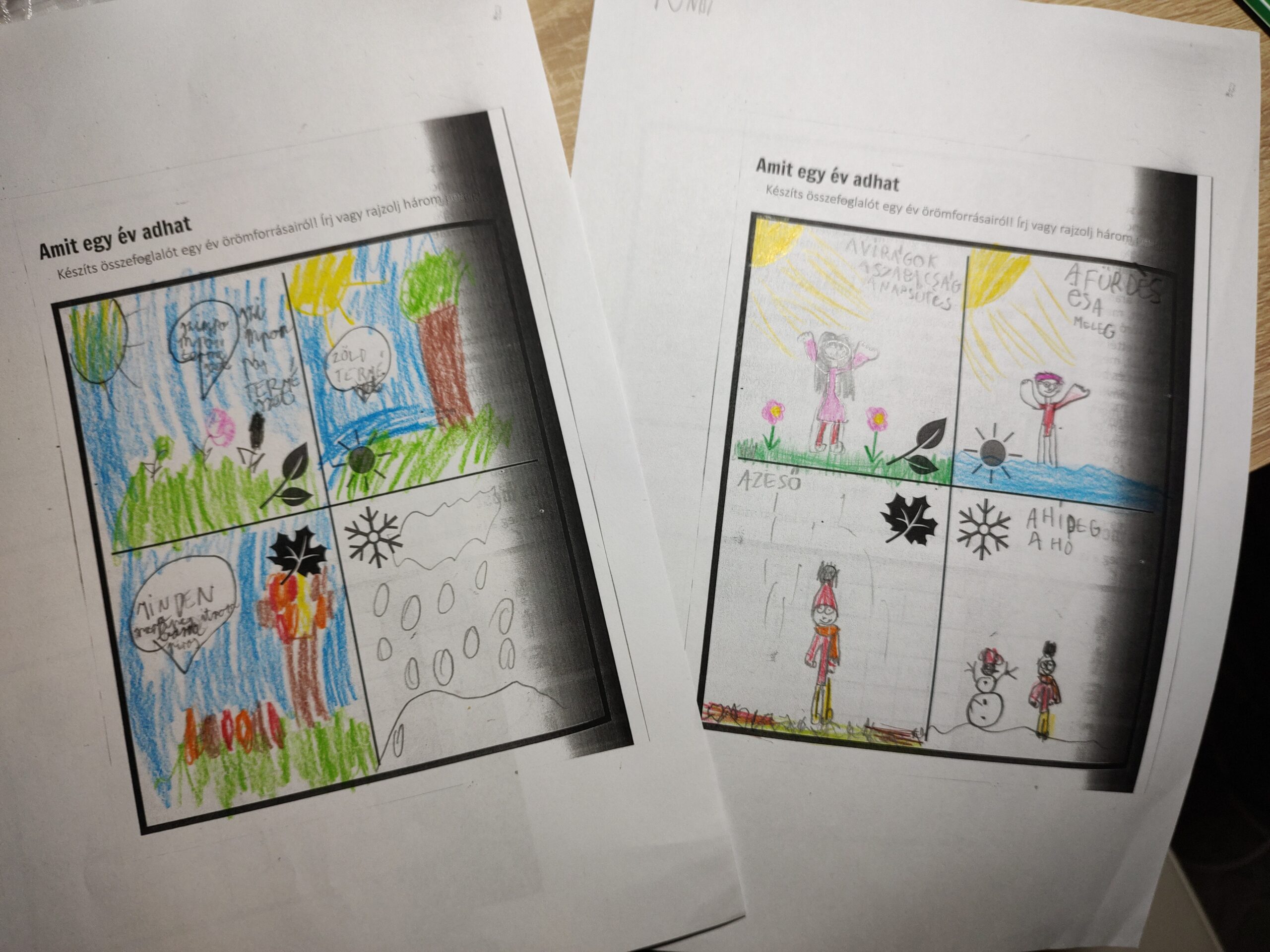 Rajzoljátok le,hogy az Öröm forrásának köszönhetően milyen apró örömöket láthatott meg Éda az év során az egyes évszakokhoz kötődően!