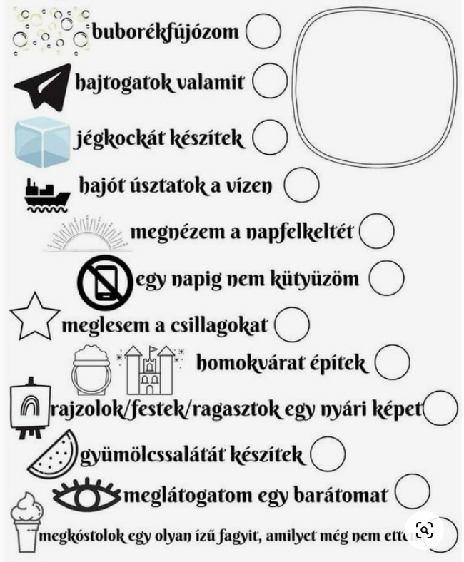 Az utolsó napokban a nyári szünetet tervezgettük. Találtunk az interneten egy olyan bakancslistát, ami nagyon megtetszett a csoportnak. Ezt letöltöttük és megbeszéltük, hogy szeptemberben beszámolunk róla, hogy ki, mit, hogyan valósított meg belőle.