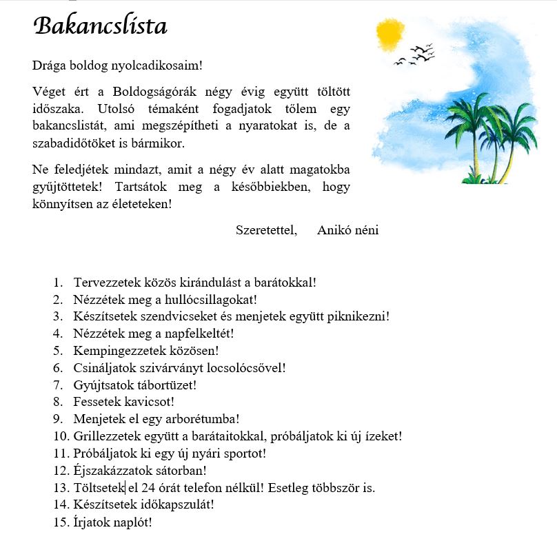 Négy évünk utolsó foglalkozásain összegeztük mindazt, amit mindeddig összegyűjtöttek a gyerekek. Bíztattam őket, hogy a Boldogságóra szellemiségét vigyék tovább az életükben és ehhez, valamint a boldogabb nyárhoz adtam nekik egy bakancslistát. Bízom benne, hogy értelme volt a közös együtt töltött időnek.