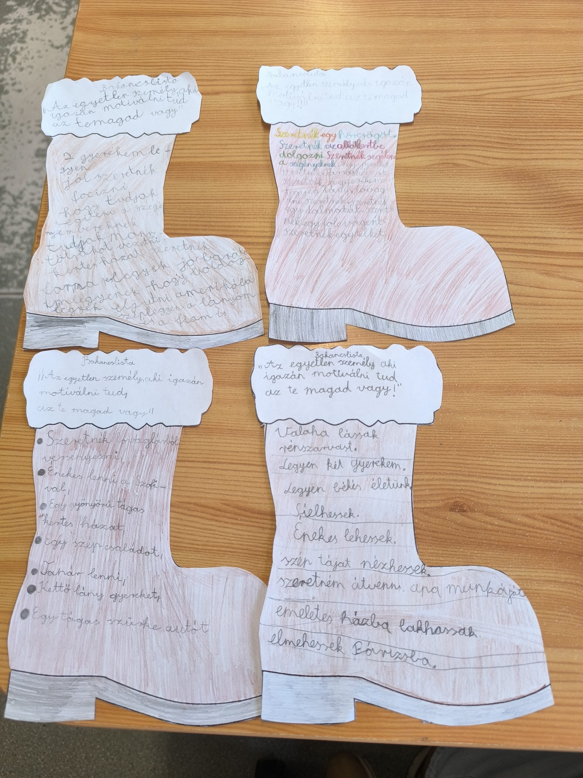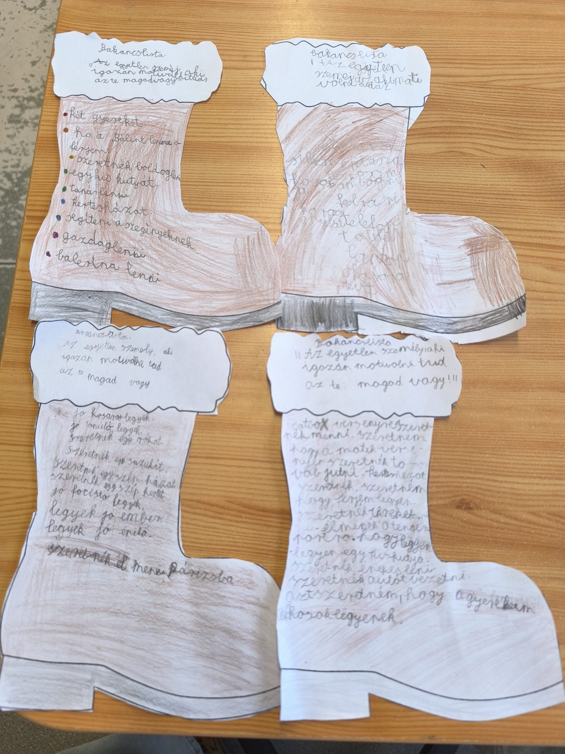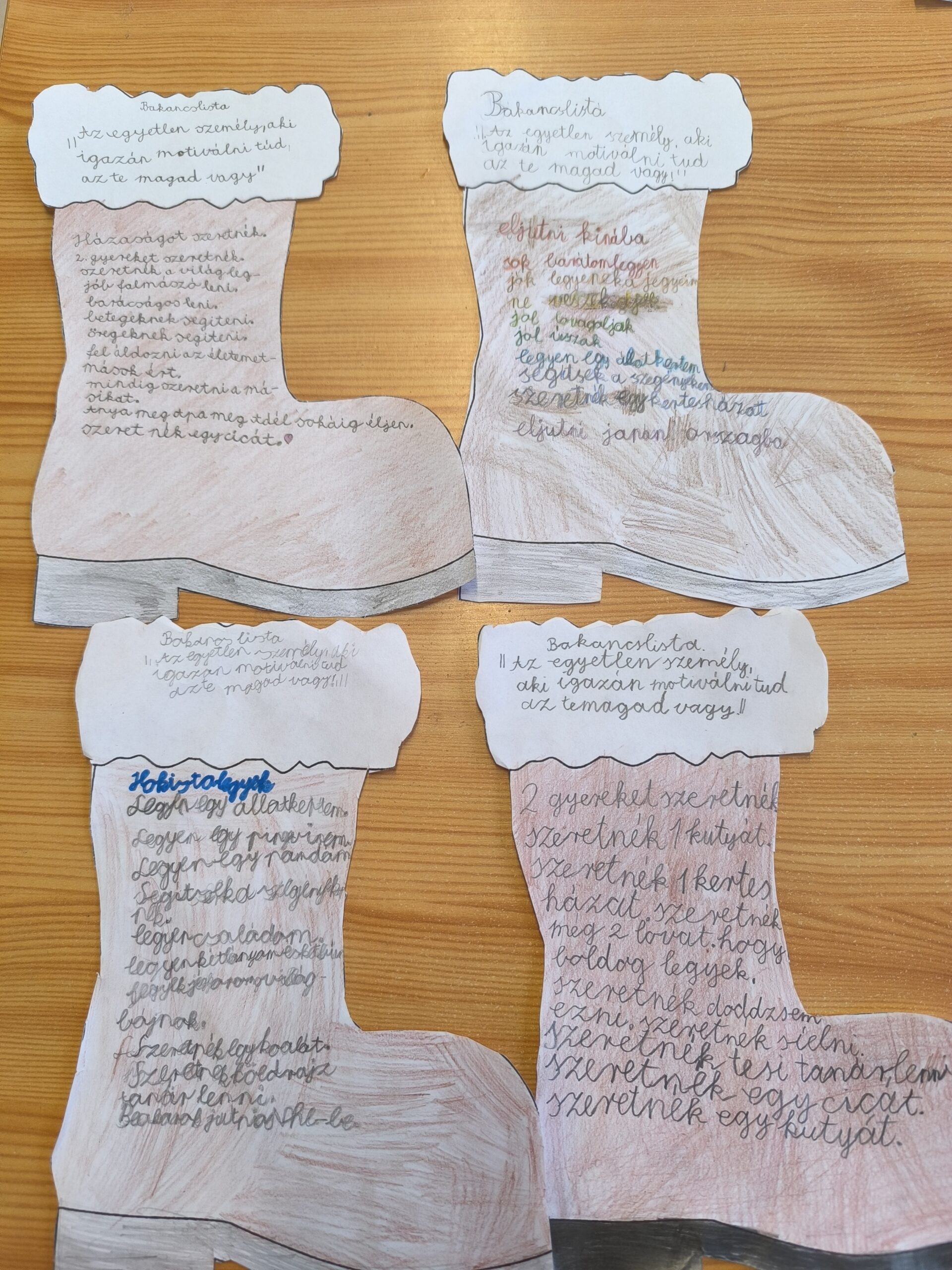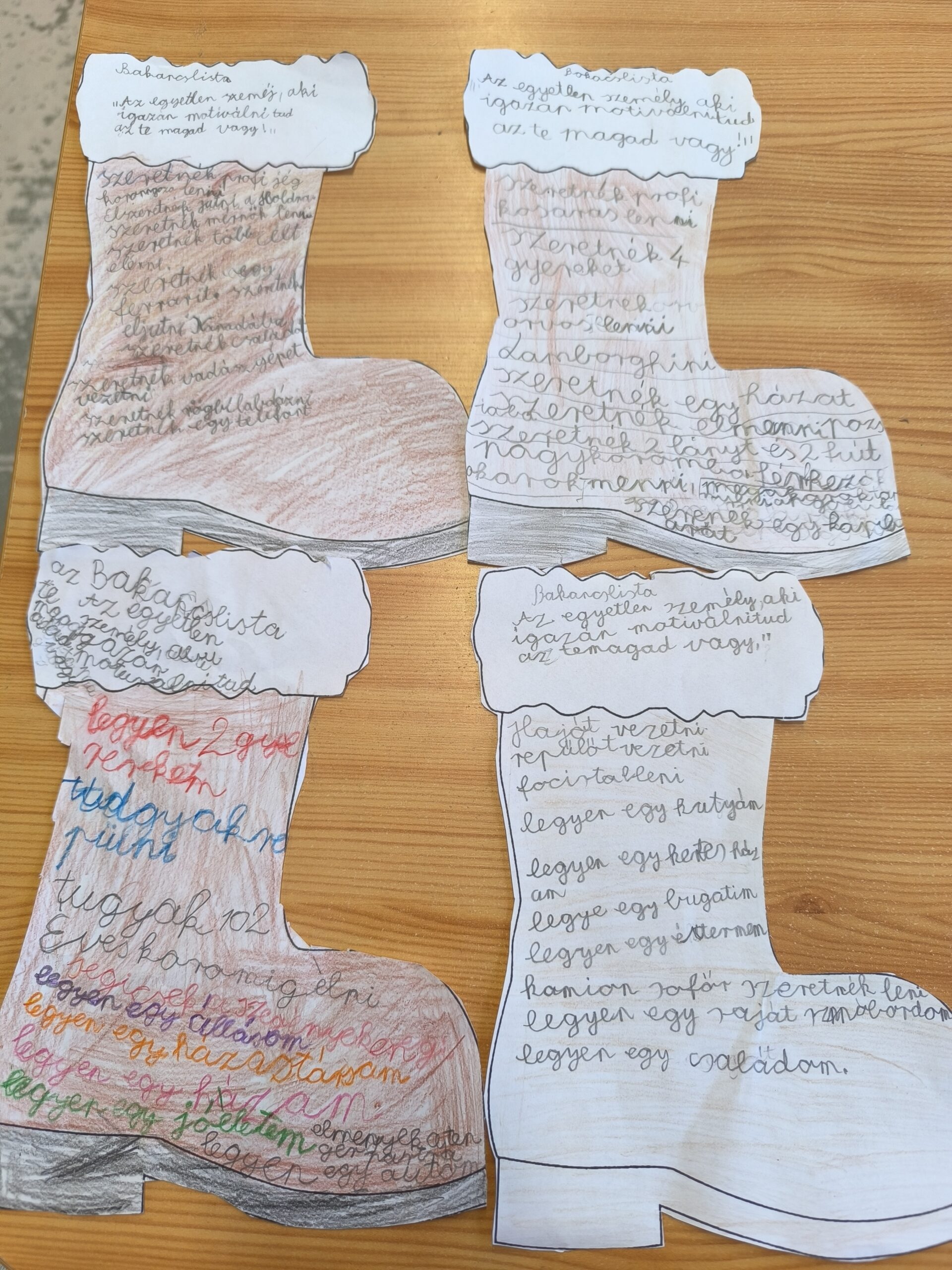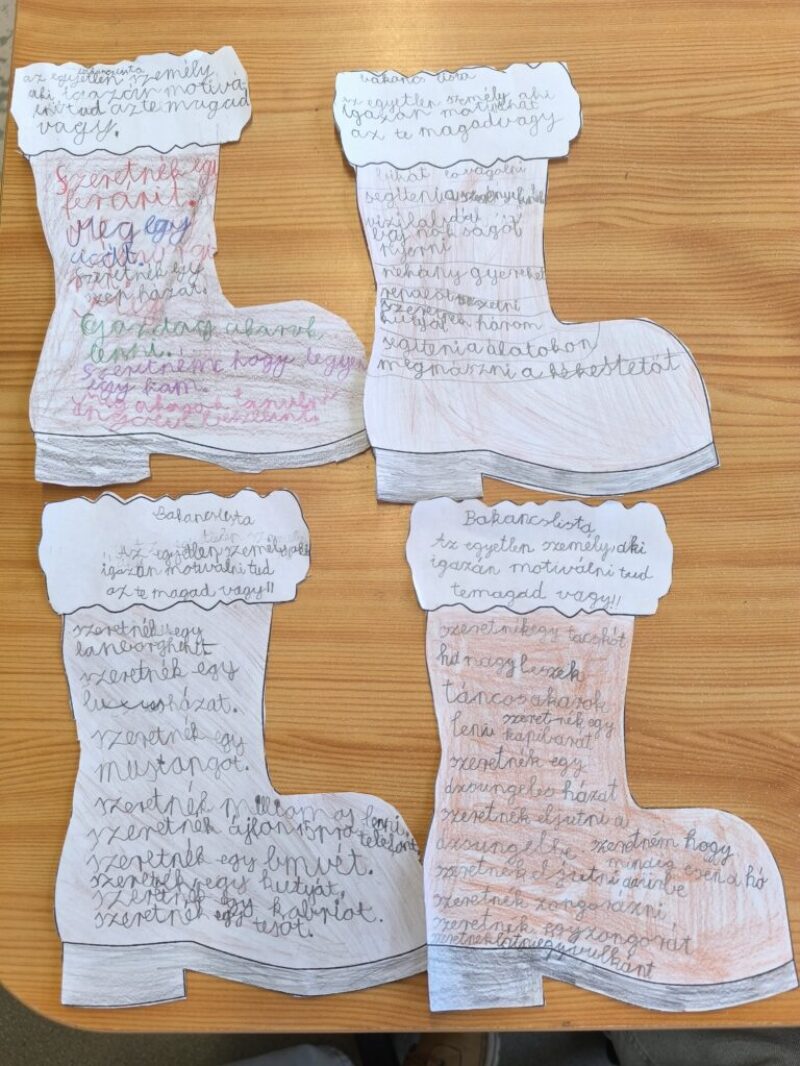 Vágással, színezéssel készített bakancslista. Előzetes beszélgetés a jövőbeli célokról, motivációról, belső erőről, célok eleréséről.