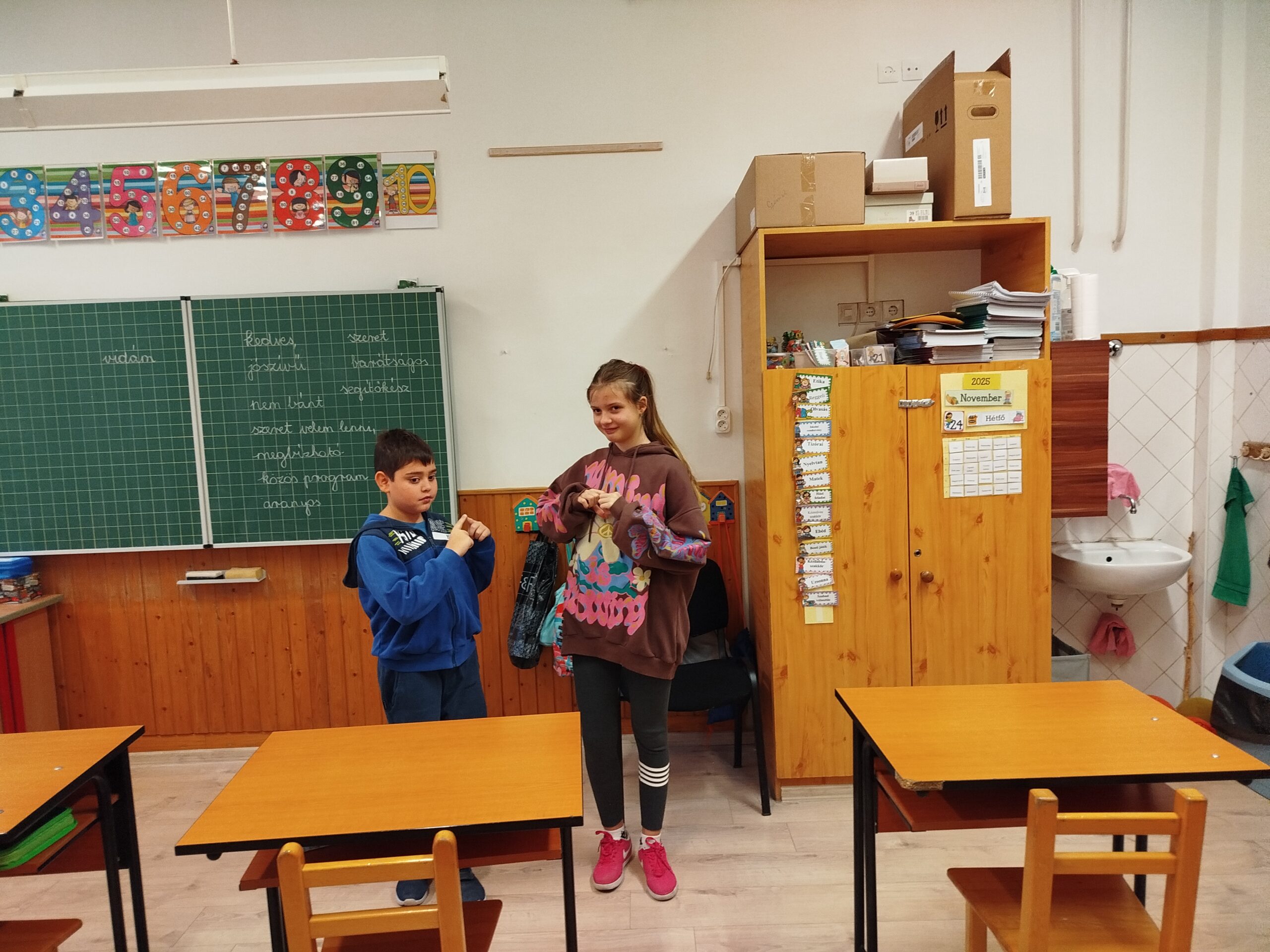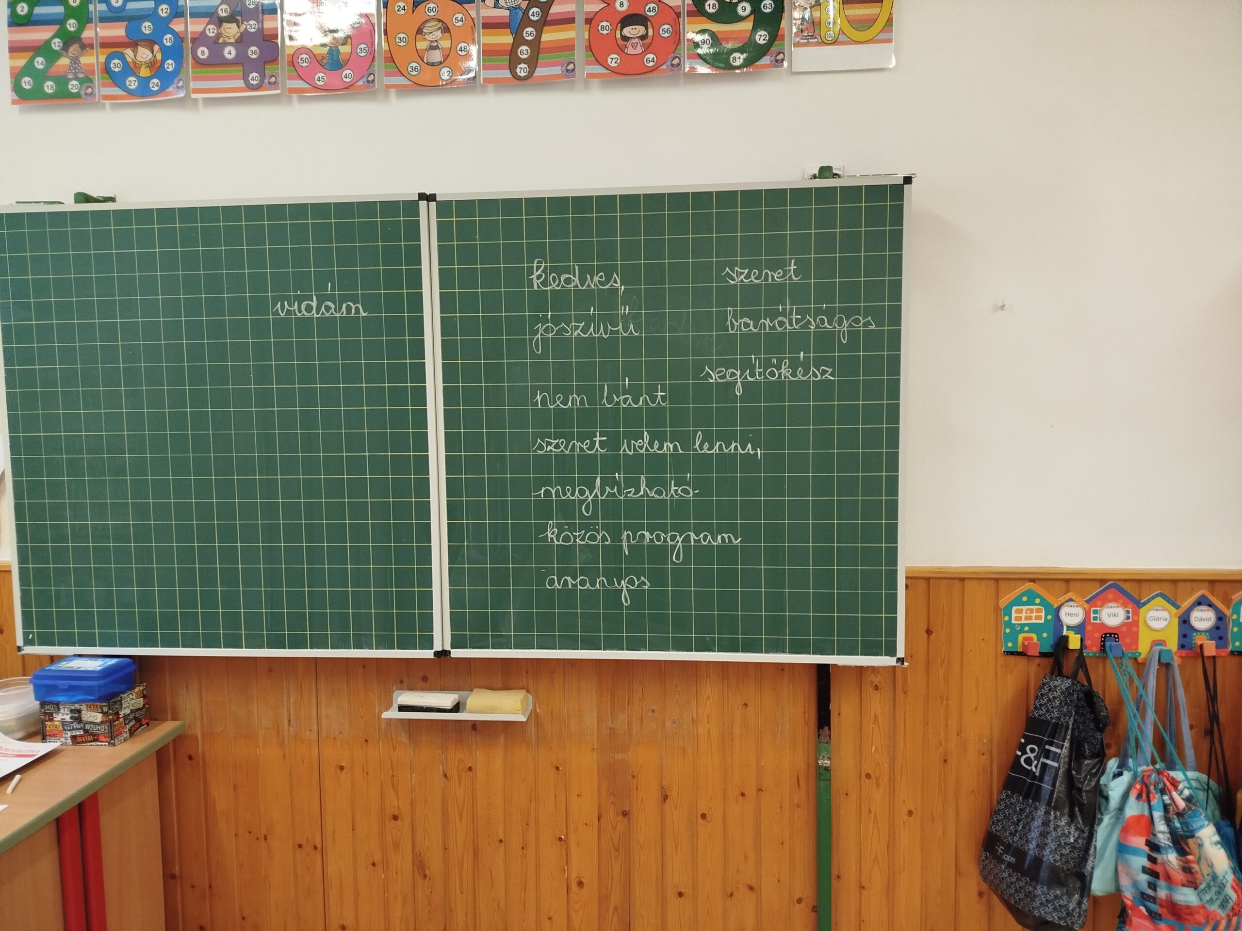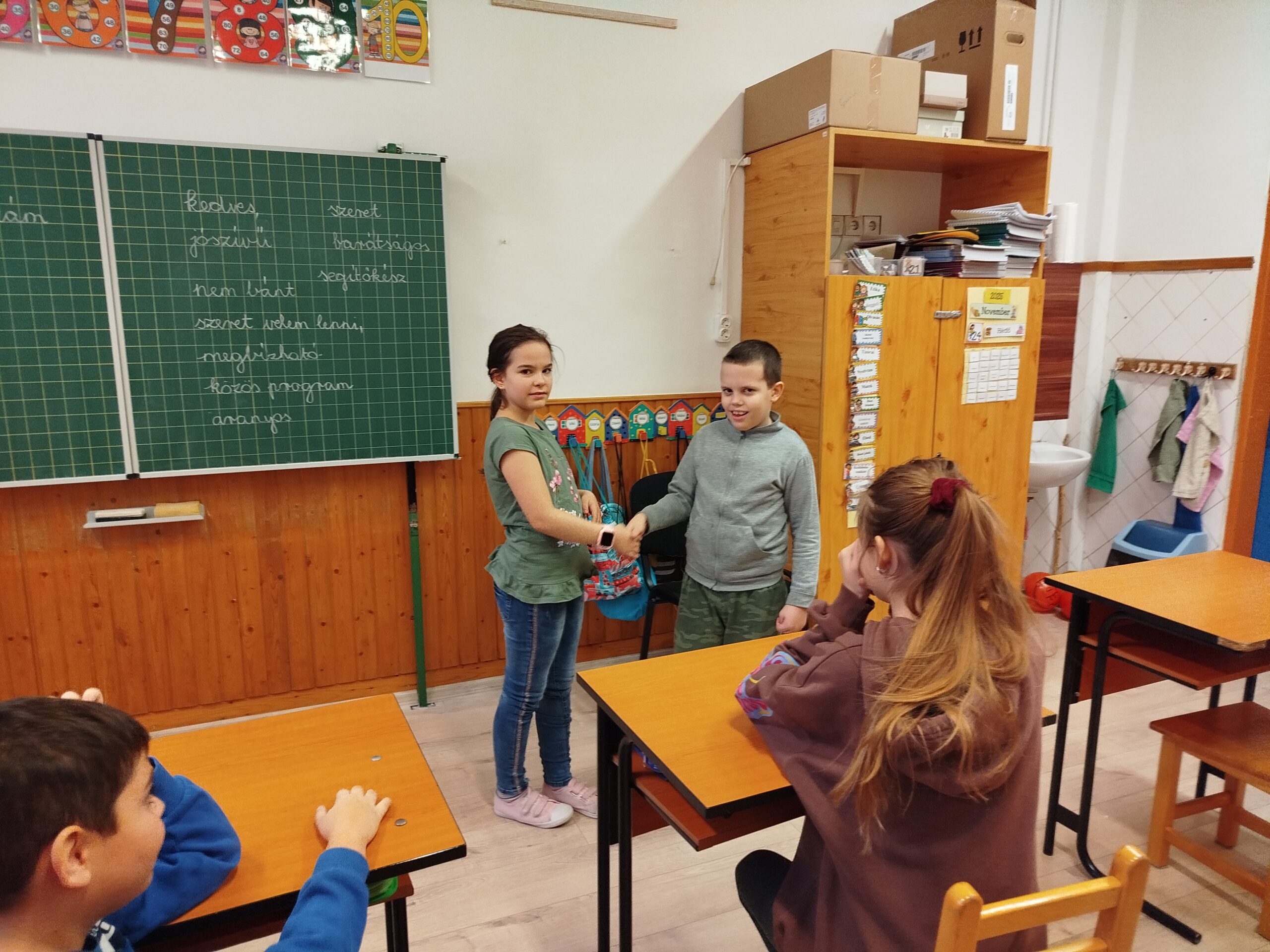 Az órakezdő relaxációs gyakorlatok után a foglalkozás témáját a jó barát tulajdonságainak összegyűjtésével vezettük be. A táblára közösen felírtuk azokat a jellemzőket, amely a jó barát legfőbb ismérvei.