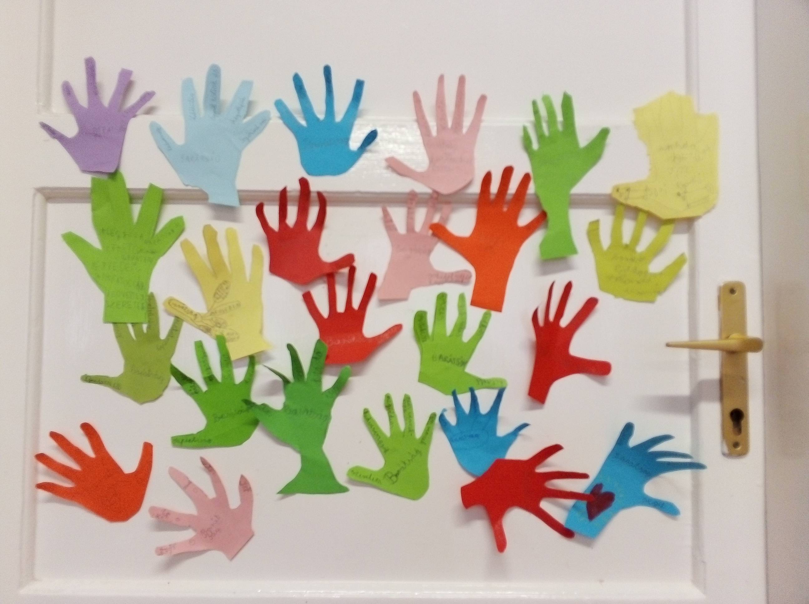 Az óra elején meghallgattuk Bagdi Bella: Világomban minden rendben van kezdetű dalát. Sőt, táncoltunk rá! A gyerekekkel írtunk egy hosszú listát, hogy milyen társas kapcsolataik vannak. Ebből kiemeltük a barátságot. Arról beszélgettünk, hogy milyen tulajdonságokra van szükségünk, ahhoz, hogy jó barátságokat tudjunk fenntartani. Készítettünk egy barátságötöst. A gyerekek színes papírokra körberajzolták a kezüket, amit kivágtunk. Ráírtuk a közepére, hogy Barátság, az ujjacskákra pedig egy-egy olyan tulajdonságot, ami a számukra a legfontosabb öt a felsorolt barátságfenntartó tulajdonság. Ezeknek a képe látható a feltöltött képek között. Az óra fennmaradó részében bizalomjátékokat játszottunk. Búcsúzóul „Legyen szép napod szívecskét rajzoltunk egymás tenyerébe.