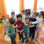 A társas kapcsolatok ápolását relaxációval kezdtük. Ellazítottuk a kezeinket, a karjainkat a lábainkat, minden testrészünket. Bagdi Bella zenéjére vidáman jártunk táncot, tapsoltunk, ujjongtunk, kiabáltunk és egyéb tánclépéseket improvizáltunk. Megbeszéltük miről szólt a dal és beszélgettünk arról, hogy miért jó közösségben, barátok közt lenni, miért vagyunk boldogok. Előkerült a kedvenc színes kendőnk, amellyel eljátszottuk, kinek ki a legjobb barátja, vajon miért szereti őt a legjobban? Vajon mit szeret benne a legjobban? Annak kellet átnyújtani a kendő másik végét, akit valamiért nagyon szeretnek. A kis-,középső csoportos gyerekeknek a kommunikáció és a kifejezőkészség fejlesztésére ez nagyon jó lehetőség volt. Többségük bátran, valaki visszahúzódva válaszolta meg a kérdéseket.