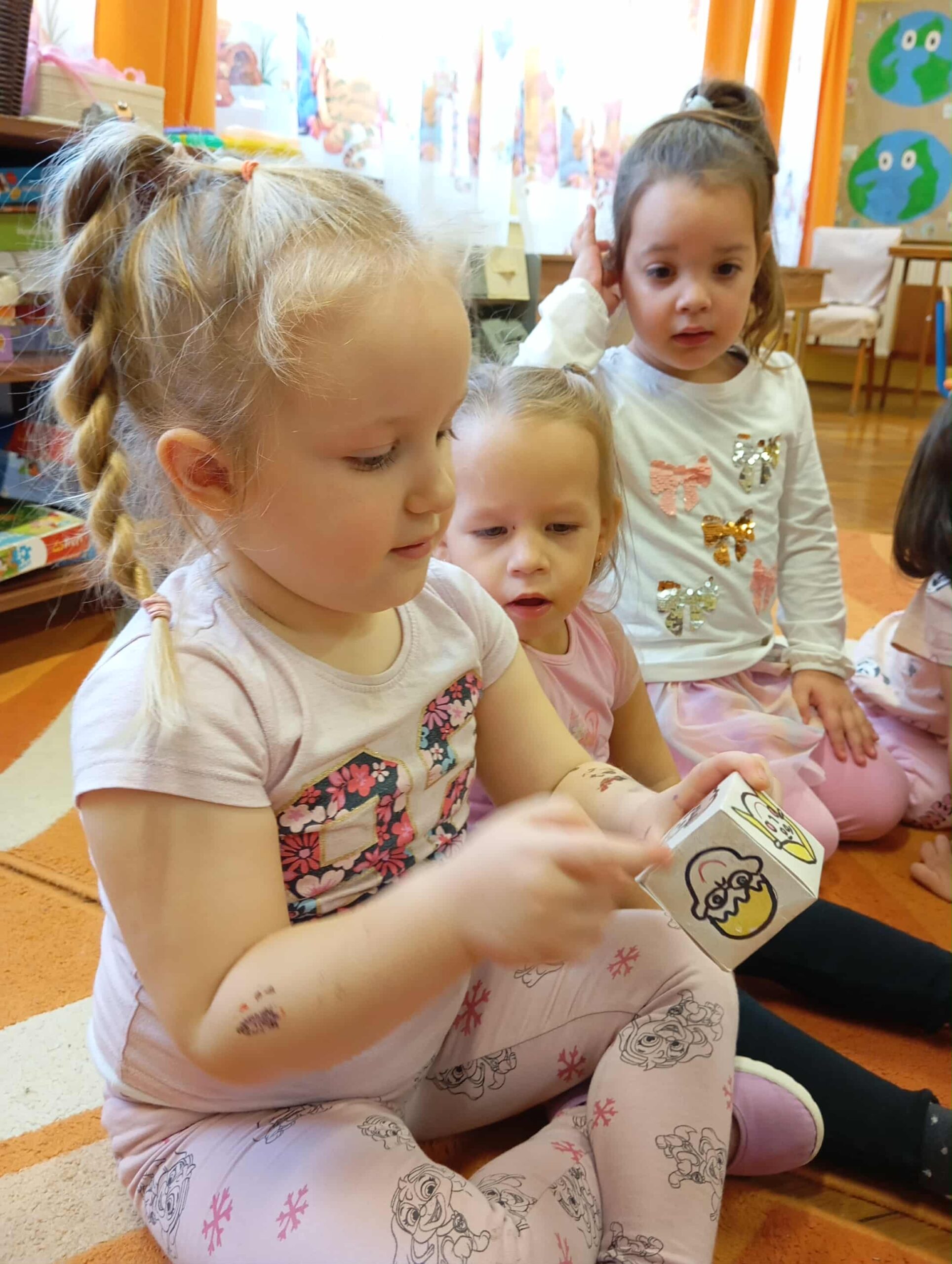 A süni irigy lesz című bábjátékot követően szintén beszélgettünk arról, hogy mi a helyes és mi a helytelen viselkedés, hogyan lehetünk jó barátok, milyen cselekedetekkel tudjuk jobbá tenni a barátságot. Dobókockán vidám és szomorú arcokat láthattak a gyerekek, mindenki dobott és elmondta, milyen arckifejezést lát, ha volt kedve utánozhatta. Záró játékként egy vidám labdás csapatverseny játékot játszottunk. Két csapatban, drukkolva egymásnak vajon mikor ér el a labda a sor elejére.