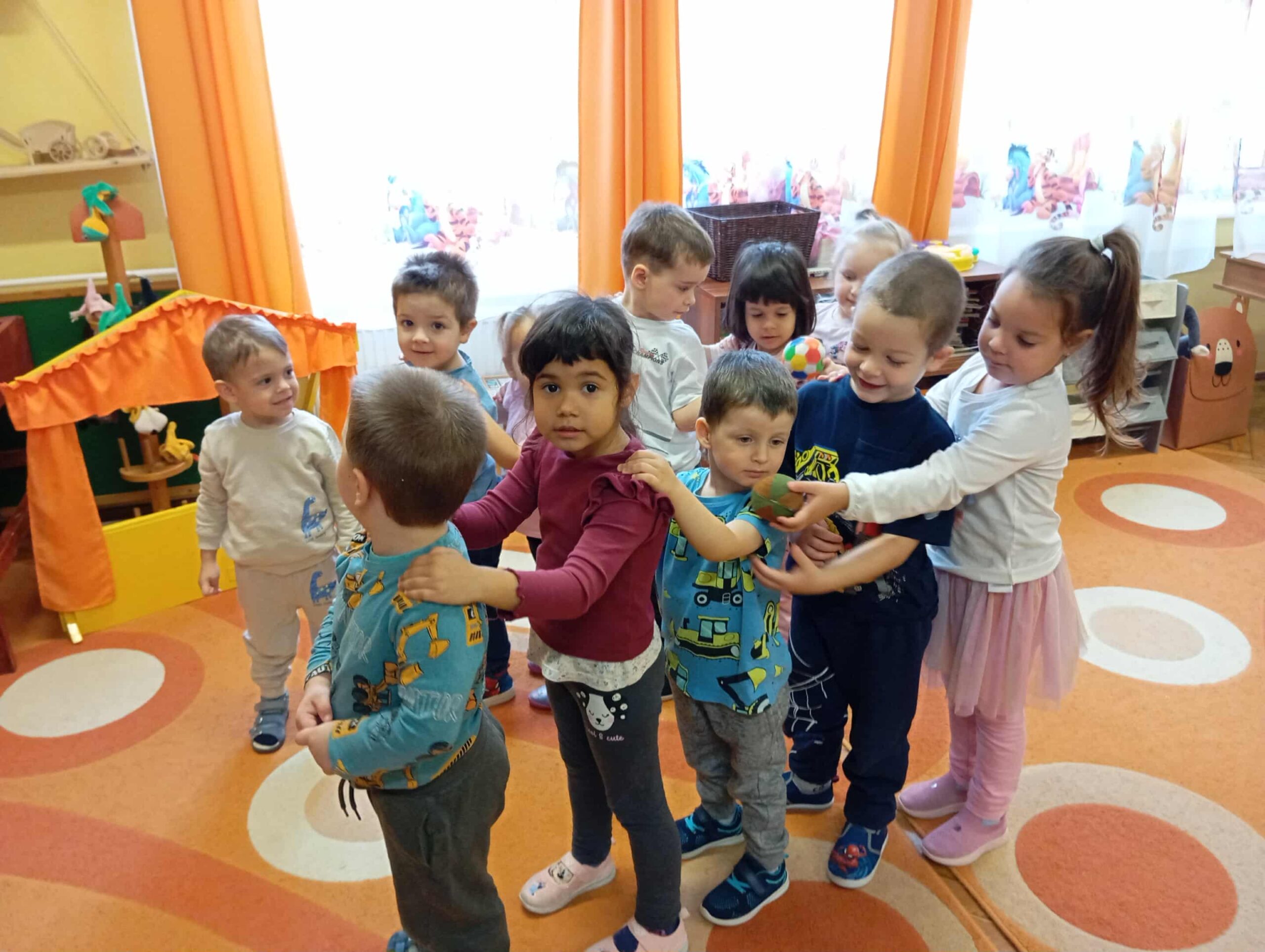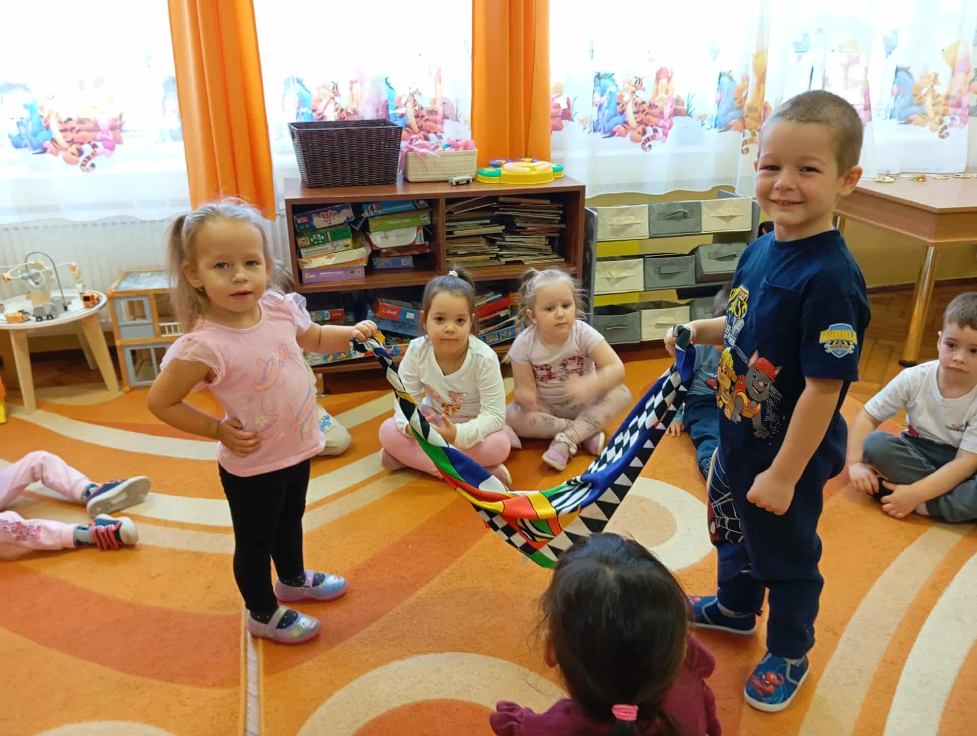 A társas kapcsolatok ápolását relaxációval kezdtük. Ellazítottuk a kezeinket, a karjainkat a lábainkat, minden testrészünket. Bagdi Bella zenéjére vidáman jártunk táncot, tapsoltunk, ujjongtunk, kiabáltunk és egyéb tánclépéseket improvizáltunk. Megbeszéltük miről szólt a dal és beszélgettünk arról, hogy miért jó közösségben, barátok közt lenni, miért vagyunk boldogok. Előkerült a kedvenc színes kendőnk, amellyel eljátszottuk, kinek ki a legjobb barátja, vajon miért szereti őt a legjobban? Vajon mit szeret benne a legjobban? Annak kellet átnyújtani a kendő másik végét, akit valamiért nagyon szeretnek. A kis-,középső csoportos gyerekeknek a kommunikáció és a kifejezőkészség fejlesztésére ez nagyon jó lehetőség volt. Többségük bátran, valaki visszahúzódva válaszolta meg a kérdéseket.