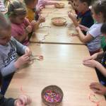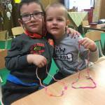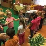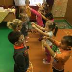 A foglalkozás előtt minden gyerek egyenként elmondta „miért jó ,hogy vannak barátaink „ majd megnevezte őket. Mielőtt az asztalokhoz mentünk volna mindenki megölelte pajtását , majd a barátjával párokat alkotva helyet foglaltak egymással szemben. A kialakult párok „barátság nyakláncot „ fűztek színes szívószálból. Rövid idő alatt minden gyerek elkészítette a barátja számára a nyakláncot , ezt követően a szőnyegen egymással szemben helyezkedtek el, hogy könnyebb legyen nyakba akasztani . Mielőtt a csoport játszani ment volna , egy nagy kört alkotva leültünk , megöleltük egymást mondván „ de jó együtt lenni „ !