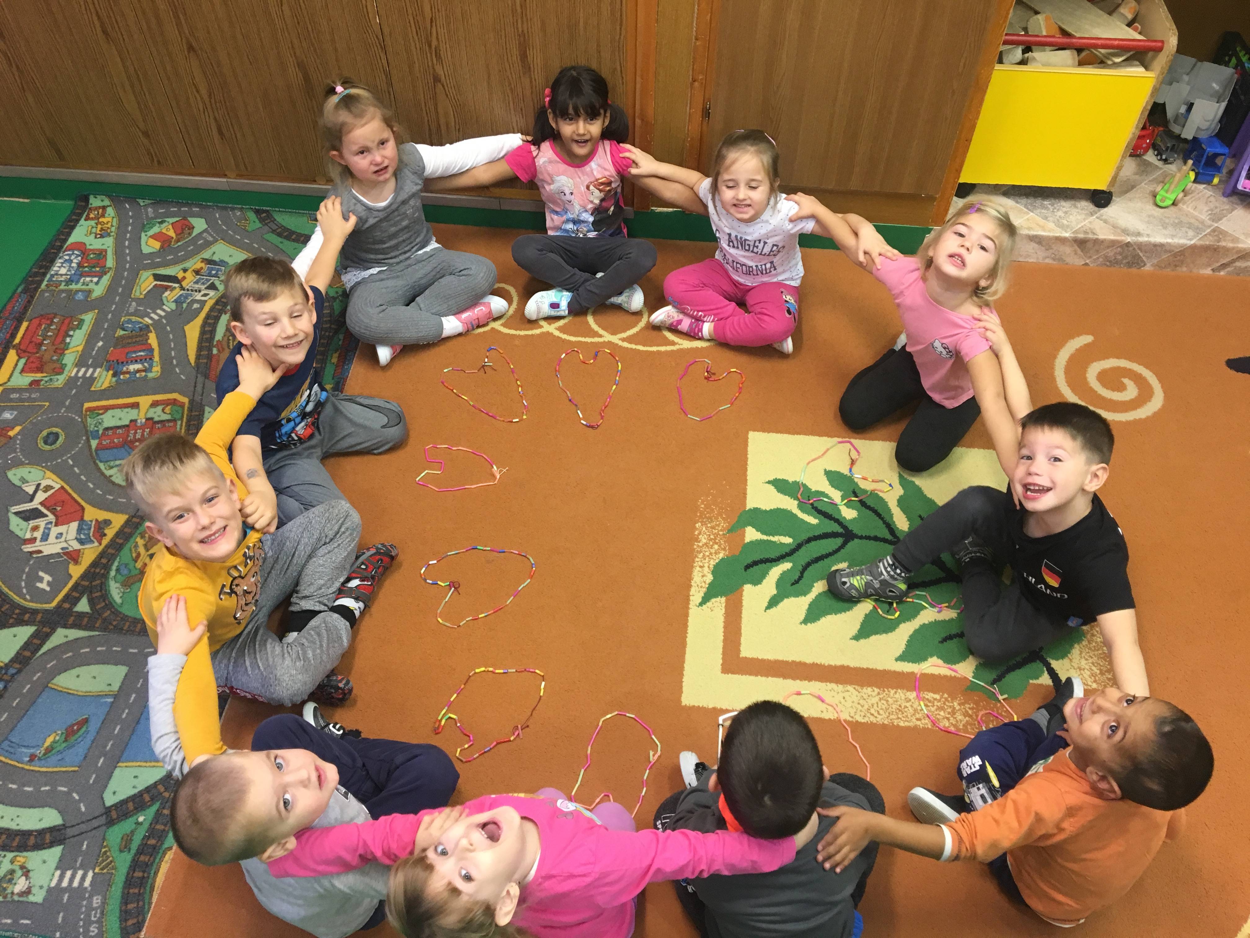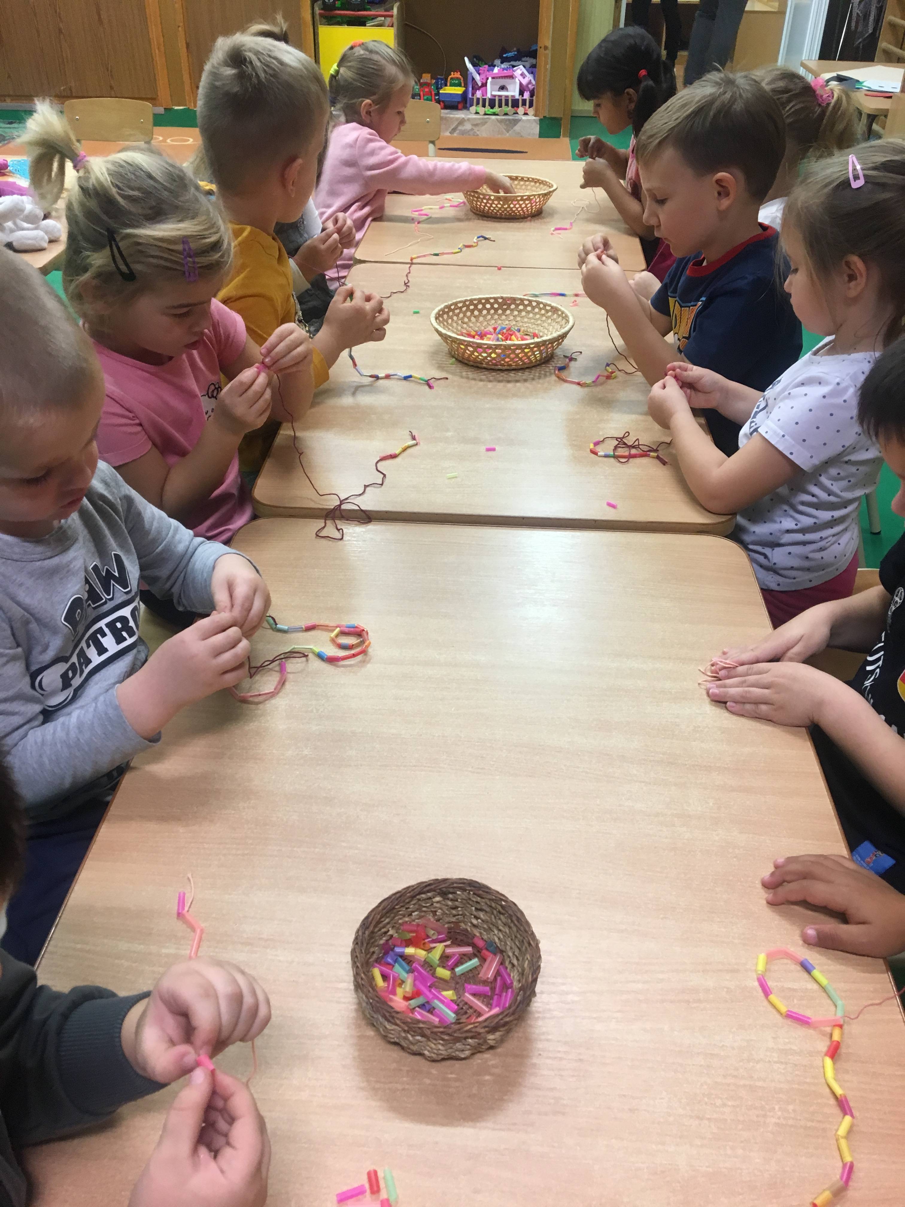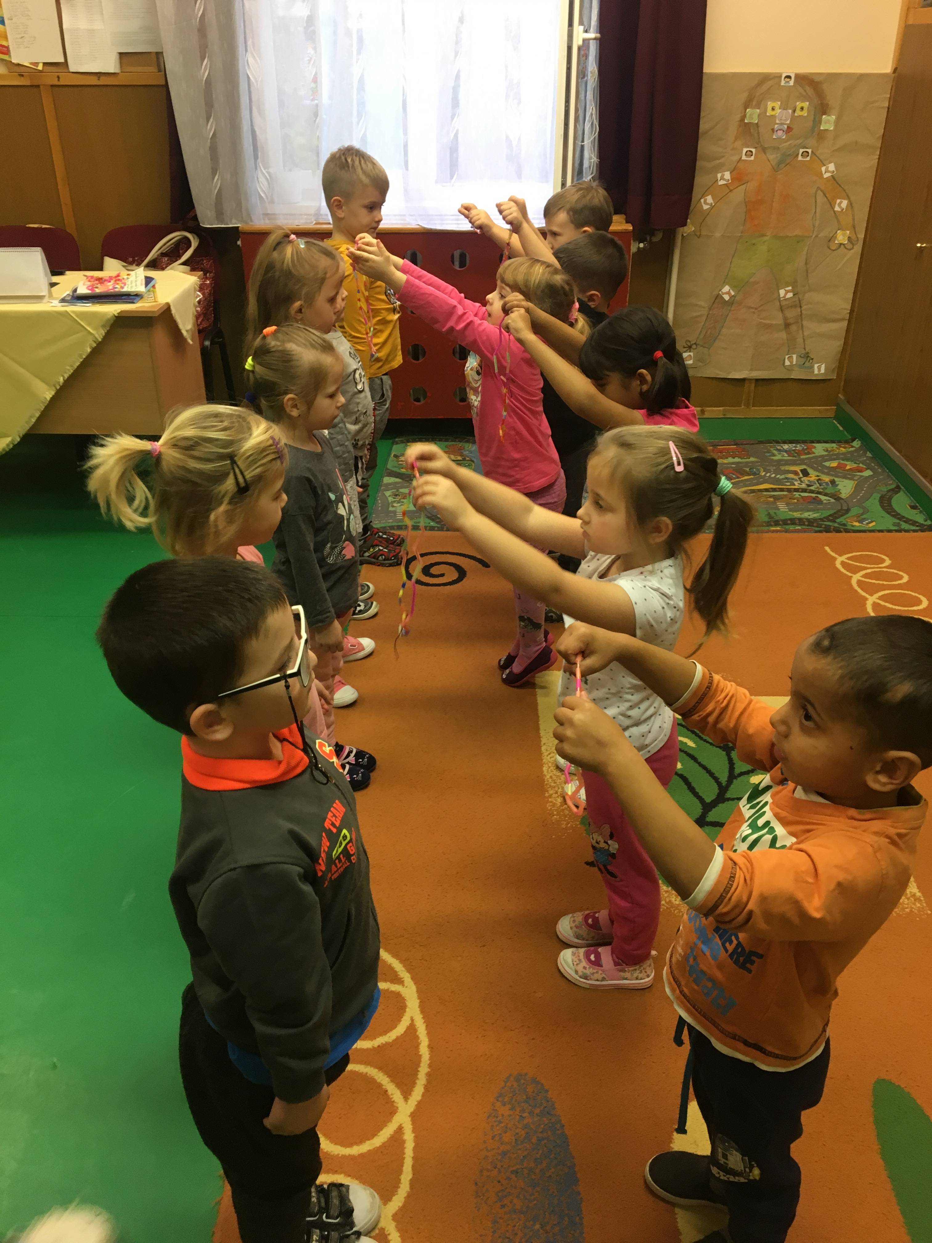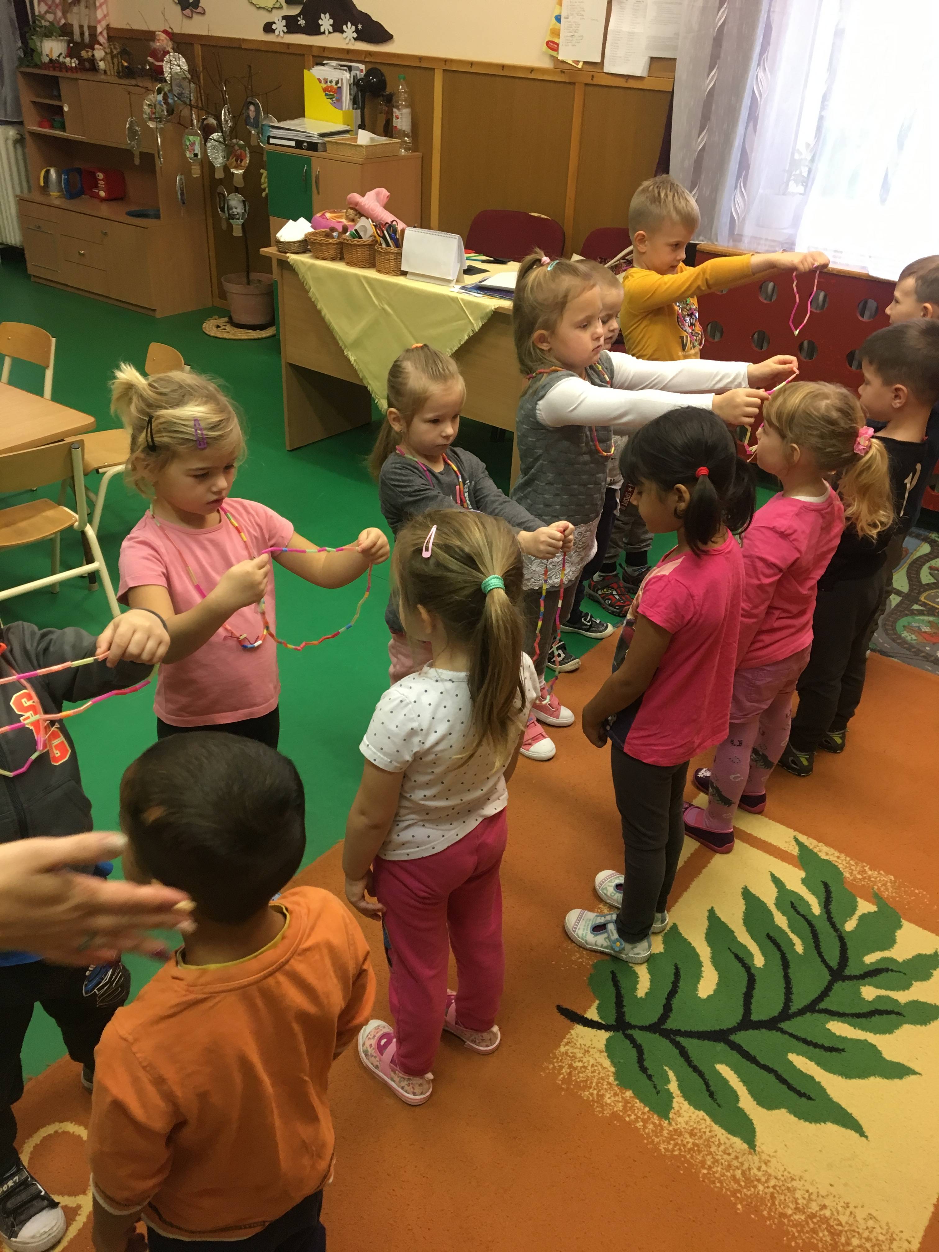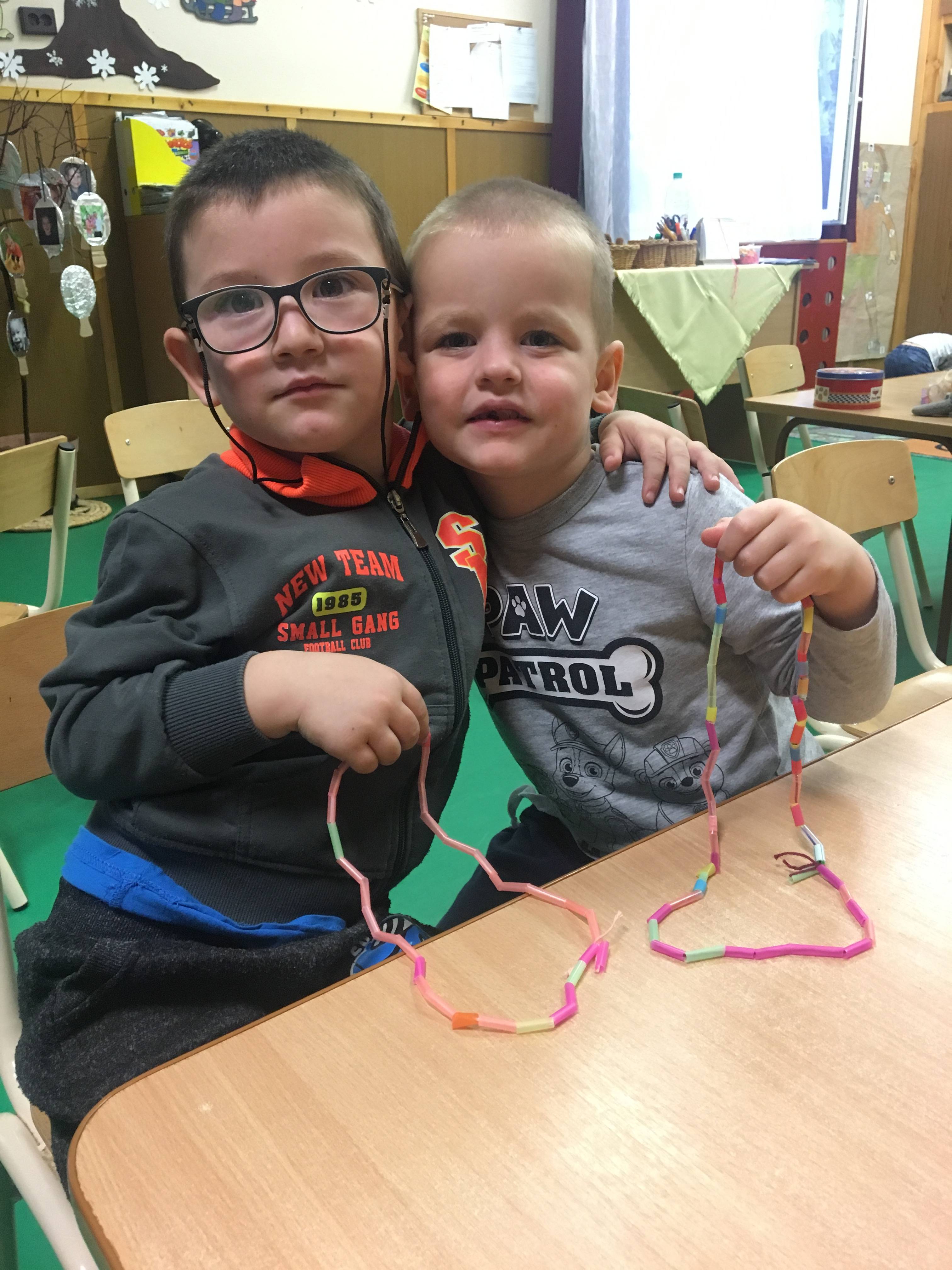 A foglalkozás előtt minden gyerek egyenként elmondta „miért jó ,hogy vannak barátaink „ majd megnevezte őket. Mielőtt az asztalokhoz mentünk volna mindenki megölelte pajtását , majd a barátjával párokat alkotva helyet foglaltak egymással szemben. A kialakult párok „barátság nyakláncot „ fűztek színes szívószálból. Rövid idő alatt minden gyerek elkészítette a barátja számára a nyakláncot , ezt követően a szőnyegen egymással szemben helyezkedtek el, hogy könnyebb legyen nyakba akasztani . Mielőtt a csoport játszani ment volna , egy nagy kört alkotva leültünk , megöleltük egymást mondván „ de jó együtt lenni „ !