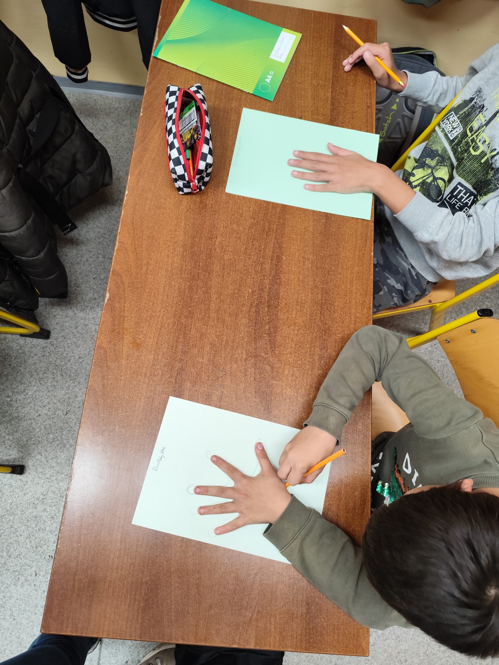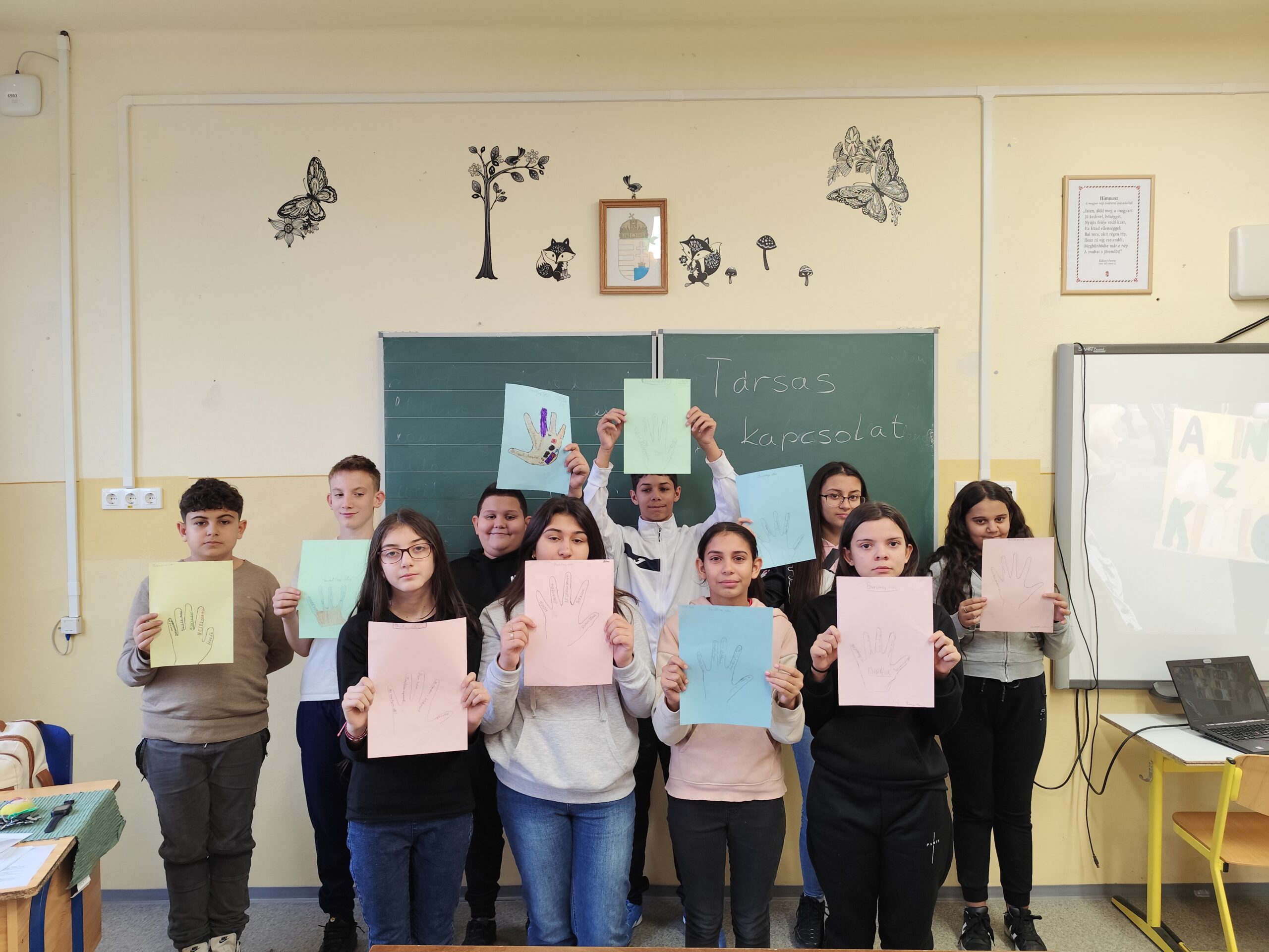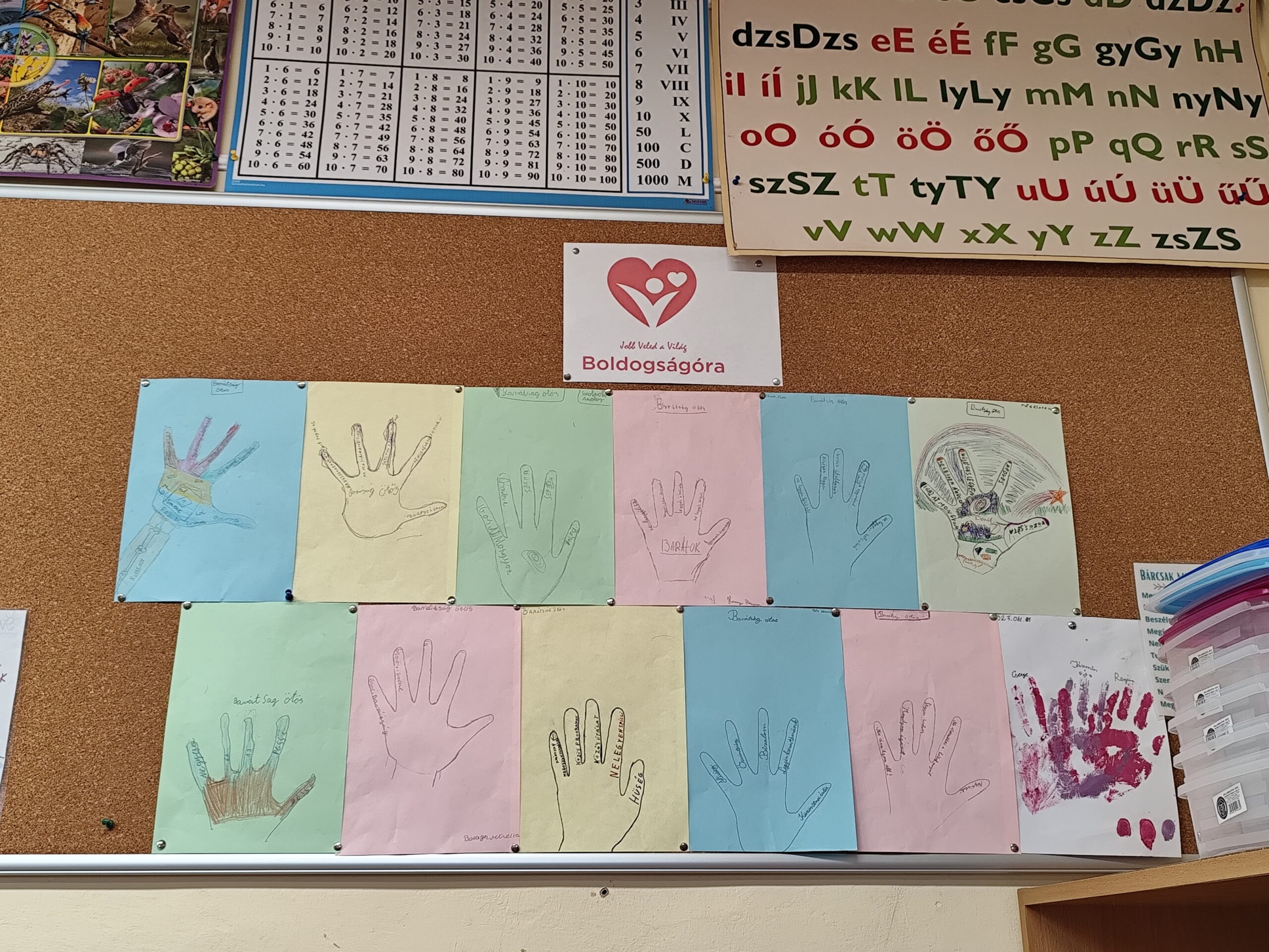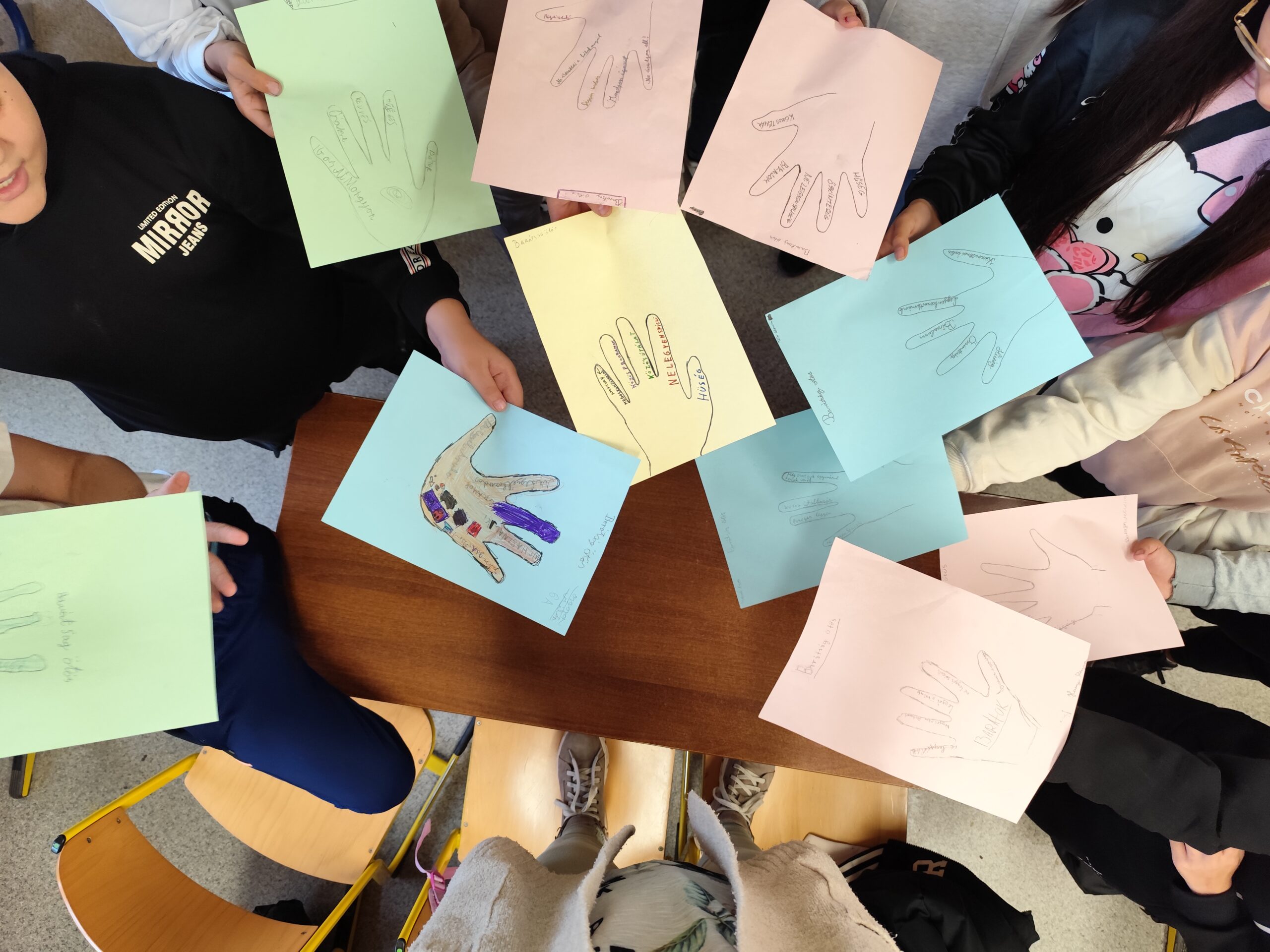 A gyerekekkel megbeszéltük a társas kapcsolatok formáit, azok fontosságát. Majd a barátságról társalogtunk. A tanulók átrajzolták a tenyerüket, majd minden ujjba egy fontos tulajdonságot írtak, mely számukra fontos a barátság során.