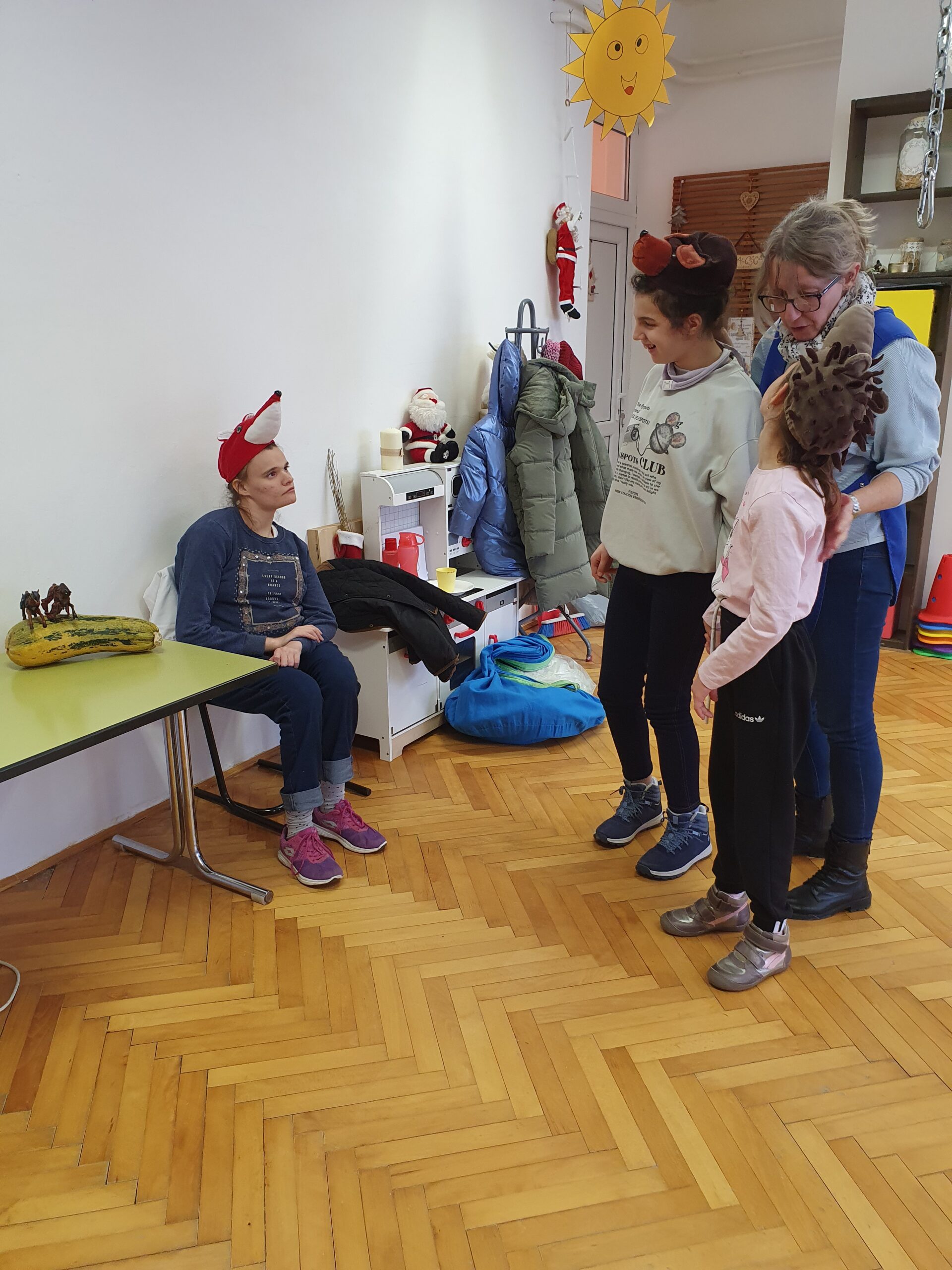 Bevezetésként üdvözöltük egymást, majd a relaxációs gyakorlatok közül a Napimádással hangolódtunk, mely boldogságóráink állandó elemét képezi. Ezt követően meghallgattuk, ritmushangszerekkel közösen kísértük Bagdi Bella Barátság dalát.