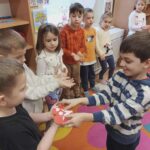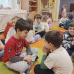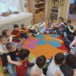 Foglalkozásunk hangulatteremtő, kezdő gyakorlatának egy kötetlen, improvizatív örömtáncot választottam: a Hahó együttes Barátság dal zeneszámára a gyerekek kötetlenül mozoghattak, táncolhattak a térben. Ezt követte a „Szív -küldi” kapcsolatteremtő játék, amely maximálisan segítette a csoportkohézió erősítését , az egymásra való odafigyelést. A játék során tudatosan irányítottuk a figyelmümket arra, hogy a Boldogság szív, mindenkihez eljusson. A „Barátság-ragacs” játék során különösen érvényesült a humor 🙂 . Különböző testrészeinkkel ragadhattunk össze. A játék során fontos szempont volt, hogy minden instrukciónál olyan gyermeket , kispajtást kellett választani, akivel még nem alkottak párt. A játék során maximálisan megvalósult az elfogadás. A Baráti figyelem során kicsit lecsendesedtünk. Koncentrált figyelemmel viszonyultunk egymáshoz, úgy , ahogy a mindennapok során nem biztos, hogy tesszük: megvizsgáltuk egymás kezét, figyeltük a szemét, az arcát. A Tartalak Téged játék során támaszai voltunk egyásnak. És bár a játék lényege a tudatos figyelemben , az egyásra való odafigyelésben rejlik, természetesen most sem maradhatott el a humor-ami lényeges eleme a jó emberi kapcsolatoknak. A boldogságóra foglalkozásunk során most sem maradt el a beszélgető kör, melynek során saját gondolataikat fogalmazták meg a barátsággal kapcsolatban: én és a barátom szeretjük egymást, én és a barátom sokat játszunk, …elmegyünk biciklizni.. sokat beszélgetünk, … megvígasztal…, segít nekem… A „Barátság pizza” humoros, kapcsolatteremtő játék elérte a célját: vidáman, felszabadultan kapcsolódhattak egymáshoz. Foglalkozásunk záró tevékenyégének pedig a „Barátság-csillagok” kereső játékot választottam, mely során érvényesült a közös munka, a kooperáció. És amely erősítette a csoportkohéziót, tudatosította a társak, barátok fontos szerepét.