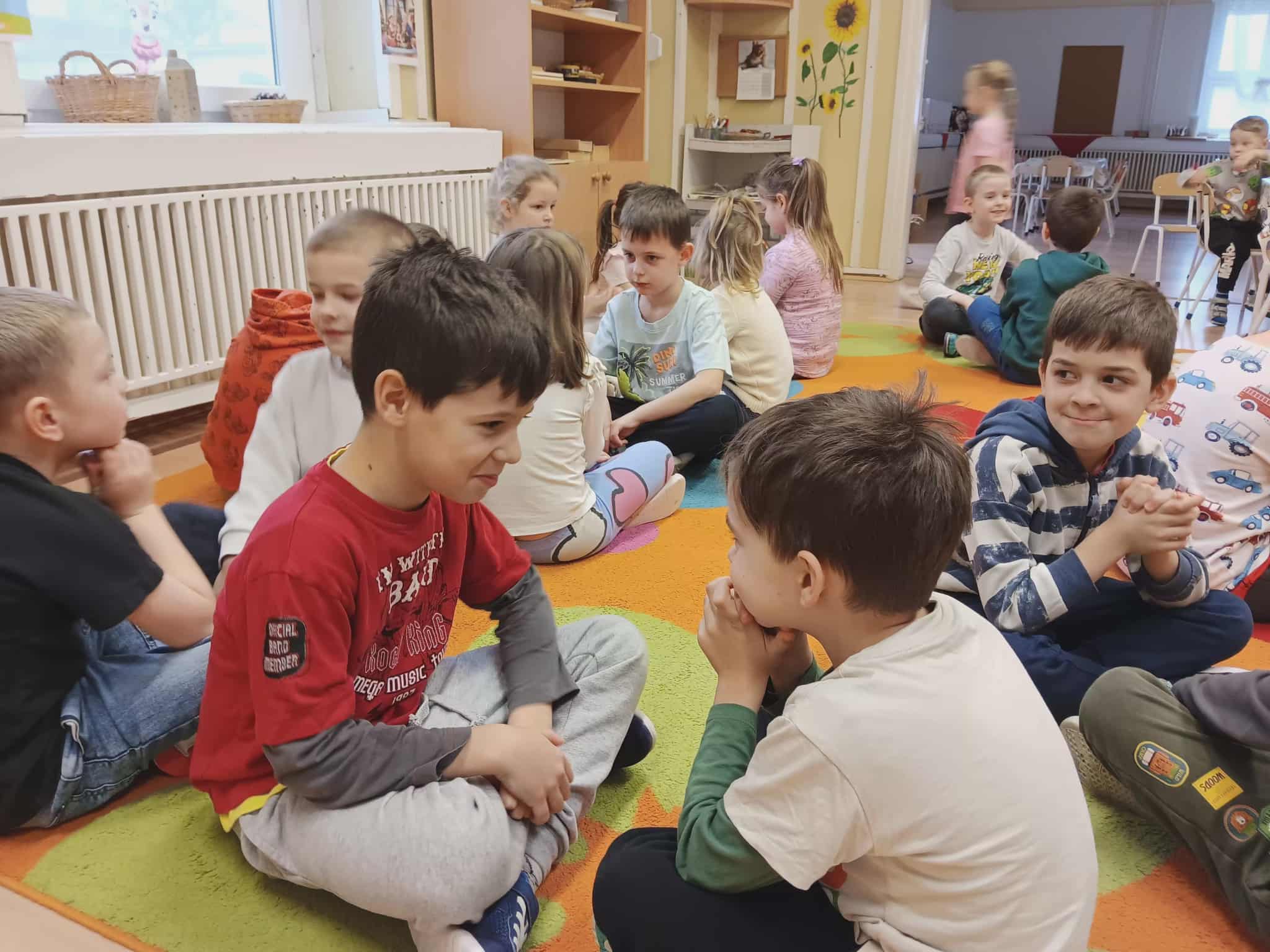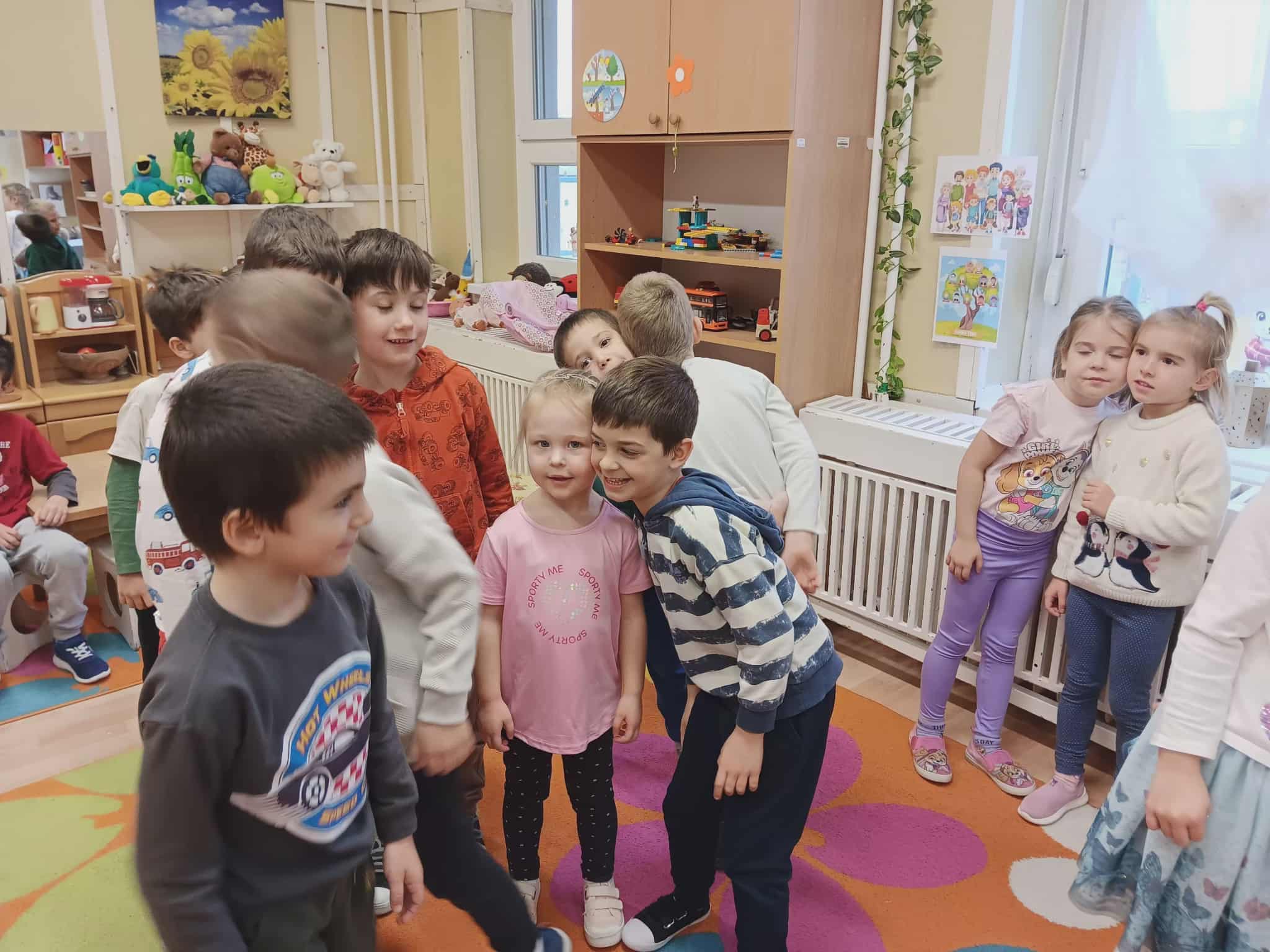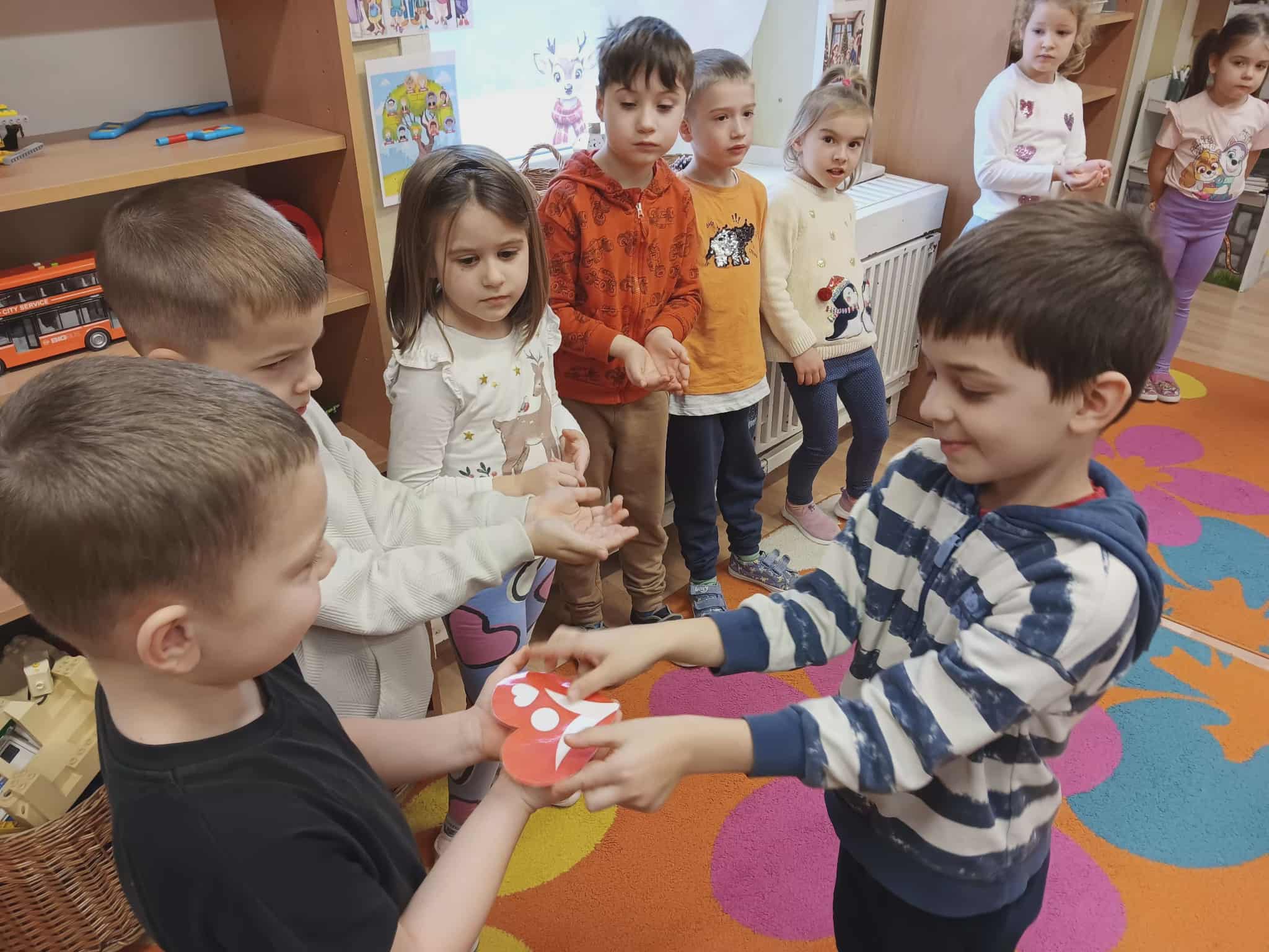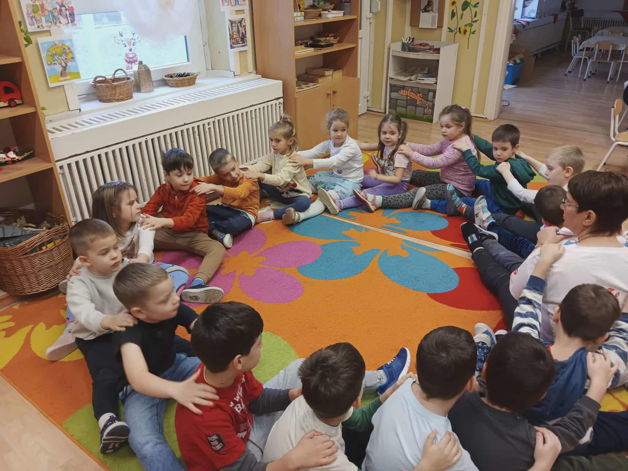 Foglalkozásunk hangulatteremtő, kezdő gyakorlatának egy kötetlen, improvizatív örömtáncot választottam: a Hahó együttes Barátság dal zeneszámára a gyerekek kötetlenül mozoghattak, táncolhattak a térben. Ezt követte a „Szív -küldi” kapcsolatteremtő játék, amely maximálisan segítette a csoportkohézió erősítését , az egymásra való odafigyelést. A játék során tudatosan irányítottuk a figyelmümket arra, hogy a Boldogság szív, mindenkihez eljusson. A „Barátság-ragacs” játék során különösen érvényesült a humor 🙂 . Különböző testrészeinkkel ragadhattunk össze. A játék során fontos szempont volt, hogy minden instrukciónál olyan gyermeket , kispajtást kellett választani, akivel még nem alkottak párt. A játék során maximálisan megvalósult az elfogadás. A Baráti figyelem során kicsit lecsendesedtünk. Koncentrált figyelemmel viszonyultunk egymáshoz, úgy , ahogy a mindennapok során nem biztos, hogy tesszük: megvizsgáltuk egymás kezét, figyeltük a szemét, az arcát. A Tartalak Téged játék során támaszai voltunk egyásnak. És bár a játék lényege a tudatos figyelemben , az egyásra való odafigyelésben rejlik, természetesen most sem maradhatott el a humor-ami lényeges eleme a jó emberi kapcsolatoknak. A boldogságóra foglalkozásunk során most sem maradt el a beszélgető kör, melynek során saját gondolataikat fogalmazták meg a barátsággal kapcsolatban: én és a barátom szeretjük egymást, én és a barátom sokat játszunk, …elmegyünk biciklizni.. sokat beszélgetünk, … megvígasztal…, segít nekem… A „Barátság pizza” humoros, kapcsolatteremtő játék elérte a célját: vidáman, felszabadultan kapcsolódhattak egymáshoz. Foglalkozásunk záró tevékenyégének pedig a „Barátság-csillagok” kereső játékot választottam, mely során érvényesült a közös munka, a kooperáció. És amely erősítette a csoportkohéziót, tudatosította a társak, barátok fontos szerepét.