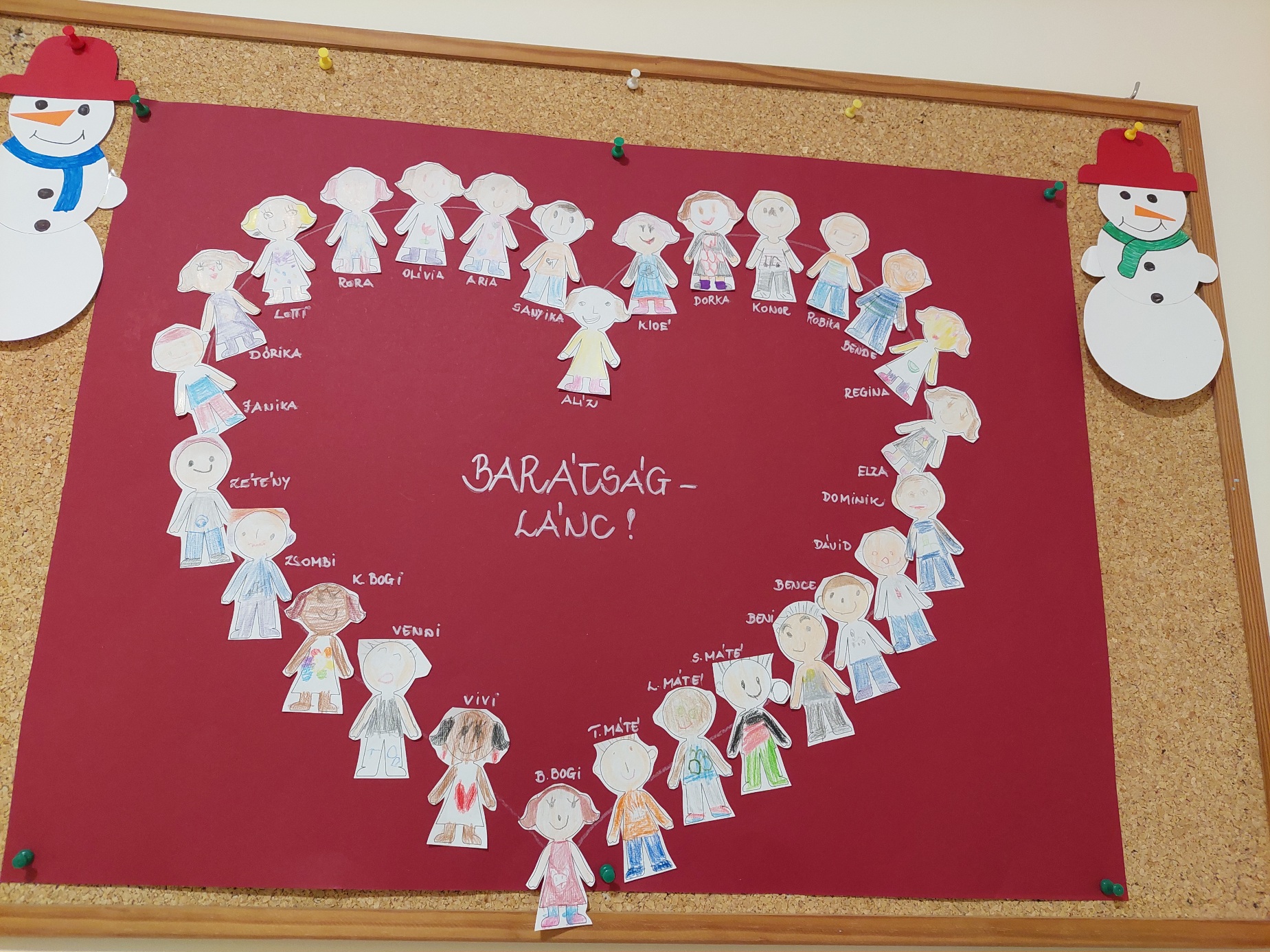 A szülőkkel való közös programok kíváló alkalmak a közösségépítésre. Így alakult ez az adventi készülődés során is. Az egész hetünket átmelegítette, az egymás fontosságának érzékeltetése. A közös percek átélése megerősített minket abban, hogy mennyire fontosak vagyunk egymásnak. A baráti kapcsolatok kifejezésére egy „Szeretetkosarat” készítettem, melyben szívek voltak, és átadhatták a gyermekek egy kedves barátjuknak öleléssel, és kedves szavakkal. Úgyanígy a szülőknek is. Barátságfonalat készítettünk, mely nagyon tetszett a gyermekeknek, szülőknek egyaránt.