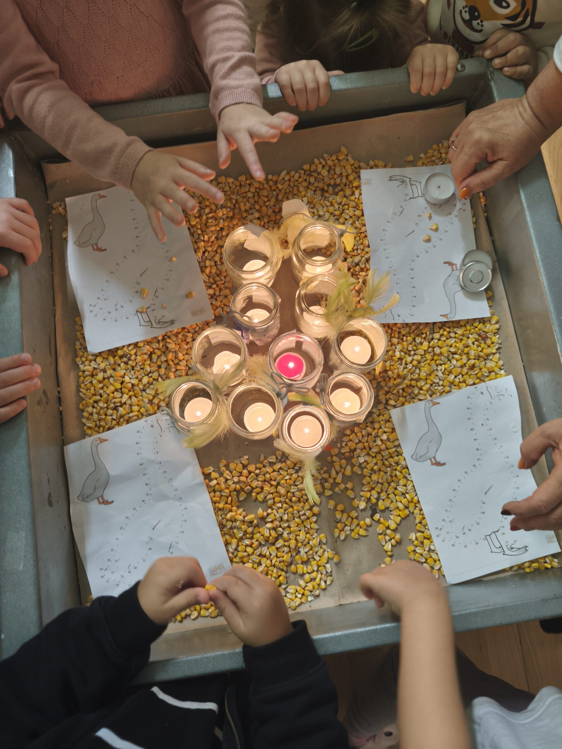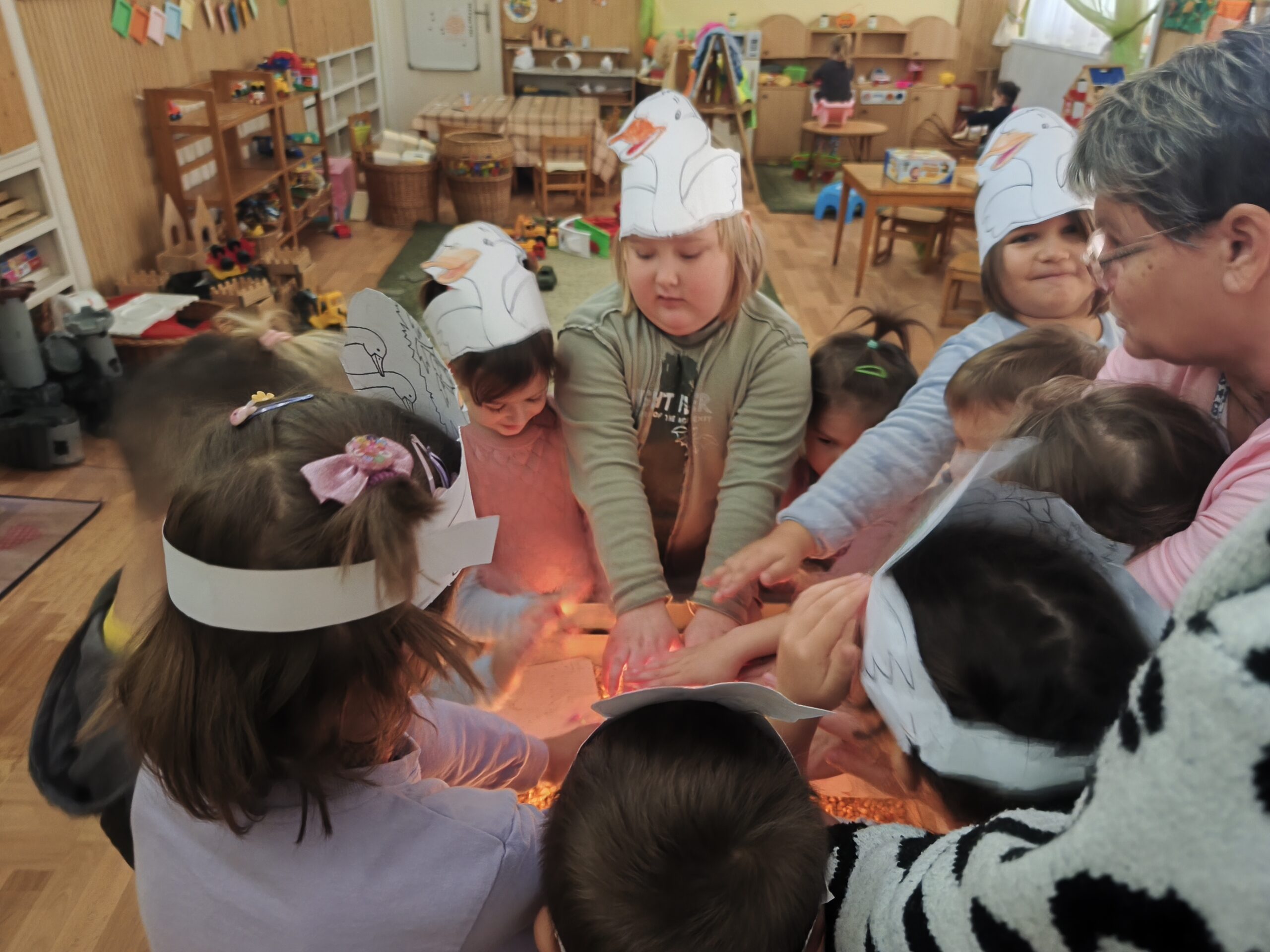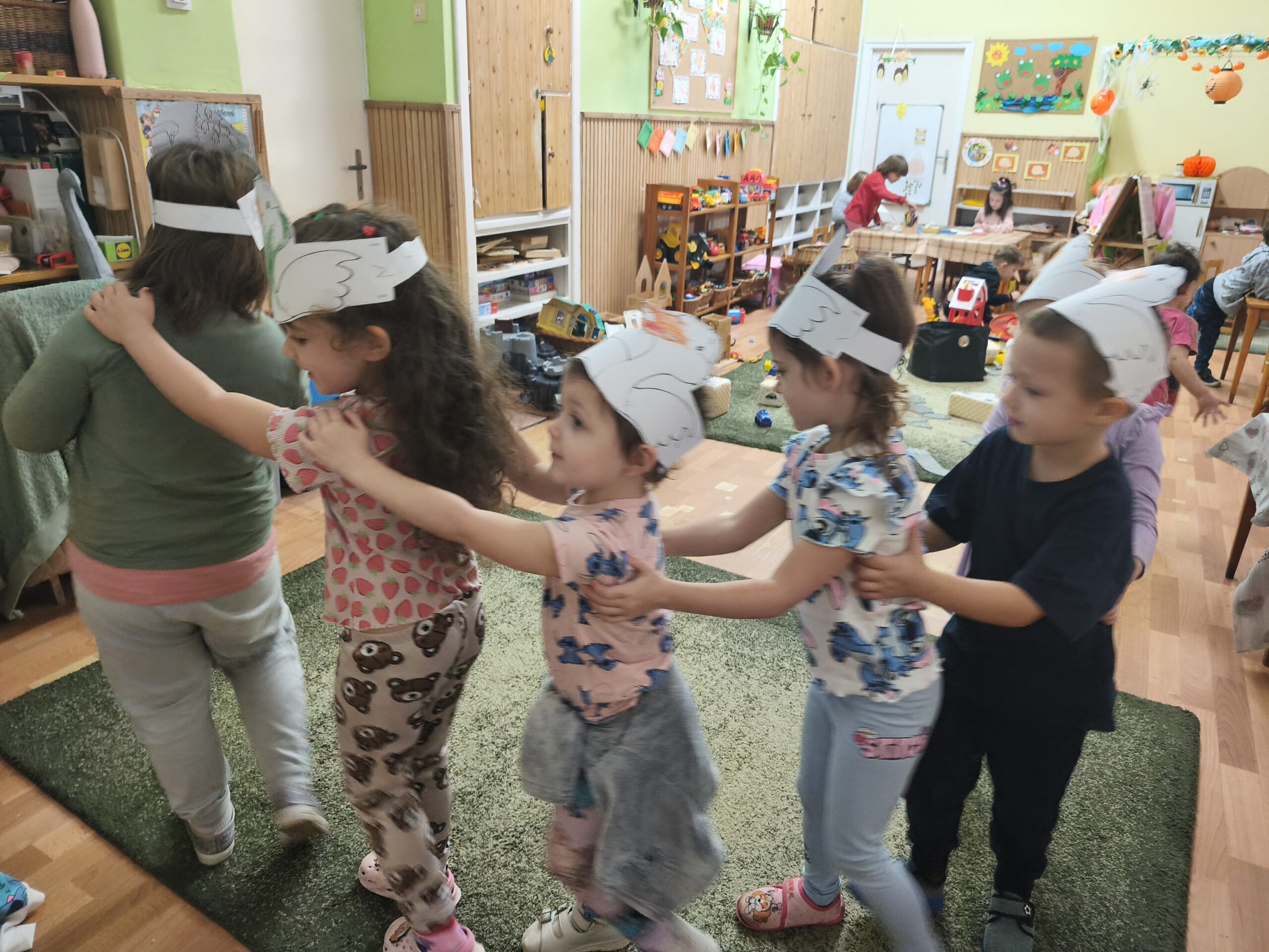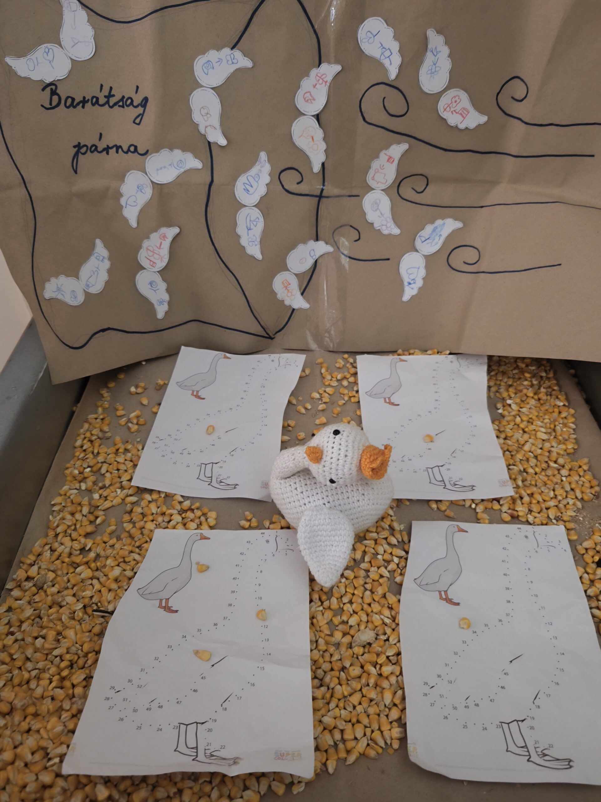 A Márton-napi történetet, annak értékközvetítő (szerénység, jóság, kedvesség, barátság…) szerepét ismertettem meg minden kisgyermekkel valamilyen formában. Közösen tornáztunk, libasorban jártunk különböző göröngyös utakon. Sokféle kézügyességi feladatokkal ismerkedtünk: térbeli libákat, „libabarátokat nyírtunk, ragasztottunk; „barátságnyakláncot” fűztünk tésztából, lámpást készítettünk, mely elvezetett bennünket a jó út felé, s a végén a lámpás melegénél érezhettük az összetartozást jelképező tűz melegségét. Zsíroskenyeret kentünk egymásnak, mikor megéheztünk, átadva a másik pajtásunknak kedvességből, így hangsúlyozva az egymás iránti szeretetünket és kedvességünket. A „szeretetnyelven” (kártya) igyekeztünk kifejezni érzéseinket és megfogalmazni, mi tetszik a másikban, milyennek látjuk egymást. Zárásként „barátságpárnát” készítettünk és zenés, táncos mulatsággal zártuk a hetet. Minden pillanatát élveztem a hétnek, hiszen együtt lehettünk és egymást segíthettük mindenben.