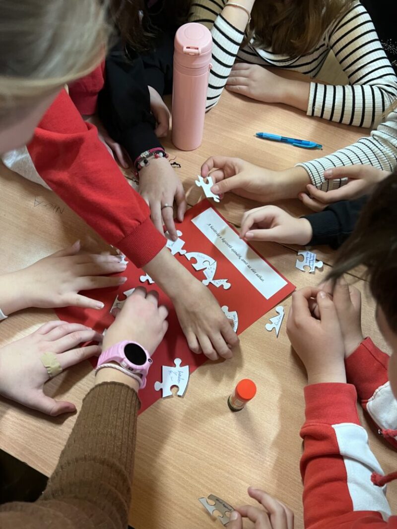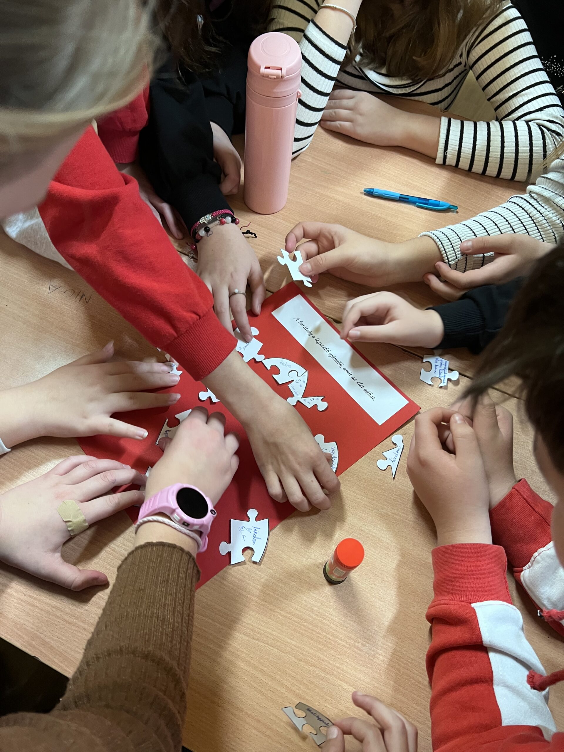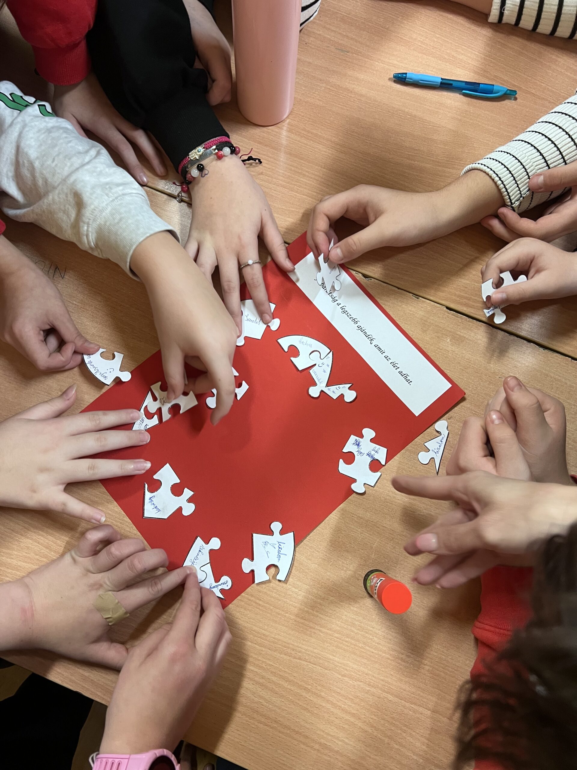A csoporttal először arról beszélgettünk, számukra mi a legfontosabb egy barátságban. Ezeket a gondolatokat kis puzzle-darabokra írták fel: minden darab egy értéket, egy érzést vagy egy jó tulajdonságot jelképezett. A sok külön puzzle-részből végül összeállt az osztály közös „Barátság-szíve”, amely megmutatja, milyen értékek tartják össze a közösségüket.