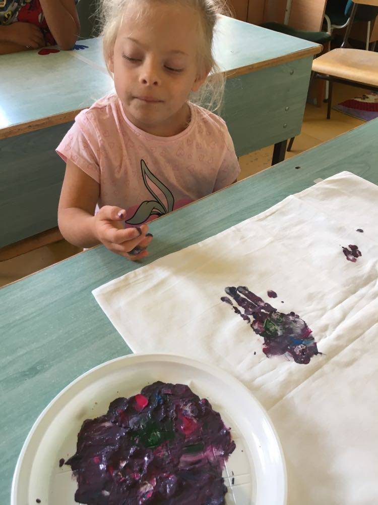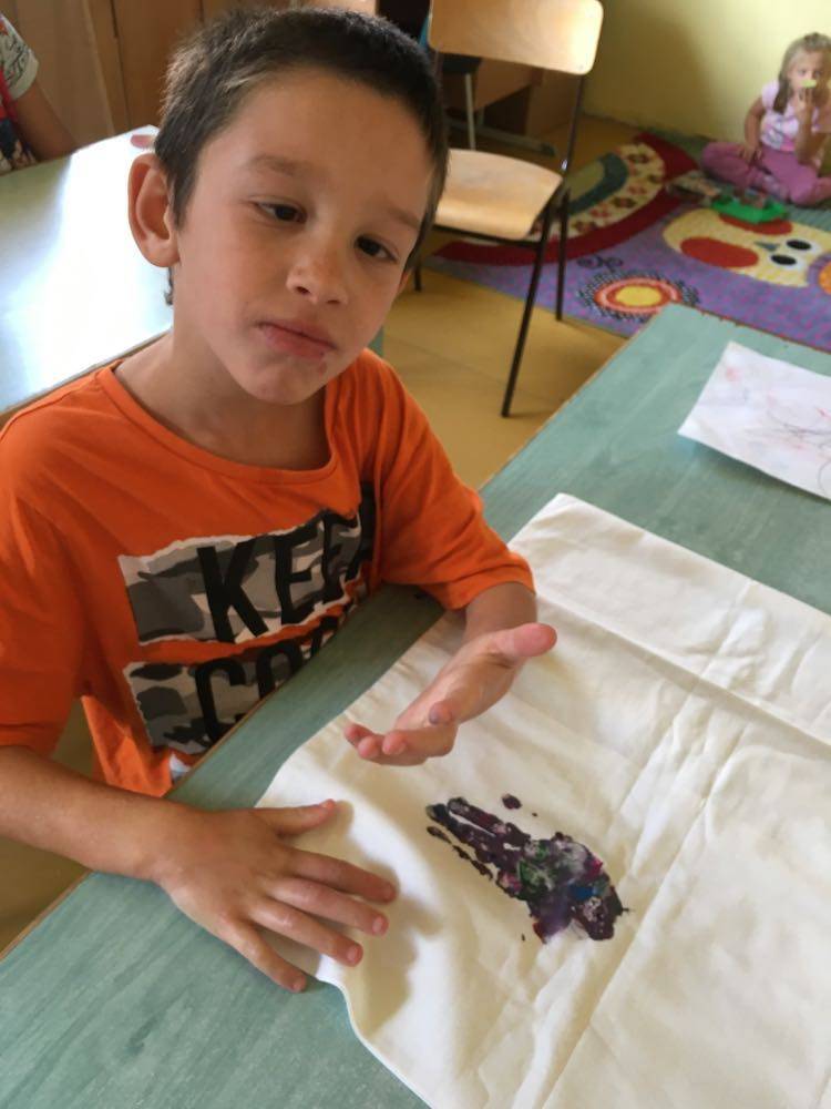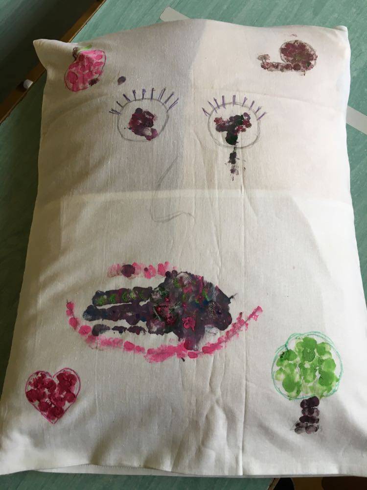 A Bárczi Gusztáv EGYMI Értelmileg akadályozott első b osztályosaival dolgoztunk, és alkottuk meg a hálapárna huzatot. Mosolygós arcot, és néhány ovis jelet rajzoltunk és festettünk ki a gyerekek kicsi kezeikkel. Láttam a rajtuk, hogy tetszett neki, amikor festékesek lettek a kis ujjacskáik. Ügyesek és lelkesek voltak. Köszönjük a lehetőséget, és készülünk az újabb boldog feladat megoldására.