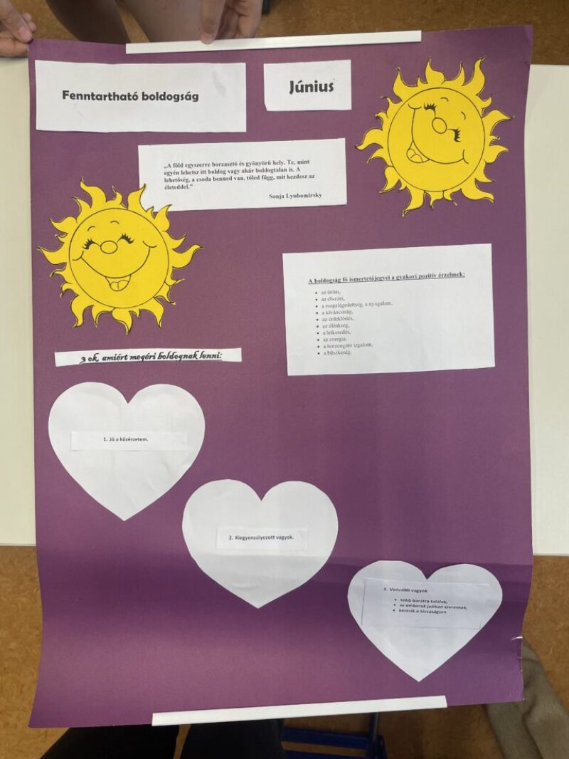 Összességében a gyerekek minden boldogságórán jól érezték magukat, szívesen kapcsolódtak be a feladatokba. Az év során nyitottabbá, elfogadóbbá és tudatosabbá váltak – nemcsak másokkal, hanem saját magukkal szemben is. A boldogságóra valóban segített abban, hogy örömtelibb, empatikusabb közösséget építsük.