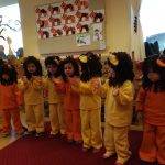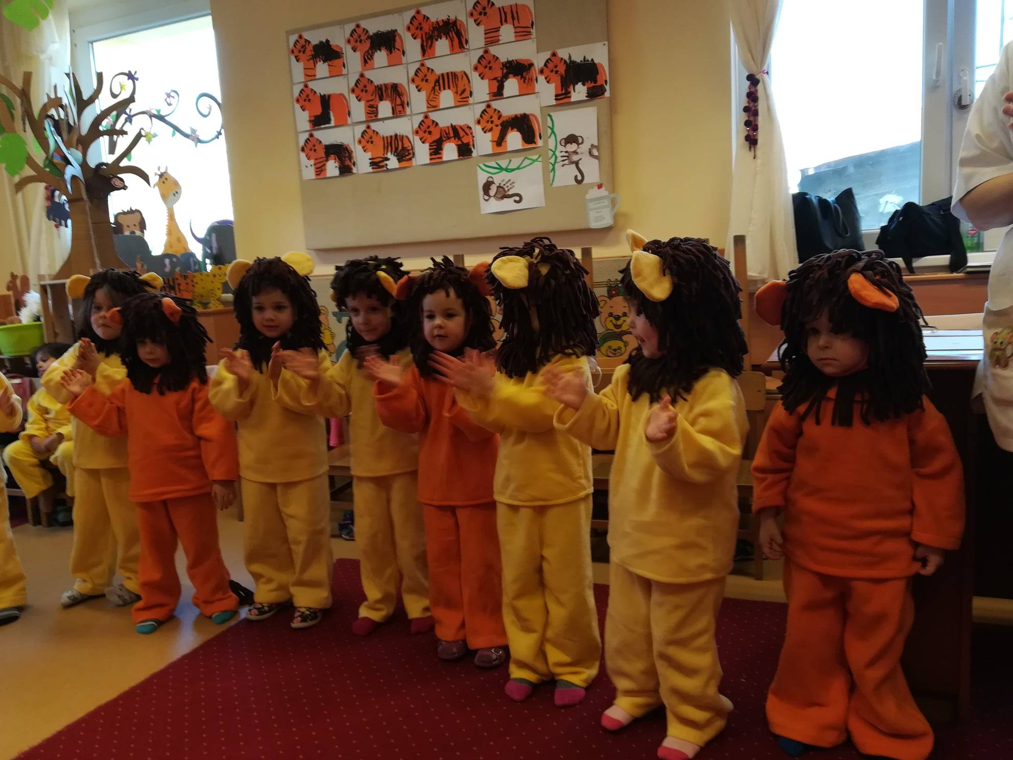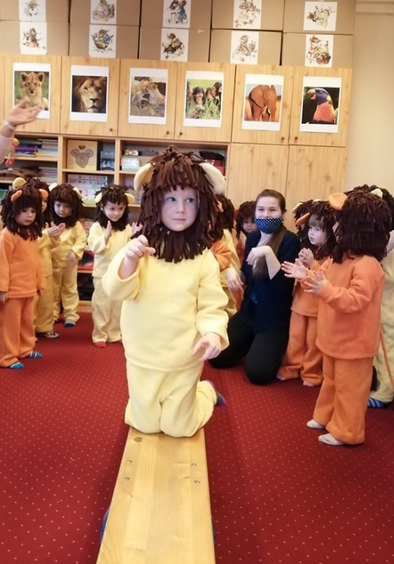 Oroszlános farsangi jelmezünk jól illeszkedett a témához, megbeszéltük, hogy ő az állatok királya, aki igazán erős és mindennel meg tud küzdeni. Belebújtunk a bőrébe, kipróbáltuk hogyan tud ordítani ha mérges, és milyen bátran mászik végig az akadályokon.