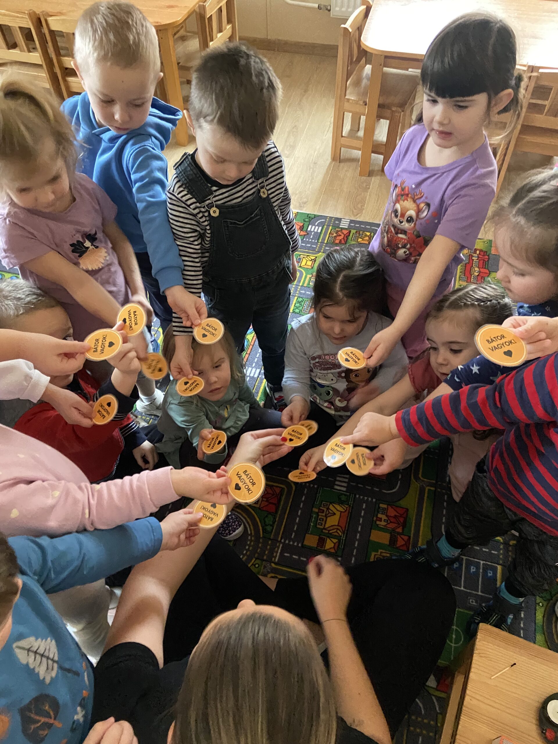 Ráhangolódásként a foglalkozást az ,,Égig érő fa vagyok..” kezdetű mozgásos mondókával kezdtük. Ezt követően egy saját történetet meséltem a gyermekeknek arról, hogy nekem milyen kihívással kellett megküzdenem és ezt hogyan oldottam meg. Kértem, hogy meséljenek ők is ehhez hasonló történeteket. A beszélgetés során erősítettem bennük azt, hogy ha a megpróbáltatásokat megoldottuk, akkor az jó érzéssel tölt el, és boldogabbá tesz minket.