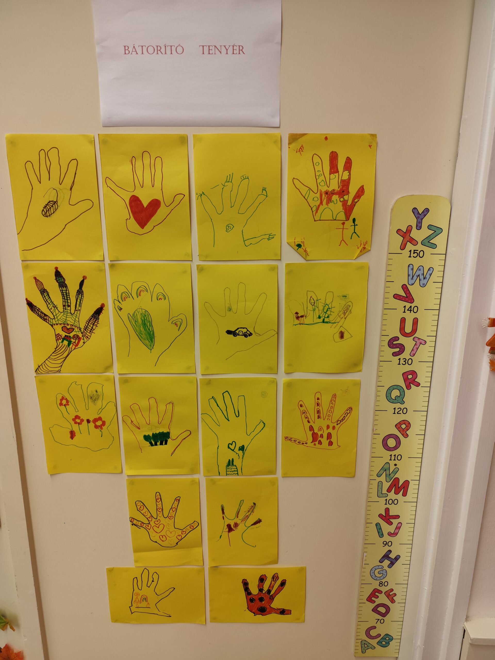 A gyerekekkel megbeszéltem, hogy a tenyerüket rajzolják körbe, és rajzoljanak bele valami bátorítót, kedveset. A legtöbben úgy gondolkodtak, azt rajzolják le ami számunkra is a legkedvesebb, örömmel készültek az alkotások. Megbeszéltük, hogy mindenki a saját gyűjtő dobozában tárolja, és ha valamelyik társuk szomorú, ezzel kedveskednek nekik. Volt aki nem felejtette el a hetek során és azonnal elővette a rajzát és vitte a szomorú társának, a gyerekek többségét emlékeztetni kellett. Megbeszéltük, hogy egy bátorító öleléssel, kedves, biztató szavakkal is jókedvre deríthetik egymást.