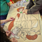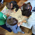 A mese feldolgozását egy meglepetéssel folytattuk: közösségi kifestőt készítettem, ügyelve arra, hogy minden kis kedvencük szerepeljen rajta. A gyermekek örömmel láttak neki a közös a színezésnek. A kifestő lassan megtelt színekkel és igazi közösségi élménnyé vált, amelyben újra átélhettük az együttműködés, türelem és az egymásra figyelés pillanatait. A színezőnk pasztellkrétával készült, ami teljesen új élmény és igazi megküzdés volt számukra. A puha kréta kezelése és a színek keverése eleinte nehézséget okozott, de az idő előrehaladtával egyre bátrabban mélyültek el az alkotás világában.