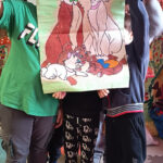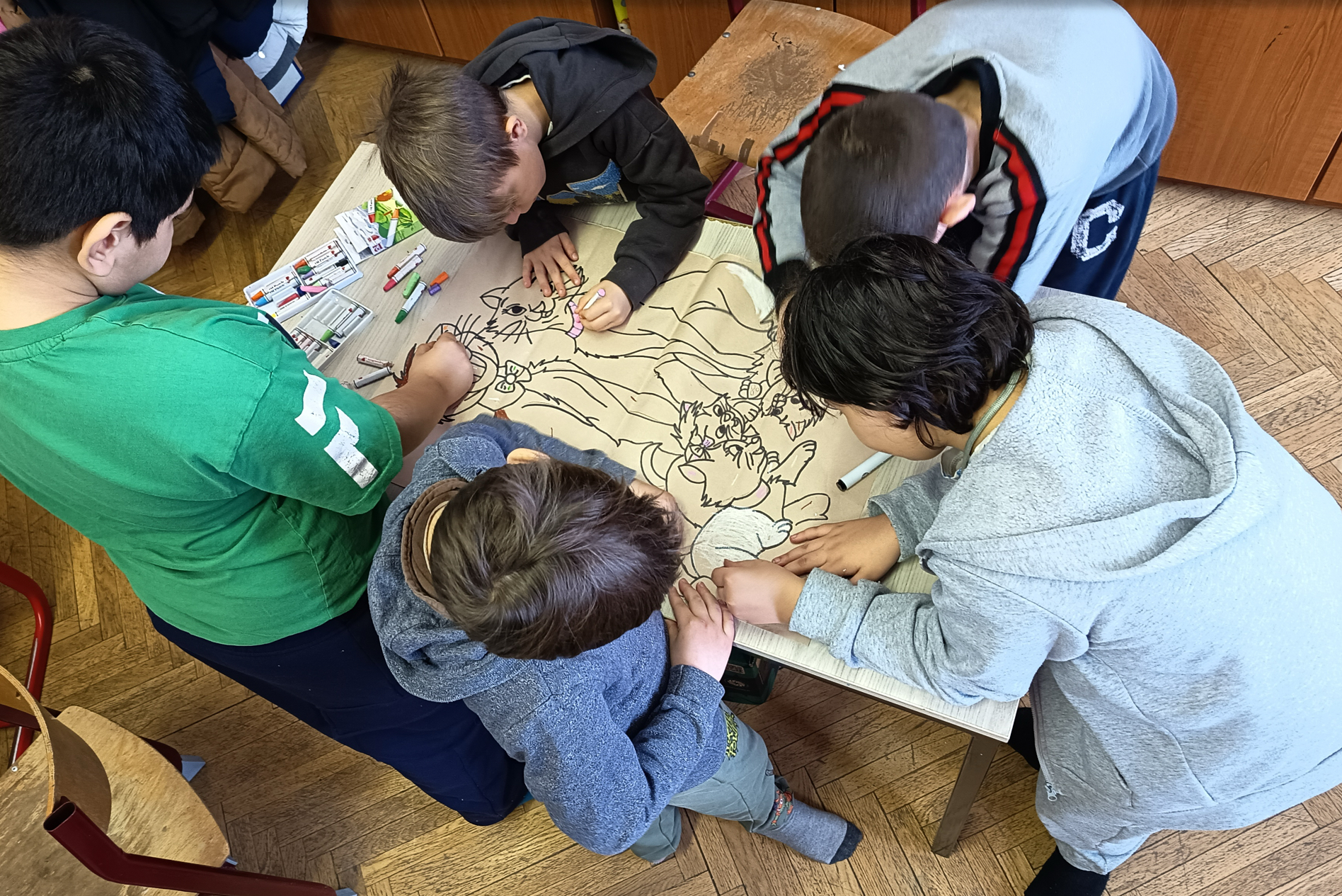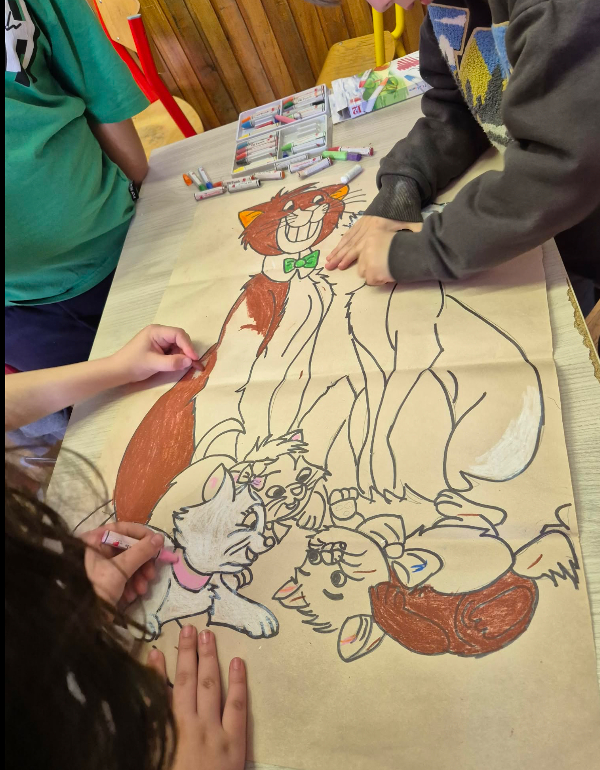 A mese feldolgozását egy meglepetéssel folytattuk: közösségi kifestőt készítettem, ügyelve arra, hogy minden kis kedvencük szerepeljen rajta. A gyermekek örömmel láttak neki a közös a színezésnek. A kifestő lassan megtelt színekkel és igazi közösségi élménnyé vált, amelyben újra átélhettük az együttműködés, türelem és az egymásra figyelés pillanatait. A színezőnk pasztellkrétával készült, ami teljesen új élmény és igazi megküzdés volt számukra. A puha kréta kezelése és a színek keverése eleinte nehézséget okozott, de az idő előrehaladtával egyre bátrabban mélyültek el az alkotás világában.