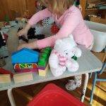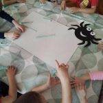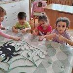 A gyerekeknek bátorságpróbát kellett teljesíteniük. Előző nap elrejtettem a plüssállatokat, majd másnap reggel megérkezett Pók néni levele, melyet felolvastam nekik. A gyerekek izgatottan várták mit rejthet a levél.ó, és hogyan szerezhetjük vissza a plüssjátékokat. Énekeltünk, verseltünk Pók néninek, és végül egy óriás pókhálót készítettünk neki gyurmából, hogy tudjon hol pihenni. Miután visszaszereztük a plüss állatokat, a gyerekek építőkockából tornyokat kezdtek el építeni közösen. Végül a tevékenység lezárásaként megismerkedtünk a megküzdési stratégiák jelével, melyet kiszínezhettek a gyerekek.