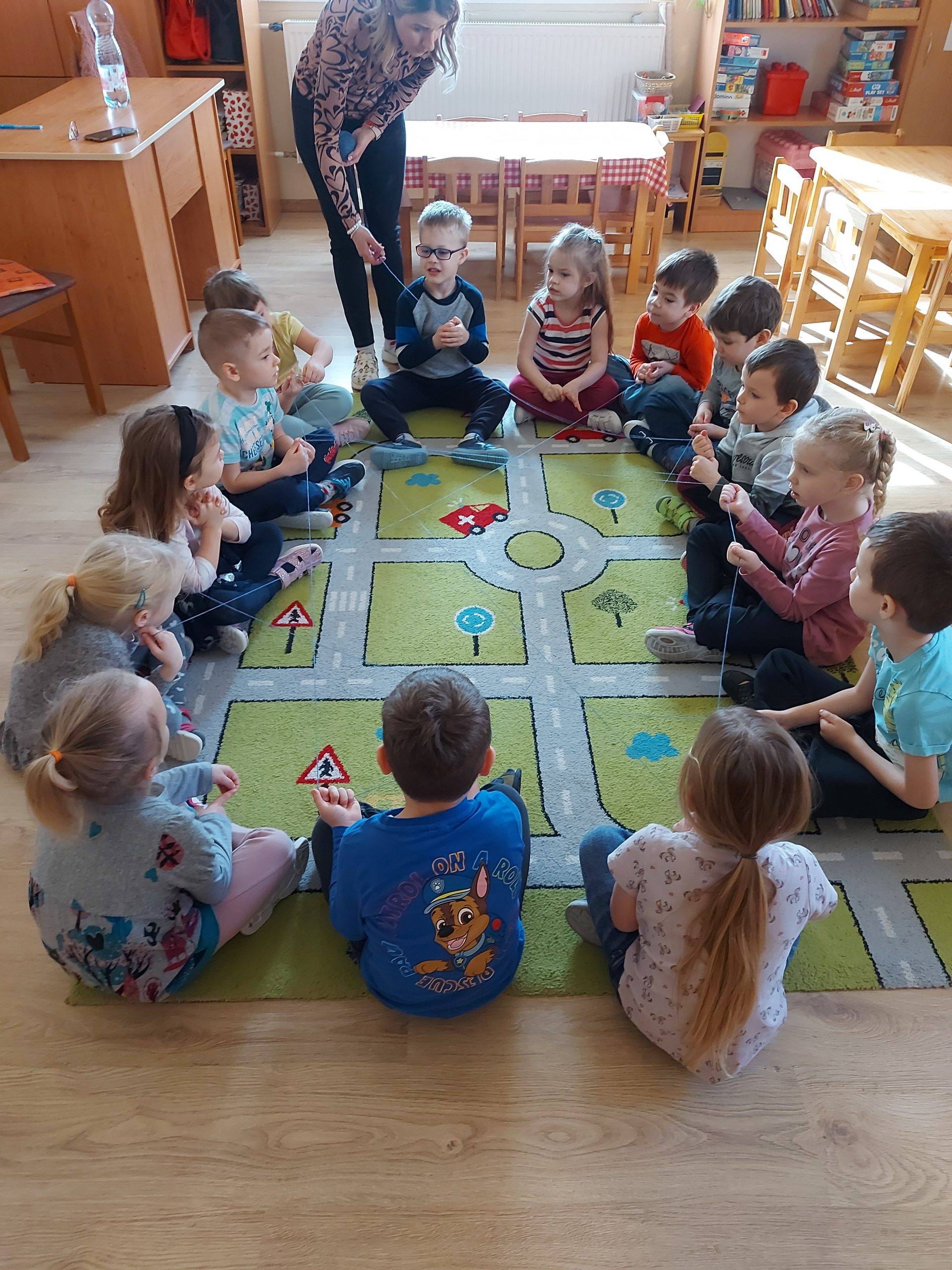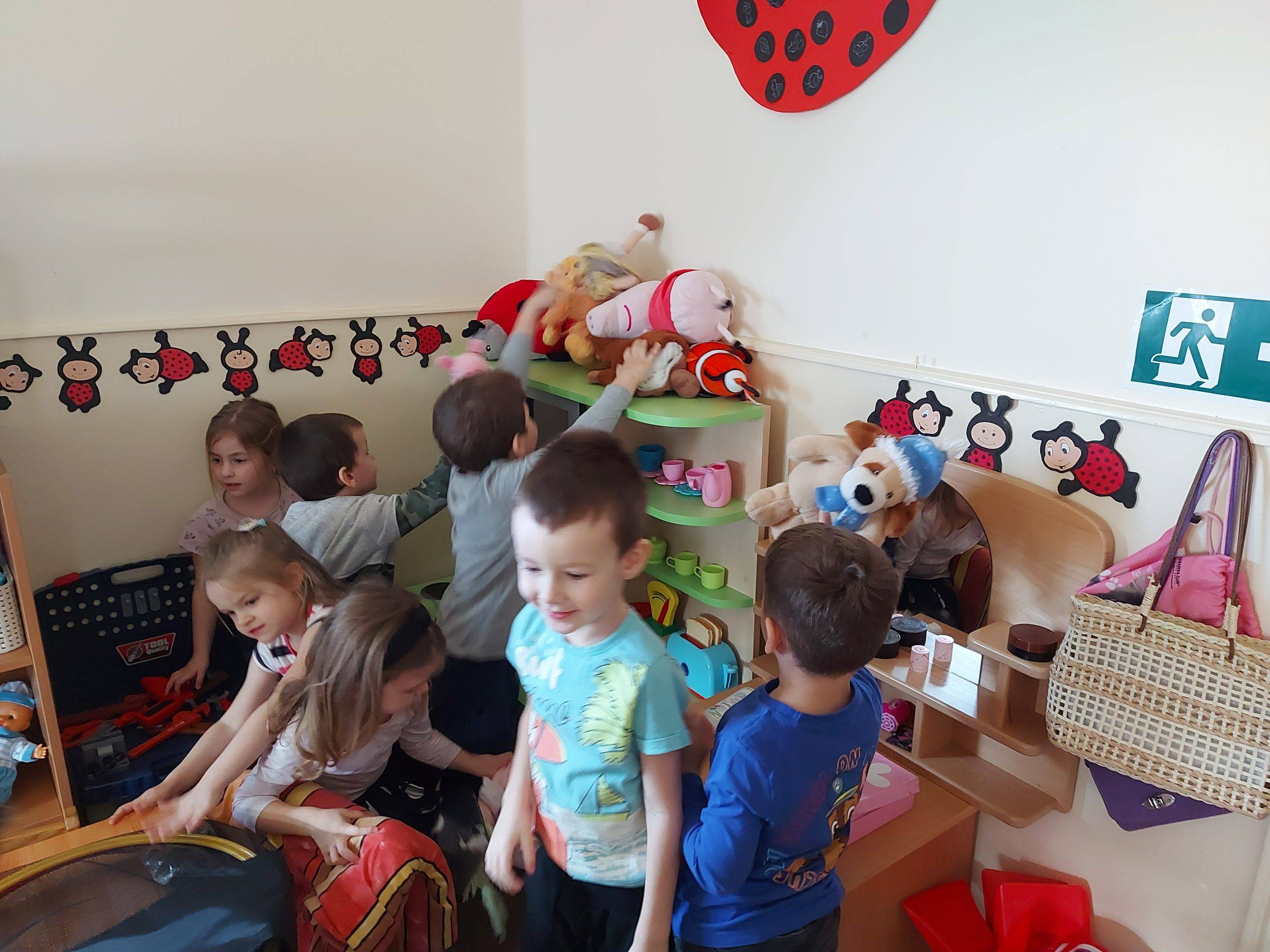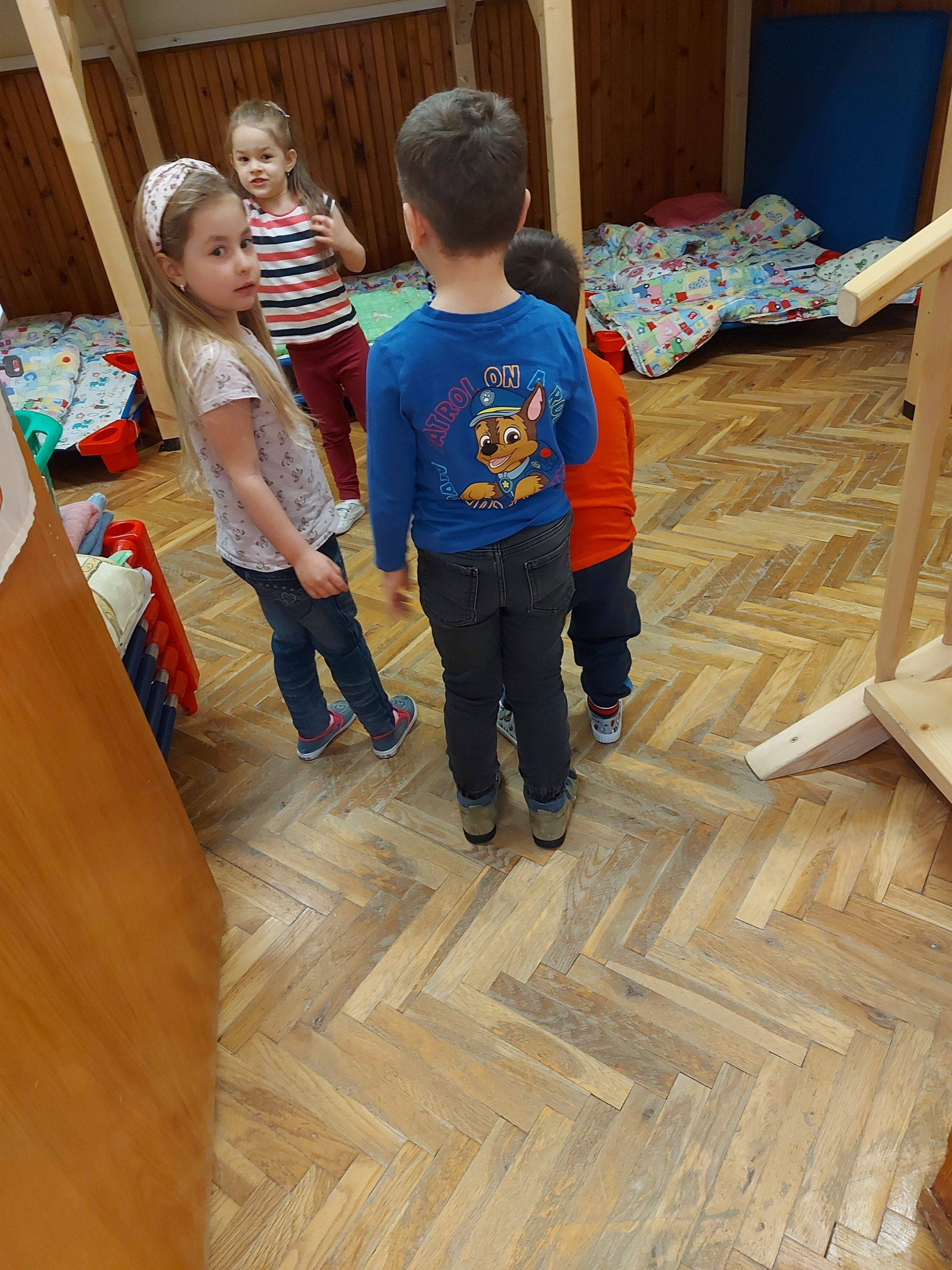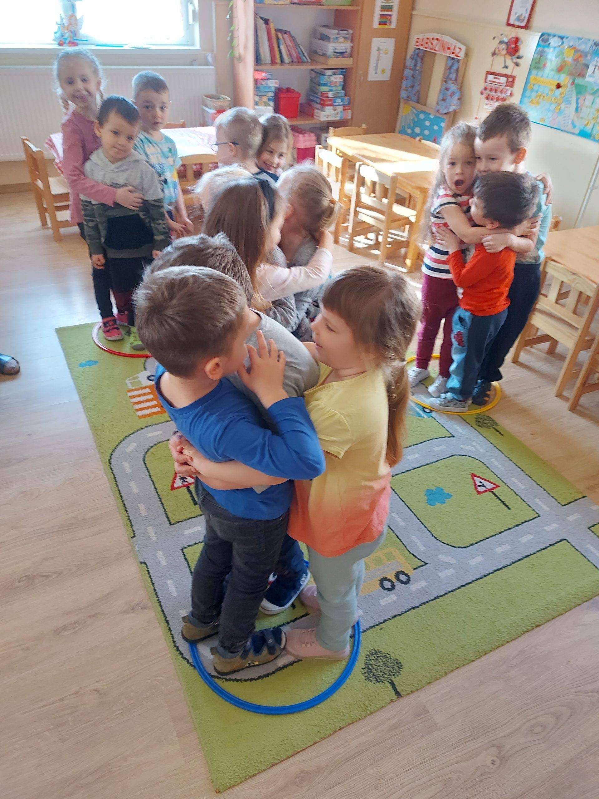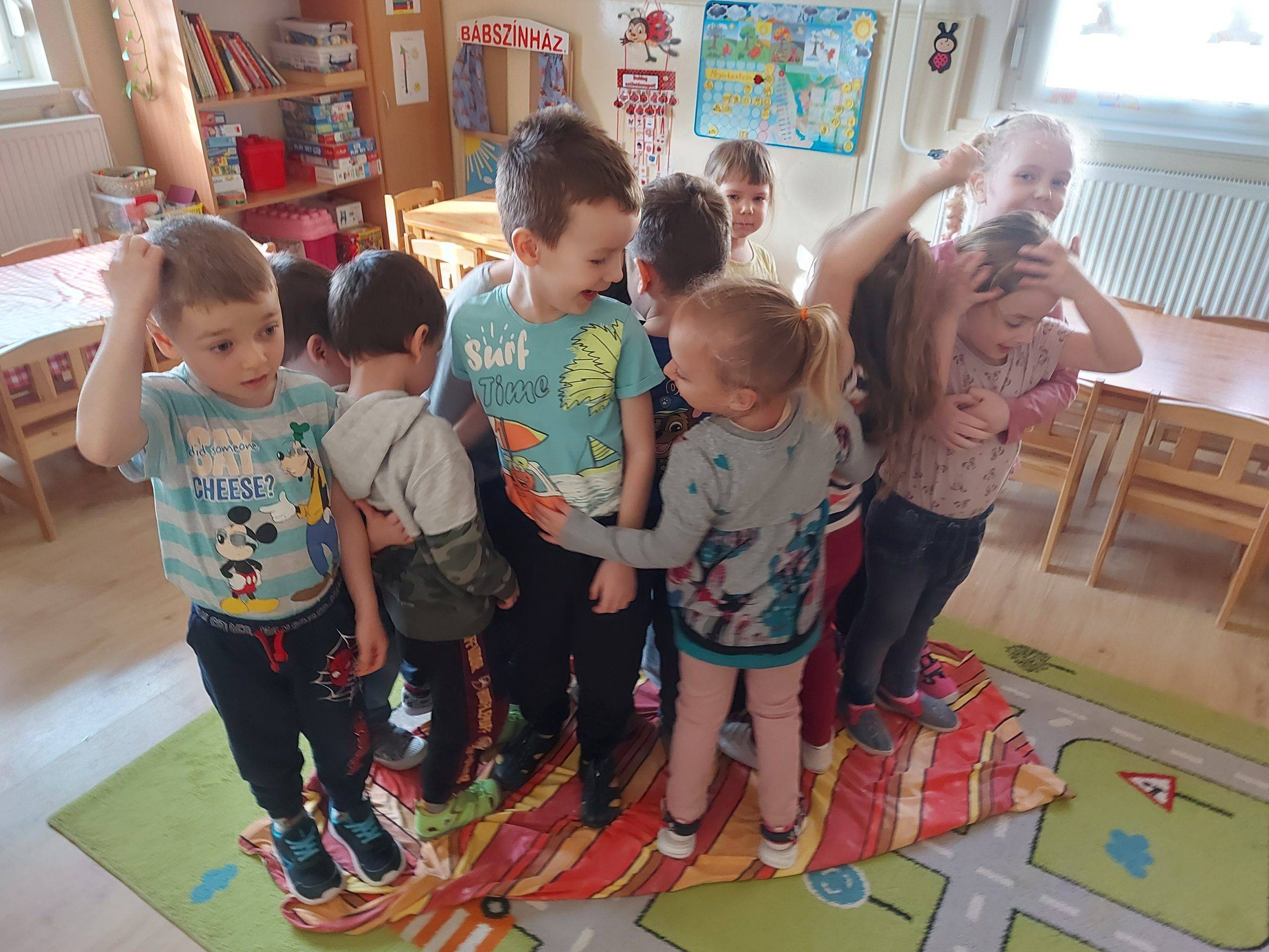A februári boldogságórát ráhangolódásként a Hajótörés játékkal kezdtük: egy színes lepedő volt a hajónk, ami zenehallgatás közben egyre jobban összement. Amikor elállt a zene, fel kellett rá férnünk minél többen. A lepedő legkisebb formájára is szűkösen, de ráfértünk mindannyian. Szorosan ölelték egymást, hogy senki ne essen a képzeletbeli tengerbe.