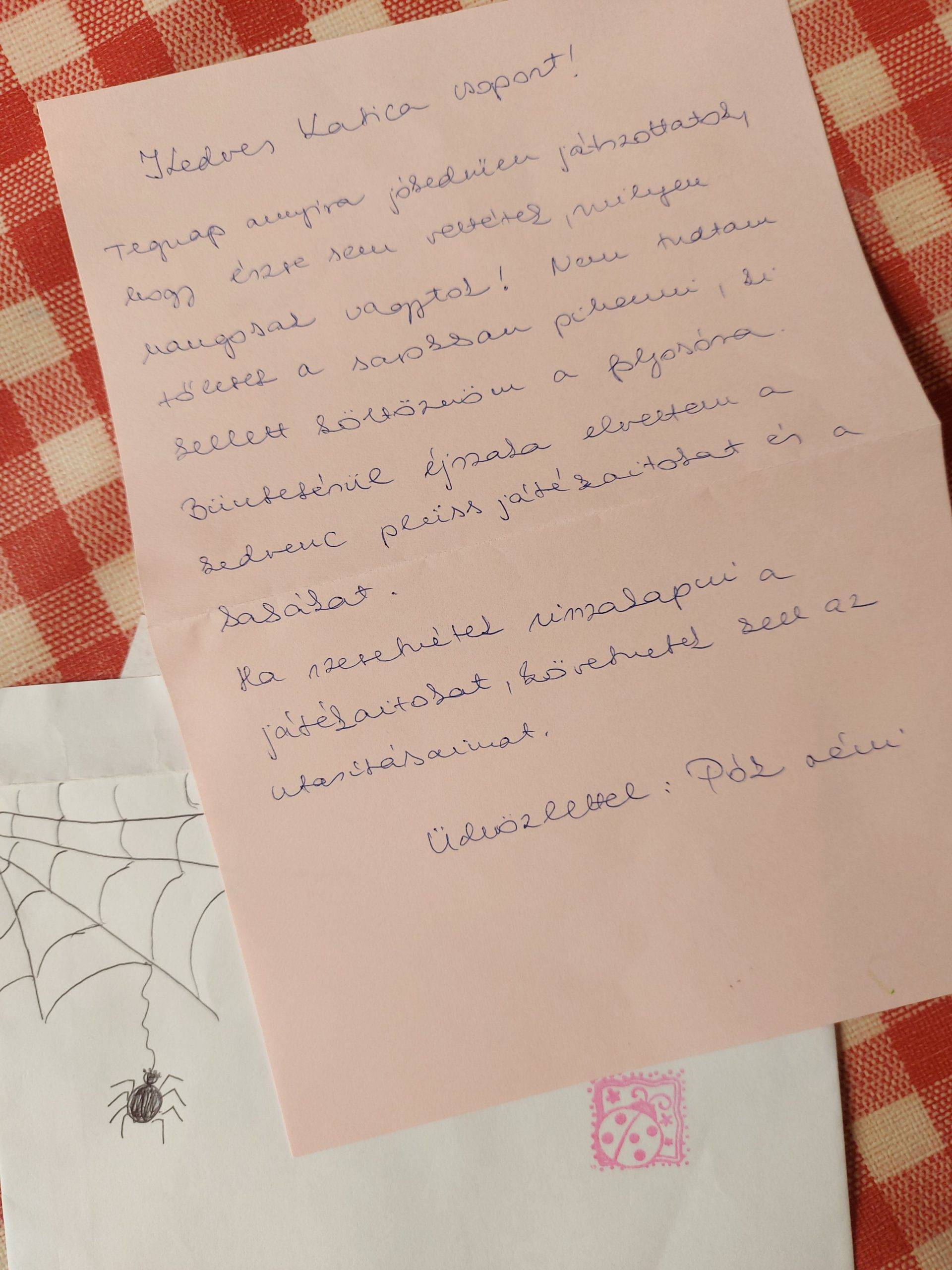 Ezt követte a mi Bátorságpróbánk. Már kora reggel elrejtette a dajka nénik a plüss állatokat, és mire megérkeztek a gyerekek, már csak az üres polc fogadta őket. Azonnal keresésbe kezdtek, hogy hová tűnhettek vagy ki vihette el őket: rabló, szellem, szörny és az épp berepülő légy is meg lett gyanúsítva. Nyomozásba kezdtek, minden gyanús nyomot követni kezdtek (szösz a szőnyegen, apró karc a parkettán). Csapdát állítottak és várták, hogy hátha újra jön a „tettes”. Már a rendőrséget is értesíteni akarták, de megbeszéltük, hogy tízórai után közös nyomozásba kezdünk. Mondtam a gyerekeknek, hogy levelet kaptunk és felolvastam nekik. A gyerekek zöme teljesen ámulatba esett, hogy Pók néni milyen üzenetet írt nekünk és nagyon izgatottak lettek, hogy miként tudjuk visszakapni a plüss játékokat. A bátorságpróba alkalmával minden feladat után kiléptem a folyosóra (fokozva ezzel a hangulatot), megkérdezni Pók nénit, hogy jól teljesítettük-e, a gyerekek pedig síri csendben várták Pók néni válaszát. Énekeltünk, verseltünk neki, megmozgattuk magunkat és közösen szőttünk neki egy óriás pókhálót fonalból, hogy legyen hol aludnia.