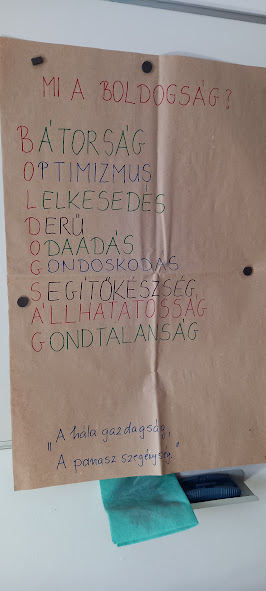 Mindenki kitöltötte a „Mennyire igaz rád?” feladatlapot, amit aztán együtt megbeszéltünk. Érdekes volt hallani, ki hogyan látja magát, és milyen dolgok kapcsolódnak a boldogság érzéséhez. A boldogság szó betűivel közösen kerestünk olyan kifejezéseket, amelyek ehhez az érzéshez kötődnek – a gyerekek sok kreatív és vidám ötlettel álltak elő.