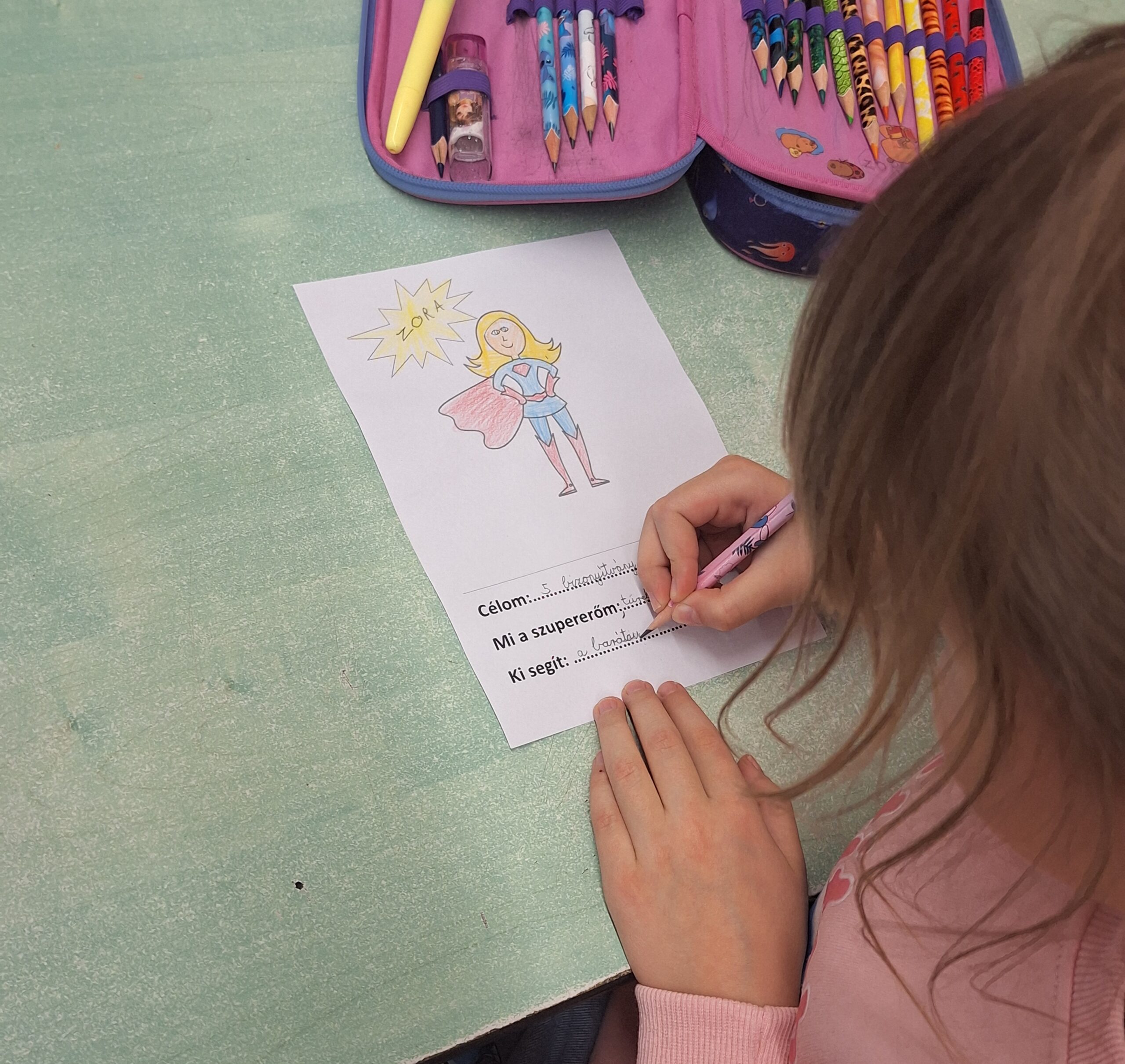 A boldogító erősségkártyák bevezetésével, begyakorlásával felfedezték magukban azokat a képességeket, amik segíthet a célok elérésében. Majd kerestünk olyan célokat, amiket szívesen kitűznének maguknak. Majd kerestünk segítőket, akik az úton segítenek nekik, ha elakadnának, vagy ha a motivációjuk csökkenne. Erre készítettek egy szuperhős rajzot is, amit kiragasztottunk az osztályban, hogy minden nap erőt tudjanak meríteni belőle.