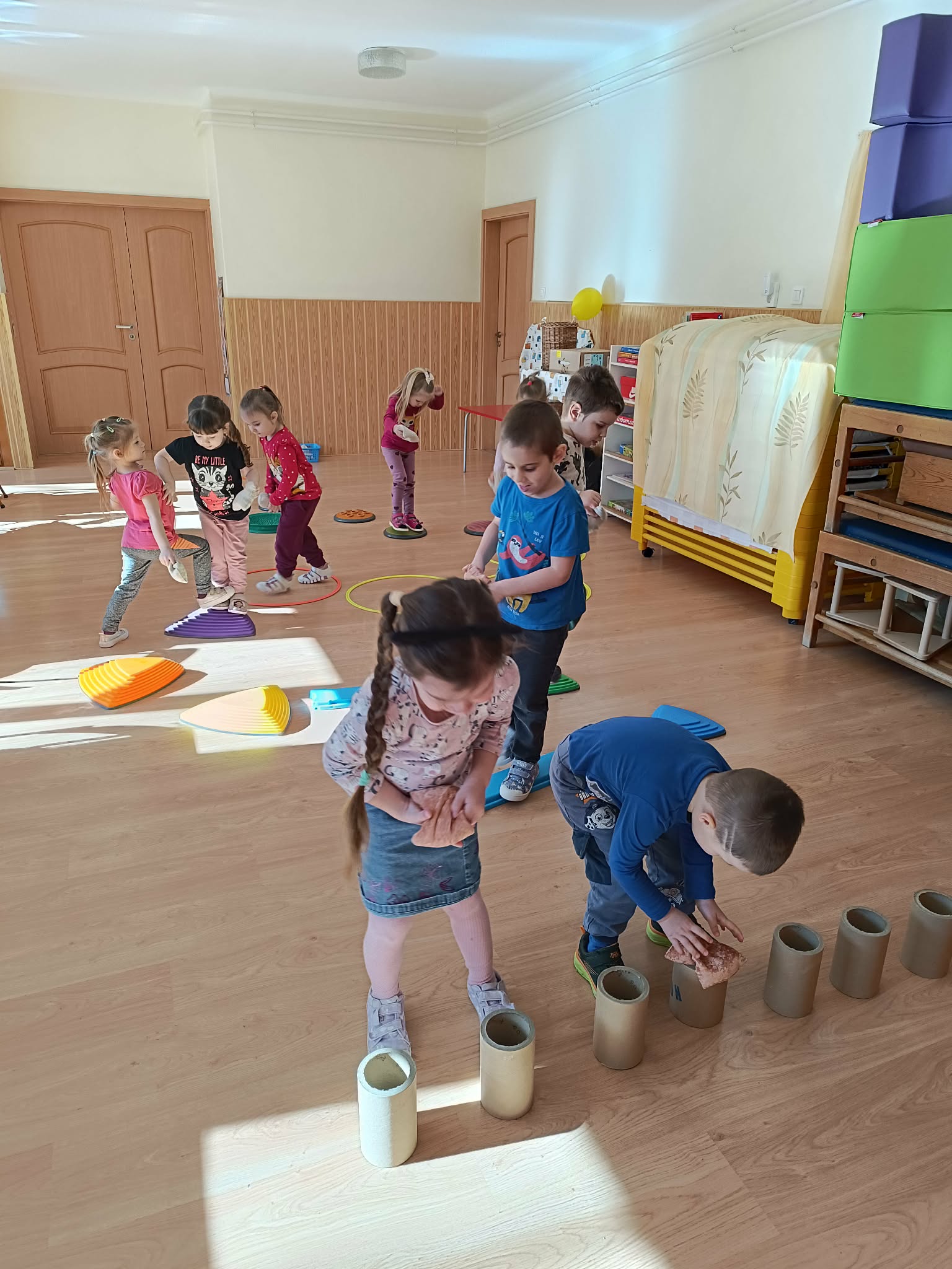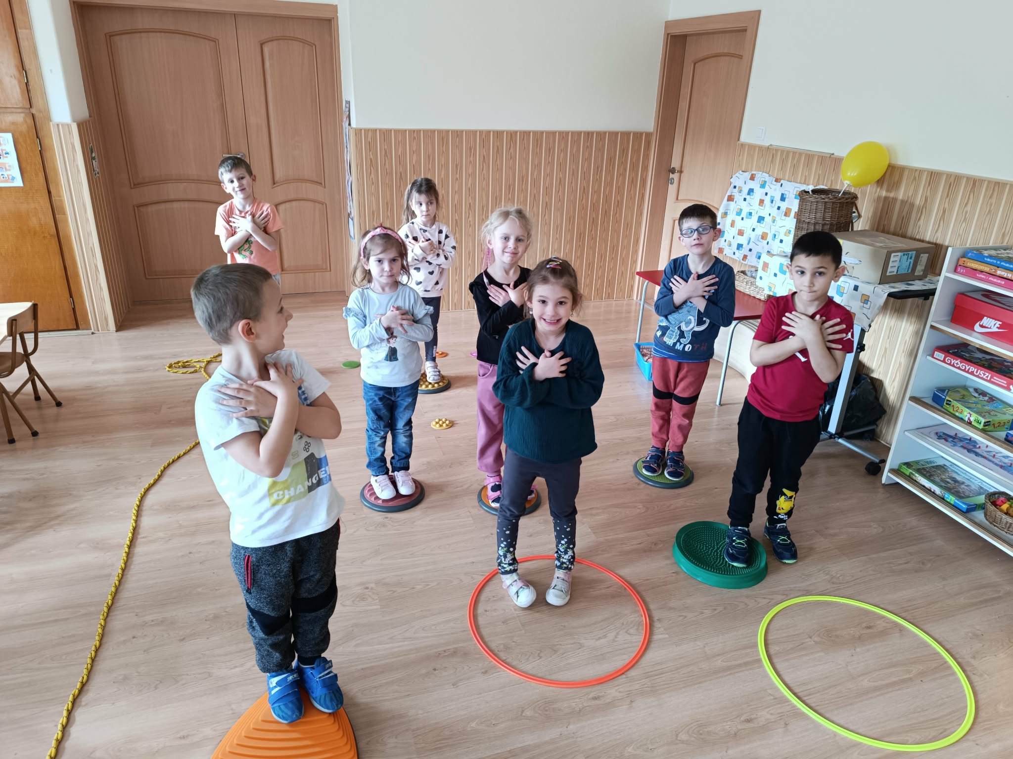Pillangóölelés: A zene hallgatása közben bevezettük a pillangóölelést. A gyerekek keresztezett karral, ütemesen veregették a vállaikat, miközben azt suttogták: „Biztonságban vagyok, megnyugszom.” Ez a technika segít az érzelmi önszabályozásban és a stressz gyors csökkentésében.