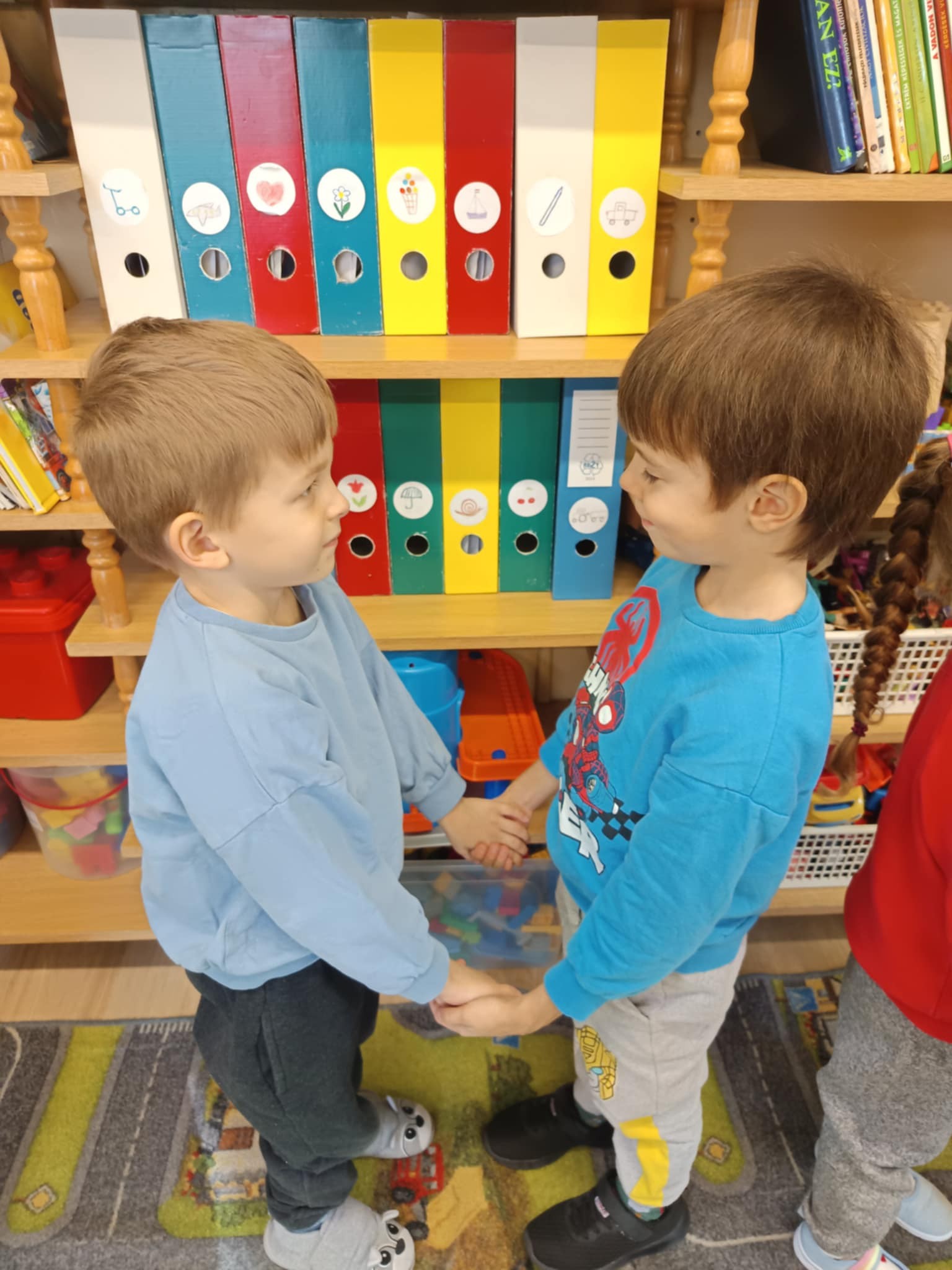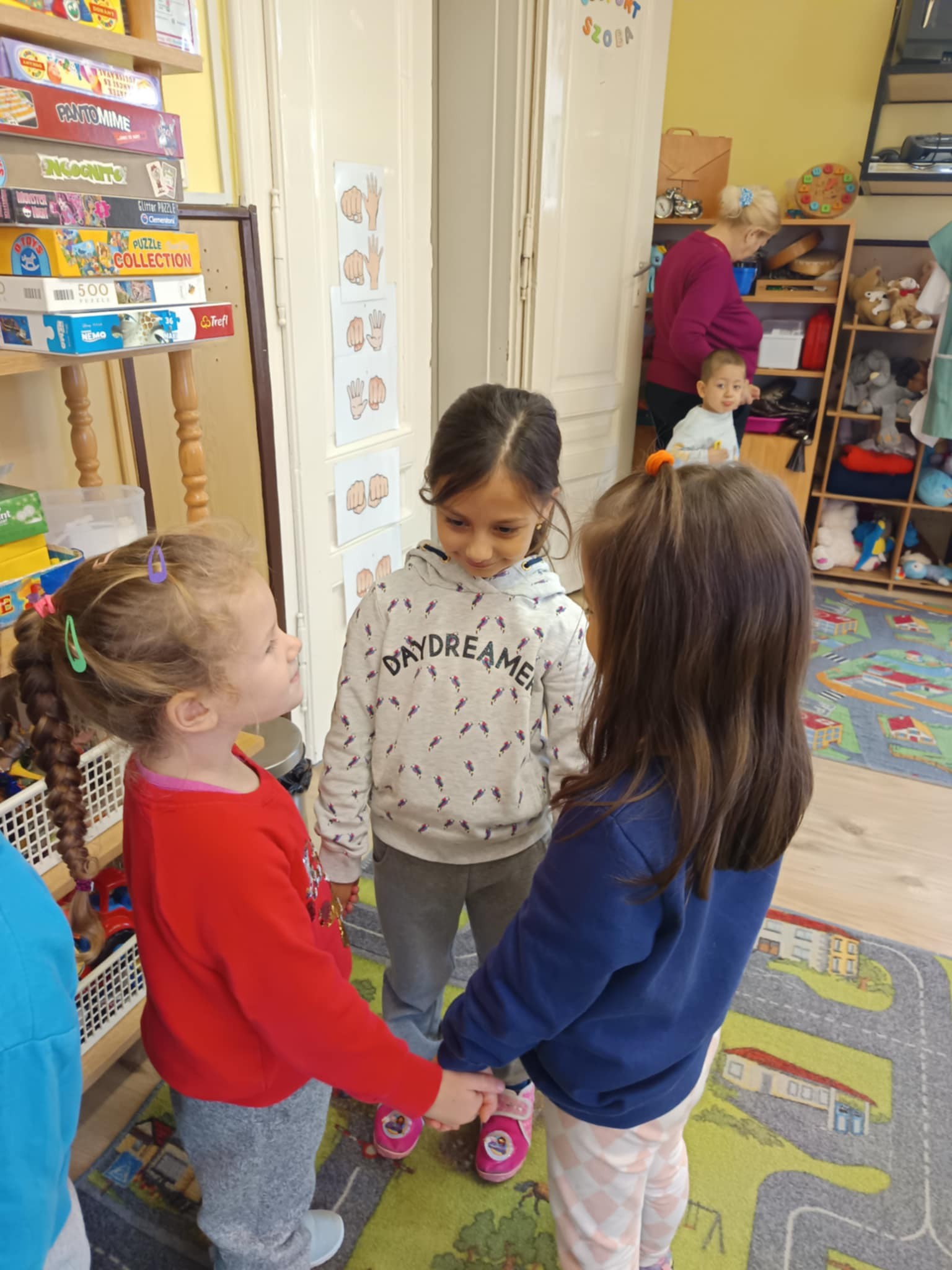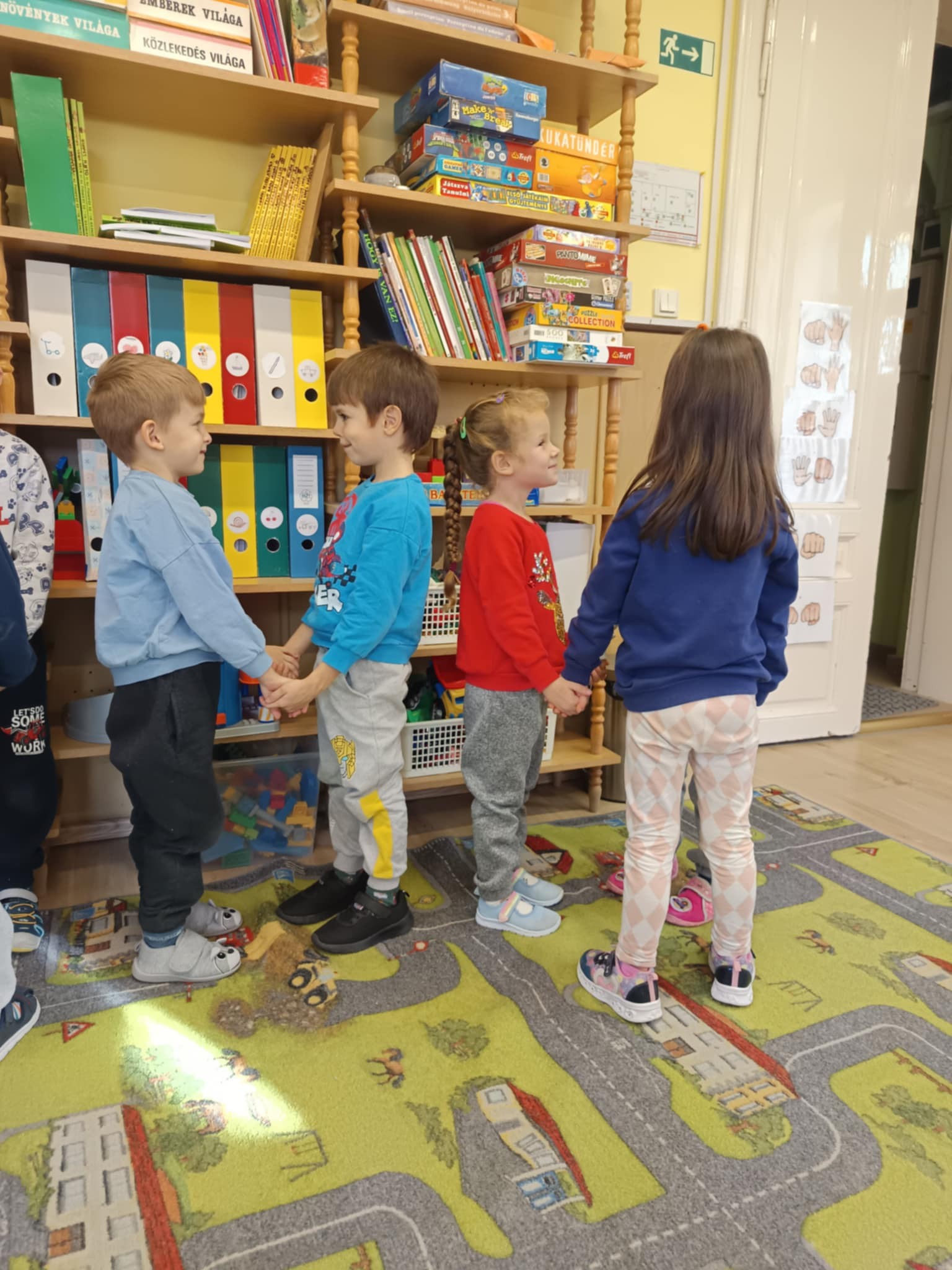 Ezután körjátékban folytattuk, ahol a gyerekek egymás felé fordulva megkérdezték: „Kisbarátom, hogy vagy?” A válaszok egyszerűek voltak, de őszinték – a gyerekek örömmel hallgatták meg egymást, és megtapasztalták az egymásra figyelés fontosságát.