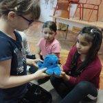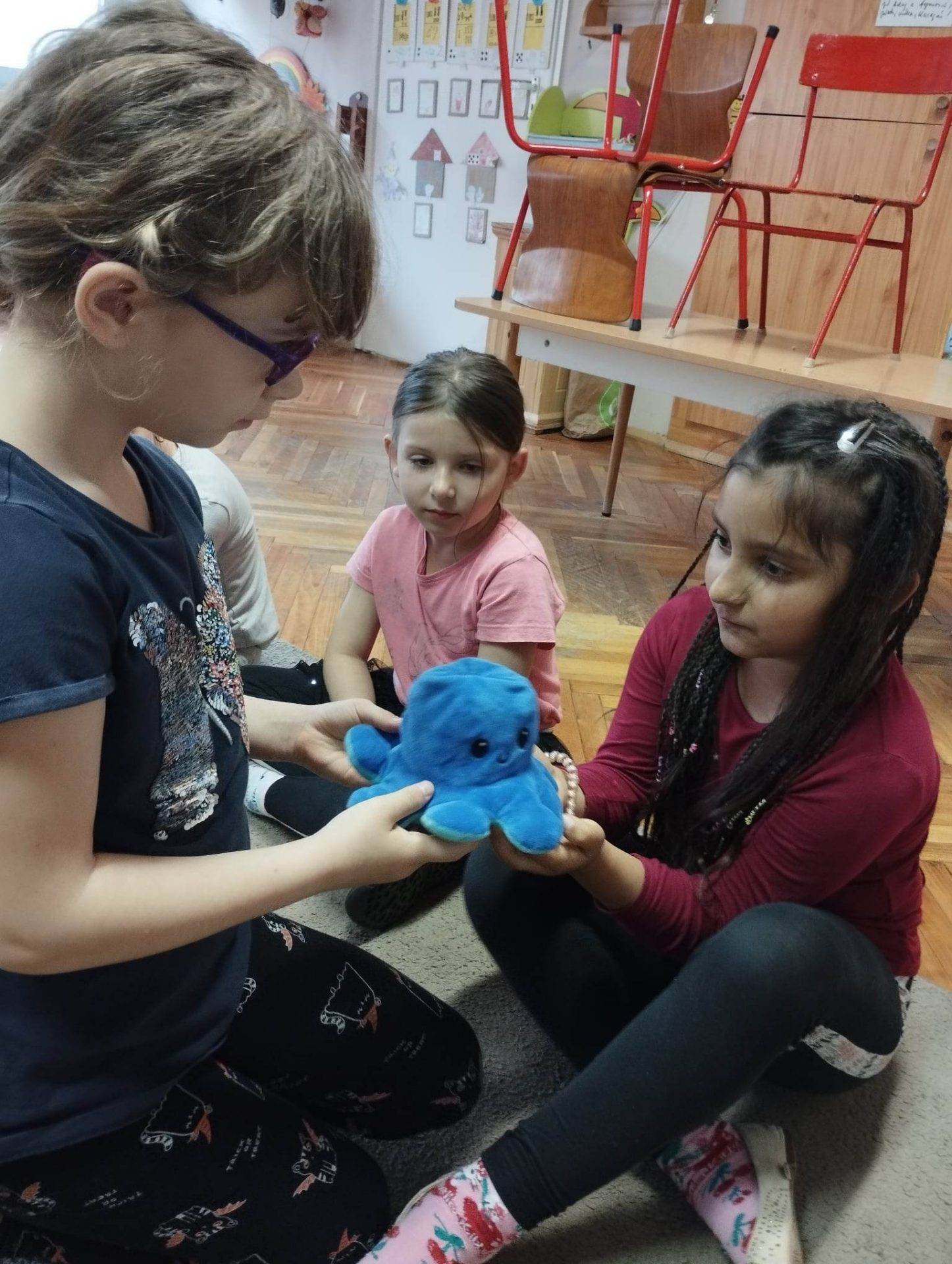 Bocsánat állatot választottunk a plüss játékok közül: egy kék színű mesebeli polipot. A gyerekek egymásnak adták és őszintén elmondták,hogy ki kitől és miért kér bocsánatot. Ez a korosztály már képes felismerni, ha valamit rosszul csinál vagy megbántja társát.Jó volt látni és hallani az őszinte megnyilvánulásokat.