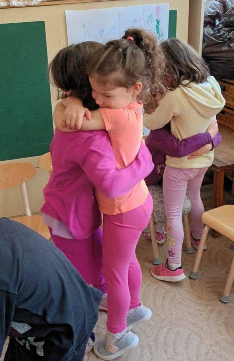 A foglalkozást a relaxációs játékkal kezdeményeztem (Repül a madár, szárnyalva száll), majd meghallgattuk a Ho’oponopono című Bagdi Bella dalt, ami nagyon tetszett a gyerekeknek, így lejátszottam még egyszer. Ezután Boldog Dóra érkezett hozzájuk, elmondta a Ha valakit megbántottál kezdetű versikét. Rövid beszélgetés kezdődött a megbocsátás témával kapcsolatban. A gyermekek történeteikben elmesélték, hogyan kértek bocsánatot attól, akit megbántottak. A következő játék ehhez kapcsolódott, elmondták, hogy az elmúlt napokban a csoportban kit, miért bántottak meg, és most szeretnének bocsánatot kérni. Mindenkinek lehetősége nyílt erre. Közben láttunk sok példát a bocsánatkérésre (ölelés, simogatás, dicséret, puszi, kézfogás, apró ajándék átadása, ígéret, stb.). Majd elmeséltem nekik Bezzeg Andrea: Tündéri bocsánat című meséjét. A mese után erről is beszélgettünk. Majd elmondhatták, hogy őket ki, hogyan bántotta meg, majd elmondták, hogy „de már bocsánatot kért, és én megbocsátottam neki”, valamint „egyébként azért szeretem őt, mert sokat legózunk együtt”, „szeretek a barátja lenni, mert kedves velem”. A következő rövid történet után (Ho’oponopono), el is játszottuk. Többször elismételtük ezt a varázsszót, megbeszéltük miket jelent. A gyermekek nagyon élvezték (még napokkal később is emlegették, ha megbántották egymást). A foglalkozás végén mindenki kiegészíthette a rajzot (Hogy érzed magad, amikor megbocsátanak neked? Hogy érzed magad, amikor megbocsátasz valakinek?), majd készítettek varázskártyákat, amiket megbeszéltünk, hogy kinek miről szól, melyik varázsszóról, majd hazavitték. Öröm volt látni, hogy milyen sokféle varázskártyák születtek (szív, ölelés, tea, virág, stb.). Legvégül a kiszínezett jelüket felragasztották a váruk következő lépcsőfokára.