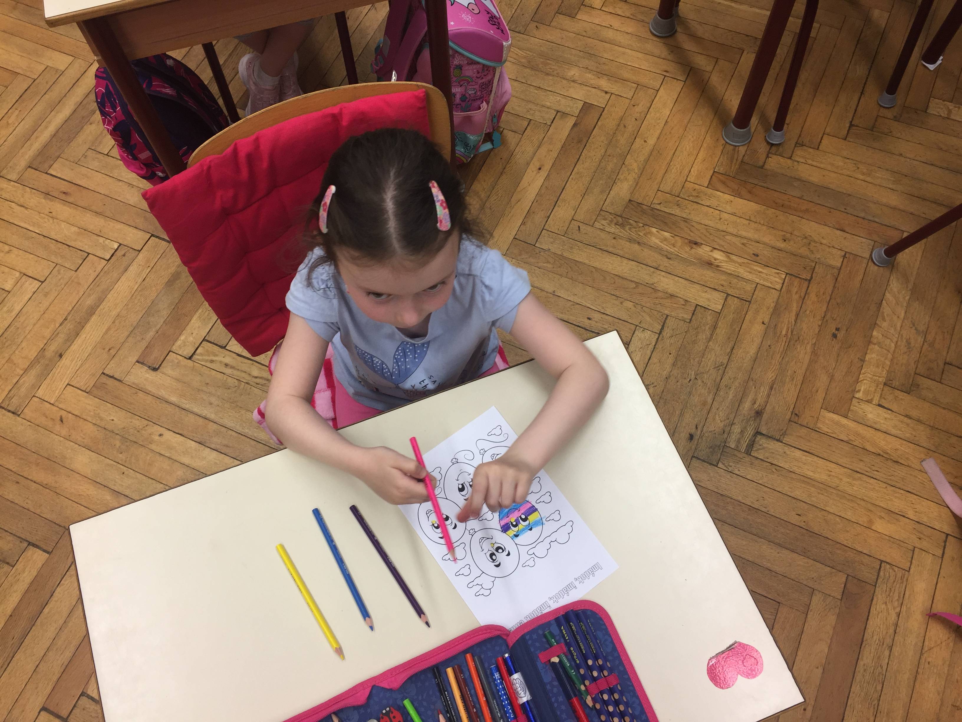 Csoportokban elkészítették a boldog abécét a gyermekek. Közben elkészítettük az osztály közös rajzát. A foglalkozás alatt bárki, bármikor rajzolhatott a papírra, de mindenki csak egy-egy vonalat, elemet rajzolhatott csak hozzá. A hónap dala hallgatás közben pedig készültek a szebbnél szebb színezők is.