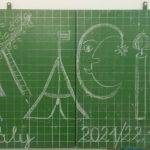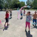 Az iskola udvarán „mesekertet” is készítettünk, vagyis rajz órán az aszfaltra a tanév legkedvesebb történéseit pingálták, színezték a gyerekek, aminek eredménye egy színes figurákkal díszített felület lett a bejárati részen.