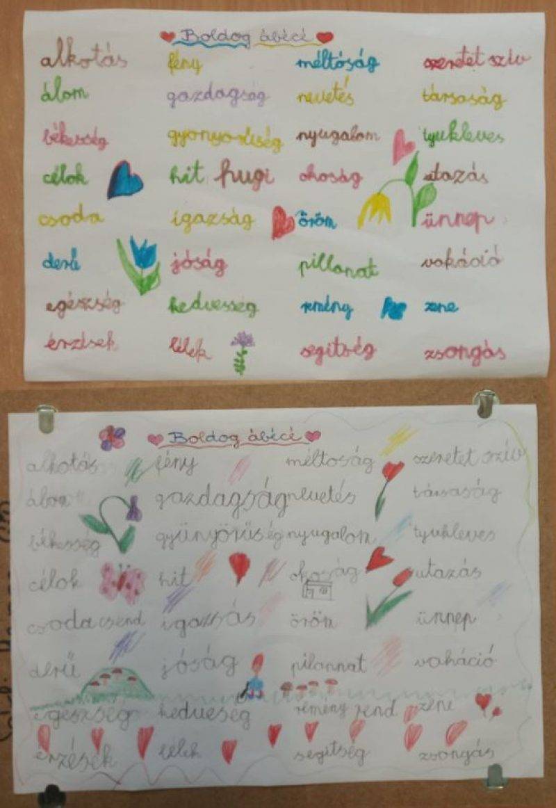 Június a fenntartható boldogság hónapja. Nyakunkon a tanév végi felmérésekkel és zárásokkal, értékelésekkel bizony nehéz volt a boldogságra, kikapcsolódásra koncentrálni, de azt gondolom, nekünk mégis sikerült. Már szeptemberben elhatároztam, hogy elsőseimmel év végén elkészítjük a „boldog ábécé”-t. Az ötletet itt találtam a felületen, nagyon megtetszett. Egy A/4-es lapra az ábécé betűit írtam fel, amit fénymásolva minden gyermek megkapott. Közösen próbáltunk pozitív fogalmakat alkotni a kezdőbetűkkel, és meglepődésemre jobbnál-jobb ötletek születtek, amiket le is jegyeztünk a lapra, majd mindenki kedve szerint díszíthette irományát. Ezekben a fogalmakban rengeteg olyan érzés, gondolat, pozitivitás benne van, ami a fenntartható boldogsághoz szükséges. Nagy élmény volt látni, hallani, ahogy a gyerekek törték a fejüket, látszott rajtuk az akarás, az érdeklődés, a kreativitás.