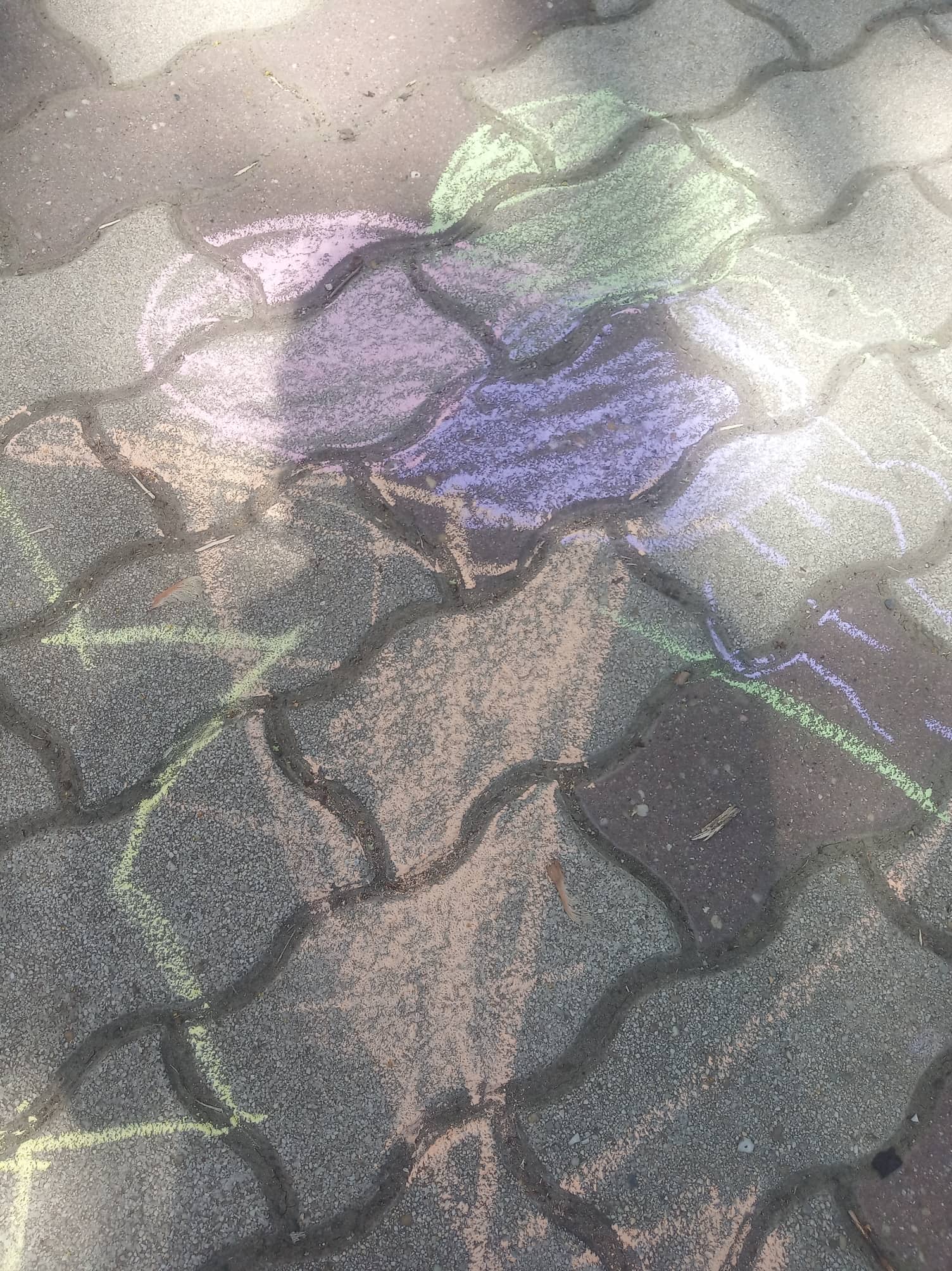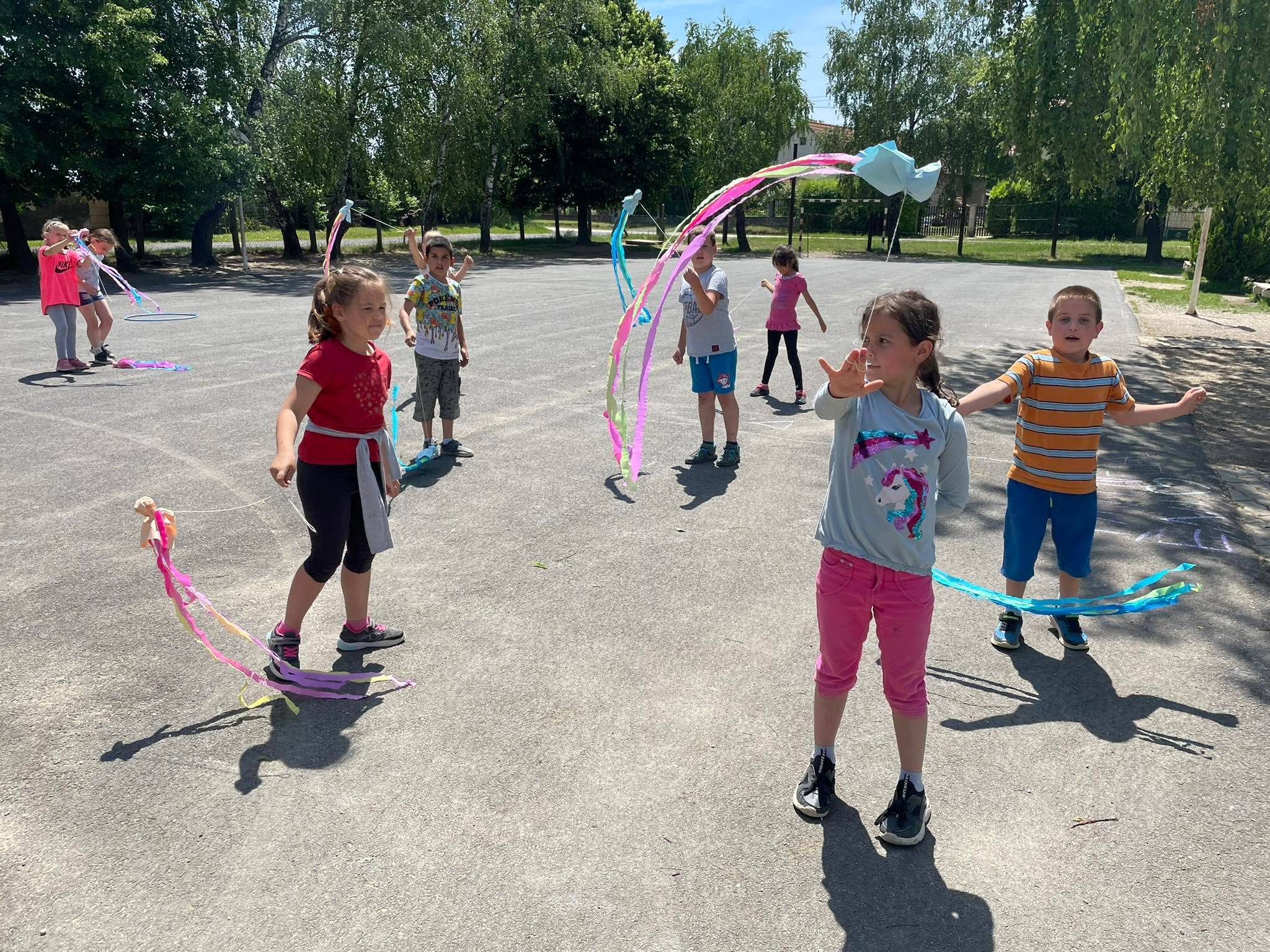 Az iskola udvarán „mesekertet” is készítettünk, vagyis rajz órán az aszfaltra a tanév legkedvesebb történéseit pingálták, színezték a gyerekek, aminek eredménye egy színes figurákkal díszített felület lett a bejárati részen.