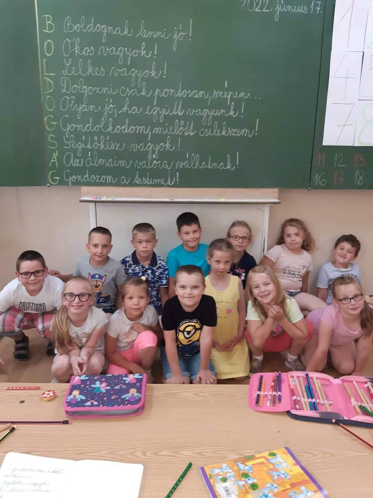 Ilyen és ehhez hasonló mondatok hangzottak el a tanító nénitől. Boldogsághoz kapcsolódó szavakat mondtuk, majd a boldogság szó kezdőbetűire fogalmaztunk meg mondatokat. Elkészítettük a boldogságkoktélt, melybe különböző dolgokat kevertünk-öröm, játék, barát, szeretet-majd ezt meg is magyaráztuk.