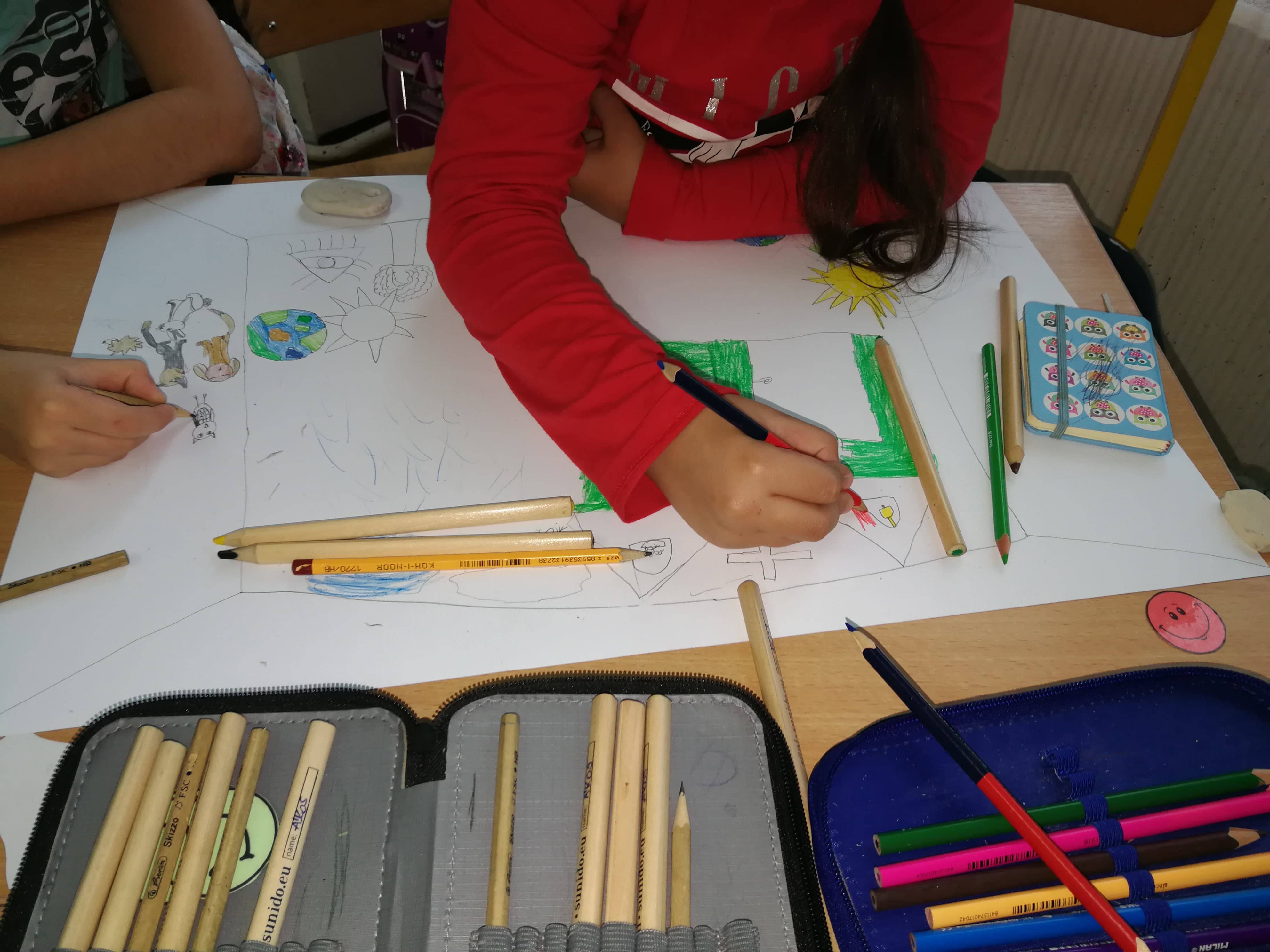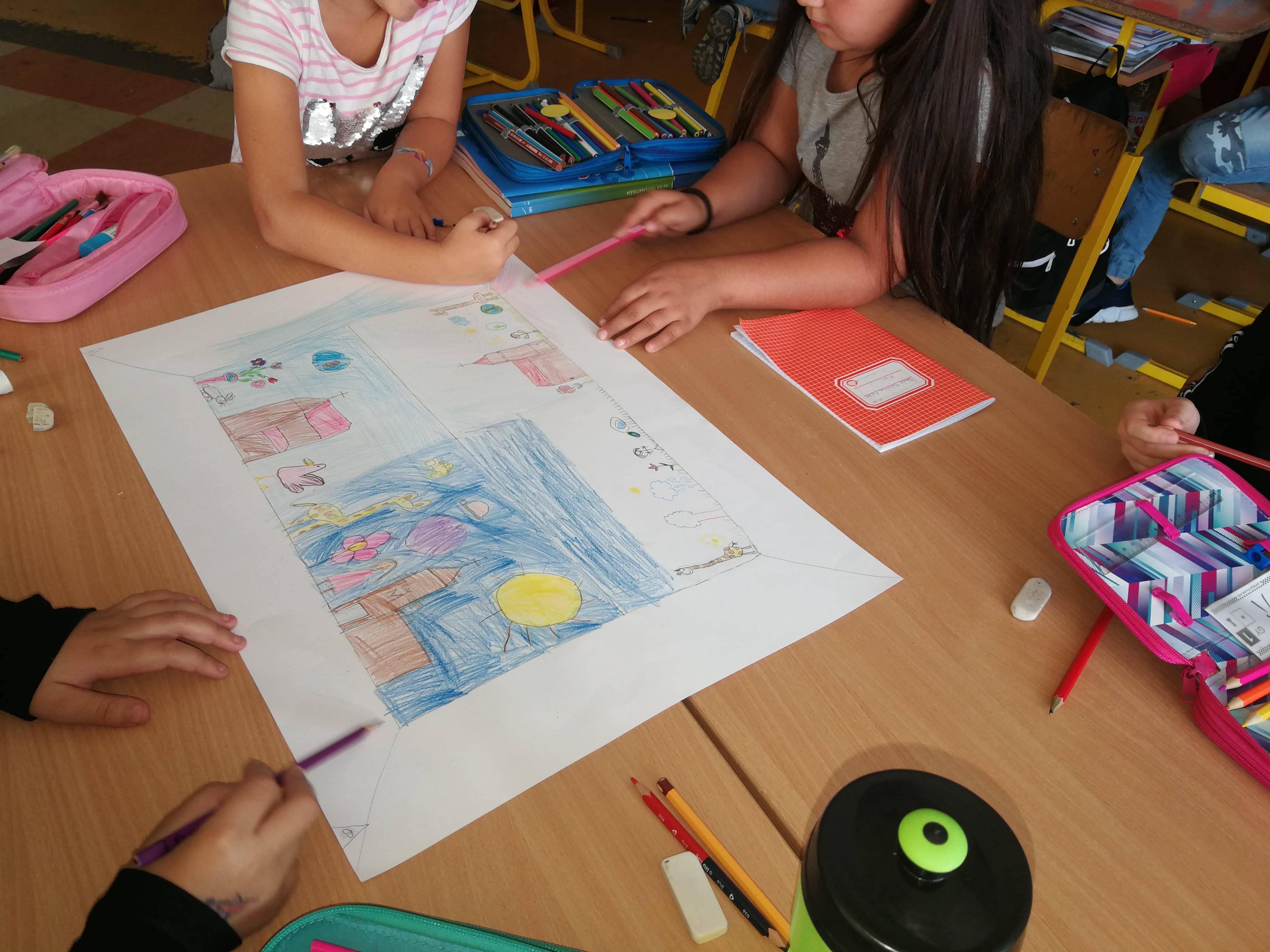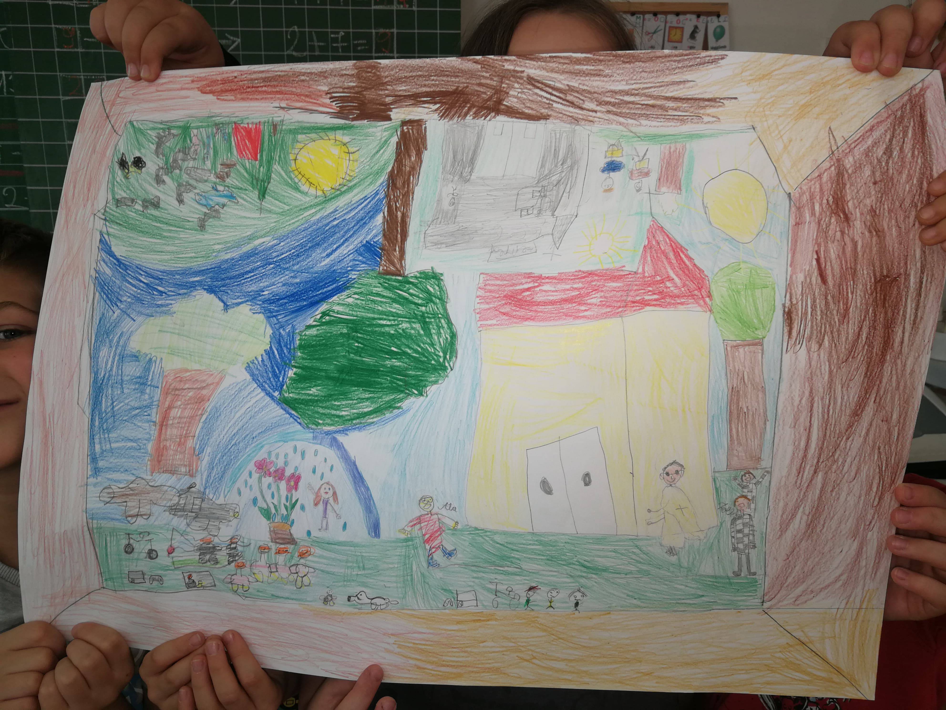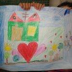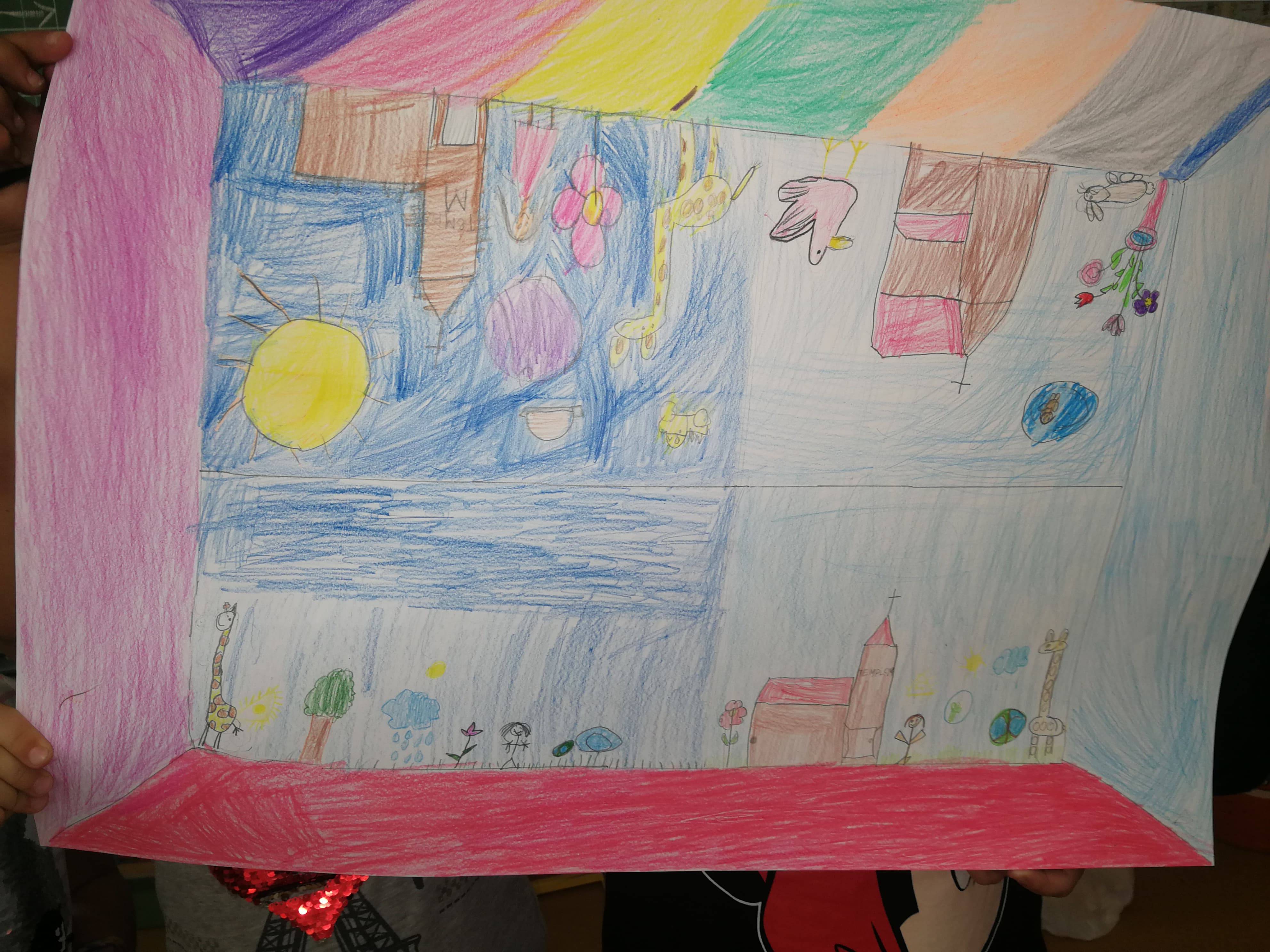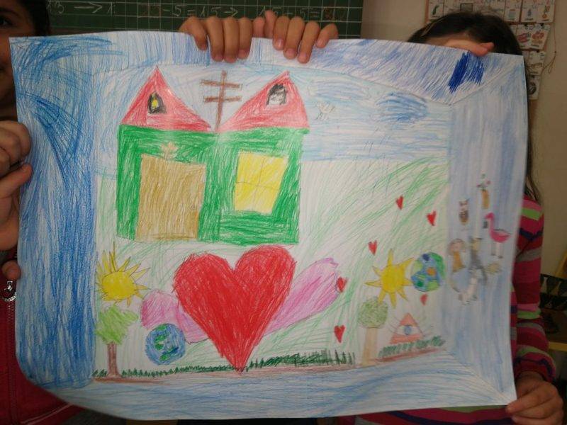 A 2.a – ban először hálafát készítettünk, majd kinéztünk az ablakon és ami eszünkbe jutott azt megfogalmaztuk, lerajzolták csoportmunkában. Élvezettel hallgattam a gyerekek „csiripelését” miközbennrajzoltak. Mindenki ki is mondta mit fog lerajzolni. Intézményünk sajátossága, hogy a közvetlen szomszédságában egy római katolikus templom áll. Így szinte mindegyik csoport képén megjelenik a templom, „Isten háza”, ahol a legtöbb család vasárnaponként hálát ad az életért, szeretetért, egészségért, békéért, „békét adj szívünknek, békét családunknak, békét nemzetünknek, békét a világnak”. Ahogy tovább gördítettük a fonalat az ablakon kitekintve egyre csak egyre jöttek a szavak, mondatok, ki miért hálás: szüleinkért, földünkért, a levegőért, a fákétr, virágokért állatokért, …… és végül, de nem utolsó sorban önmagunkért.